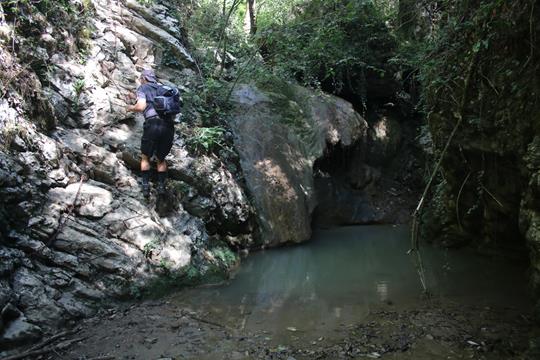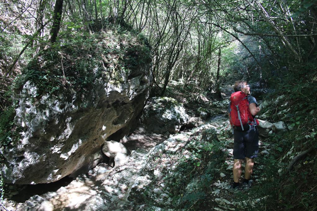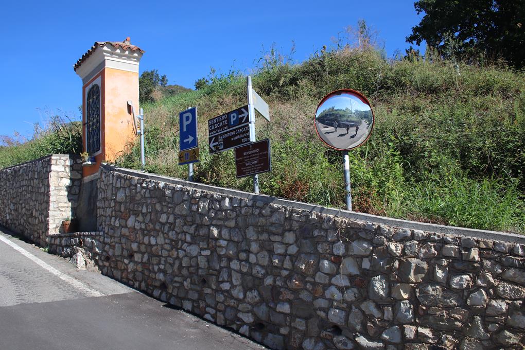 Gleich daneben werden Weintrauben angebaut, Ein Landwirt Arbeitet in der Nähe verkneife mir die Roten Früchte zu Testen. Hinter der Steinmauer wird ein Feuer entfacht ein Älteres Ehepaar Arbeitet im Garten. Ein Tagesrucksack ist schnell gepackt. Ca. 2 ¼ Stunden Gehzeit laut Angabe. Gut ausgeschildert der Weg zum Waterfalls Trail, Italienisch Sentiero Cascate. Vorbei an Schmucken Gebäuden führt der Zustieg Links ab. Oliven Bäume schmücken den Weg, wobei die Früchte sehr Hart und Bitter sind. Keine Menschenseele ist begegnet oder gesehen worden. Relativ eben führt ein Weg in ein verengendes Tal. Links unten ist ein Bachbett erkennbar. Italiener wohl Unüberhörbar mühen sich leicht ansteigend mit 2 Kinderwagen über das Holprige Terrain, Bäume nehmen die Sonne. Dringen tiefer in die kühler werdende Schlucht vor. Die Wandfluchten eher Harmloser Natur, 2 Ehepaare mit Kinder sorgen für Umtrieb, sie sind ohne jegliches Gepäck, in diesem Moment ist klar das da nicht von Klettersteig die Rede sein. Wie ein Stalagmit schaut der Wasserfall aus, rechts daneben eine doch Steile Stahlleiter an der die Familien gerade nach Oben Turnen. Feucht der Boden wohl von diesem Unwetter das vor unserer Anreise nieder ging. Spärlich das Wasser das über den Fels fließt. Ein Schild weist auf Schwierigkeiten hin von Experti ist die hier die Rede. Bodo kraxelt die Stahlleitet nach Oben, sind sicherlich gespannt was da die Begeher erwartet. Die Italiener recht Lebhaft, es folgt eine Gehpassage es scheint einen ausgeprägten Weg zu geben am besten dem Bachbett folgen wobei das Wasser wohl Unterirdisch fließt. Wir steigen aus dem Bachbett aus, die Italiener folgen, nach wenigen Metern drehen wir um, es scheint tatsächlich unterhalb zu folgen.
