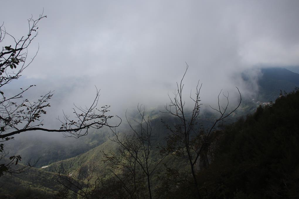 Die Stimmung ist gelöst ja einem jeden steht ist die Gute Laune anzusehen, sind uns einig das war unerwartet und über jeglicher Erwartung. Der Wind bläst die Wolken die von Süden kommen auseinander. Was gibt es besseres als einen Gipfel Apfel. Humprey lässt seine Wasserflasche Rundum gehen. Etliche Fotos halten diese Momente fest, turnen dabei auf dem Stahlgerüst des Gipfelkreu mittels Selbstauslöser verbleiben 10 Sekunden es gelingt rechtzeitig postiert zu sein. Als die Italiener kommen umarmt er seine Pummelige Freundin, wohl ihr Meisterwerk am Felsen. Die Frage ob ich sie Fotografieren kann, wird gerne nachgegangen. 14.35 Uhr, der Abstieg steht an. Anfangs ein Stück Südöstlich über bewachsene Felsen, auch mit Armeinsatz. Übergang in den Wald wobei die Bäume nicht allzu hoch sind. Einige Stellen sind mit Ketten und auch Leitern gesichert. Die Sicht nach Unten fehlt auch beim Abstieg. Flott wird Höhe abgegeben. Die Bäume und Pflanzen sind sehr Robust angepasst des Klimas. An einer Quelle wird der Wanderweg zum Rifugio di Lupi erreicht. Es quert längere Zeit am Berg in Westlichlicher Richtung. Im Süden lösst sich das Wolkenbild auf. In der Sonne geschützt vom Wind ist es absolut angenehm. Räume viele Steine vom Weg die den Hang abwärtsrollen. Hier ist der Wald Herbstlich Bunt eingefärbt. Der Klettergarten „Settore Streching“ mit Info Tafel auf die Routen wird passiert. Nach 30 Minuten wird der Abzweig zum Klettersteig passiert. 15.40 Uhr, zurück am Castello Regina mit seinem schönen Brunnen. Eine kleine Katze möchte schmusen, ein Karton mit Roten Früchten erweckt meine Neugier. Es sind Cherry Tomaten ein Versuch wohl wert, genau in diesem Moment kommt ein älterer Herr um die Ecke, er ist gar nicht Happy, ungeniert gebe ich eine Frucht in den Mund. Er schimpft ohne das ich auch nur ein Wort verstehe, es sind nur noch wenige Schritte bis zum Fahrzeug es ist 15.40 Uhr. Das T-Shirt wird in der Sonne zum Trocknen platziert. Die Pause wird zum Essen und Relaxen bei 15 °C genützt. Die Getränke gehen aus. Olaf gibt das nächste Ziel ein Monticelli Brusatti 75 Km Fahrzeit 1.40 Stunden.
