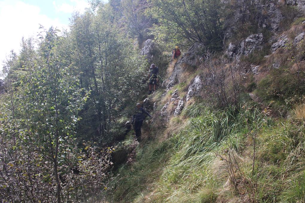 Olaf gibt das neue Ziel ein, Cavaglia das Gerät zeigt 22 Km an. Mit einem Gracia zur Verabschiedung wird die Tour fortgesetzt. San Pellegrino wird nun umfahren. Die Temperatur liegt bei 17,5 °C. Der Diesel deutlich Billiger, der Liter im einst so Teuren Italien kostet 1,80 €. Sehr viel Verkehr auf den Straßen. Es geht rechts ab in das Valle Brambila Nördlich bis zum gleichnamigen Ort, Von dort in vielen Kehren und Kurven werden wir richtig durchgeschüttelt. Etwas Östlich führt die schmale Teerstraße nach Cavaglia (835 m). Auf einer Anhöhe befinden sich mehrere Häuser und eine Kapelle. Auffällig Ruhig ist es hier. Ein Parkplatz findet sich. Durch die Höhe ist es nur noch 12,5 °C Warm ein Mix aus Sonne und Wolken ein leichter Wind weht. Es ist 12 Uhr geworden. Ein Arbeitet turnt auf einem 4-Stöckigen Primitiven Gerüst das er am Fensterrahmen gesichert hat. Ein kleiner Neugieriger Hund Mustert uns. Informiere die Jungs mit wenigen Worten über den Klettersteig „Madonnina del Coren“ die Schwierigkeit liegt bei C. Gehzeit ca. 3 Std. am besten etwas zum Essen und Trinken mitnehmen. Relativ Gelassen aber Flott ist das kleine Gepäck im Tagesrucksack untergebracht, der Klettergurt wohl das Schwerste Utensil. Zwischen den Typischen Naturstein Gebäuden versuchen wir eine Weg Tafel zu finden. Eine Große Übersicht über die nähere Umgebung in diesem Tal finden sich dann auch. In einem schön gerichtet Hof. Durch den Wald erfolgt der Zustieg zu einer Hütte und dem Klettersteig der auf den Corna Camoscera 1353 m, führt. Nordöstlich steigt es mäßig an. Wegteilung Rif. Brambalina rechts. Erdig und Steinig der Untergrund absolut Trocken, obwohl diese Woche laut Olaf ein heftiges Unwetter durchgezogen ist. Aufstieg im Schatten dieser Sonderbaren Bäume die in Gruppen gedeihen. Wie es den Anschein hat wird hier kein Holz geschlagen auch die herabfallenden Äst liegen am Boden Pilze gedeihen prächtig. Ein Hauch von Herbst unverkennbar. Beim Gehen ist es sehr angenehm. Wegteilung zur Sentiore Attrezzato links. Ab und zu öffnet sich der Blick in die umliegenden Berge die auch über die 2000 m Marke reichen, noch lockern die Wolken nicht auf. Kurzer Halt könnte ja sein das Bodo und Humprey hier die Falsche Richtung einschlagen. Etwas steiler steigt es bis zum Berg auf einem schmalen Pfad an, der kurz vor 13 Uhr, direkt am Fels endet.