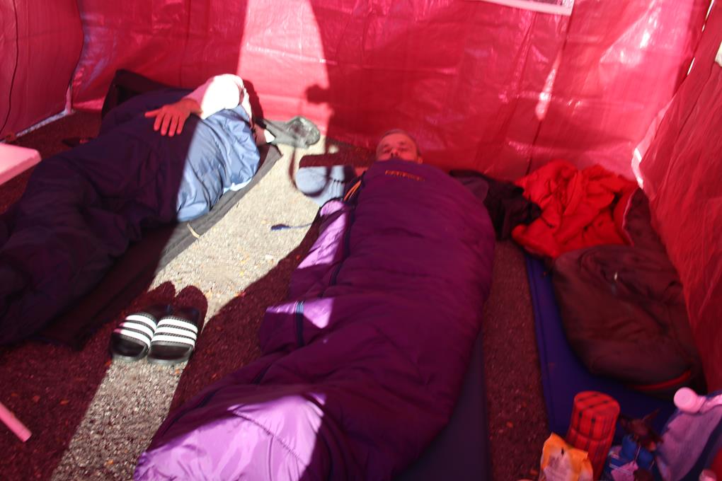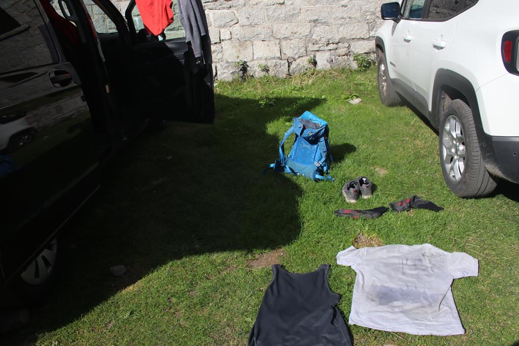 Dienstag 20.September:Sehr Früh wird der Schlaf wohl von einem Fahrzeug gestört, es ist 6.30 Uhr, die Container werden gelehrt, immer wieder heult der Motor auf. Tauche wieder komplett in den Schlafsack ein, die Isomatte ist wie üblich fast Luft los, die Isolier Wirkung dennoch ausreichend. Humprey Grüßt mit einem Hallo, es Bedarf reichlich Überwindung in die Kälte aufzustehen der Hauch der Atemluft beim ausatmen zeigt auf, das die Temperatur in der Nacht noch weiter gefallen ist . Es ist 8 Uhr geworden, die Anzeige im Auto Lausige 2 °C. Die erwärmenden Sonnenstrahlen erreichen wohl Gegenüber denn Berg, davon sind wir hier noch weit entfernt. Hose und die Fleece Jacke befinden sich in der Schlafsack Hülle. Das Kehren hatte sich gelohnt, nicht nur die Isomatten sind Sauber geblieben. Olaf verräumt das Kochgeschirr, er wird es zuhause Reinigen.