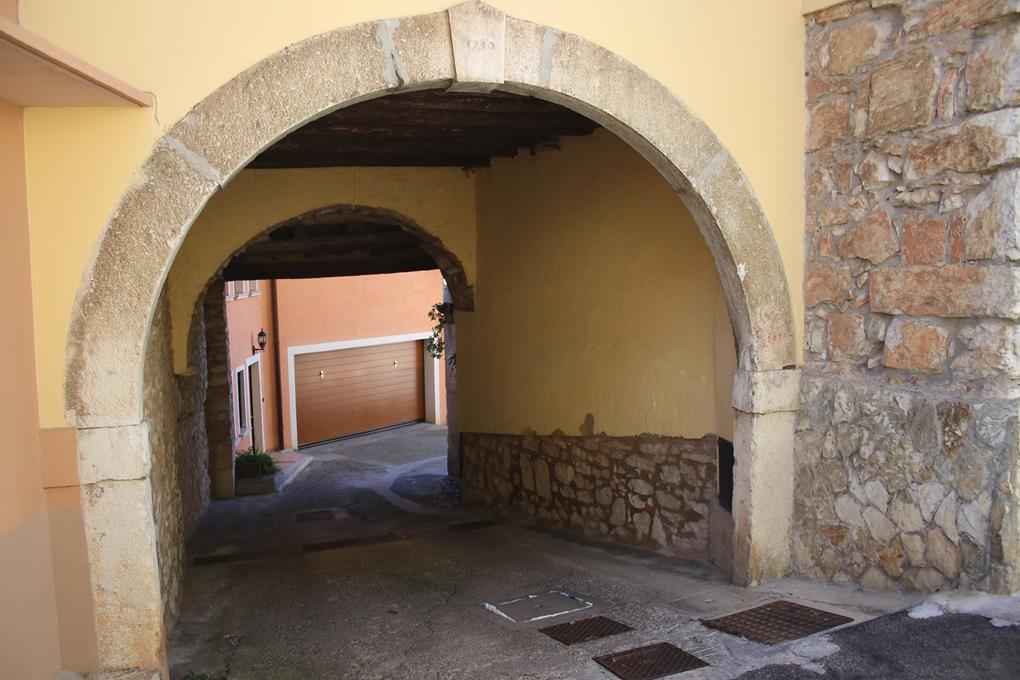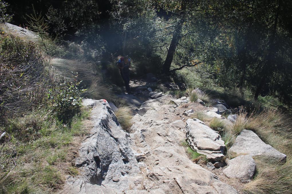 und das bei der Herbsttour. Ein Netter Humpen des Flüssigen Gold, es gibt sicherlich bessere Biere, doch das Momentum besticht. Bodo übermittelt Bilder in die Whattsapp Berg Gruppe. Mauri meldet sich sofort, ja er wollte uns diese Tage begleiten. Bei den Bildern bereut er wohl die Entscheidung über die Absage. Das T-Shirt und die Socken trocknen zügig in der mittags Sonne. Es ist schon 13 Uhr, Olaf und Humprey bestellen ein zweites Bier, die Tochter schenkt richtig gut ein. Bodo ordert in der Gaststube beim Chef, der wohl Übung besitzt exakt bis zum Eichstrich einzuschenken. Es lässt sich gut Leben bei Angenehmer Unterhaltung. Wanderer passieren, weitere Tages Gäste besuchen die Lokalität. Zeit für ein Vesper, Weißbrot Leberkäse Paprika mundet. Olaf findet Gefallen an der Hundemarke knipst ein Bild. Übernehme die Rechnung von 40 € pro Bier nen Fünfer. 13.50 Uhr, Zeit zur Fortsetzung (wenn es am schönsten ist sollte man gehen) der Tagestour. Etliche Häuser scheinen Bewohnt zu sein die Gärten gerichtet (1933 Lebten hier 500 Menschen, heute sind es noch 10 und das auch nur im Sommer. Die zweite Lokalität „Osteria Alpina“ ist angeschrieben, liegt etwas versetzt, von hier nicht sichtbar. Nach wenigen Minuten geht es rechts ab zu einer Steinbrücke. Wir befinden uns auf 825 m. Tief unten stürzt ein Bach bestimmt 100 Meter in die Tiefe. Eine zweite Schlucht weniger Spektakuläre. Längere Zeit quert es in Südlicher Richtung im Schatten von Bäumen. Bewusst wurde hier ein fast ebener Höhenweg auch mit Sprengarbeiten für den Bergbau. Sobald es ausgesetzt ist finden sich Sicherungen, heute sind es Wanderer die davon profitieren.