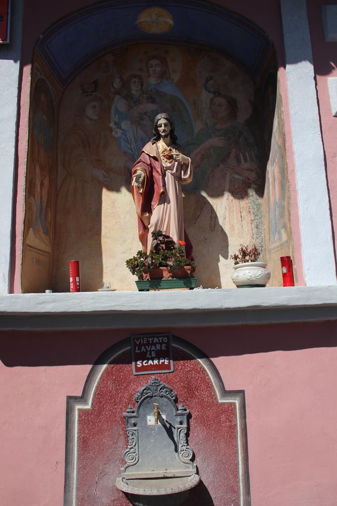Ein kurzer Stopp im Schatten, gewaltig der Druck auf der Leitung. Genau gegenüber im Süden liegt der etwas größere Ort St.Giorgio. Der Blick in das Val Codera öffnet sich vom tiefsten bis zum Höchsten Punkt sind es schier unglaublich 3100 m, es könnte auch als Schlucht bezeichnet werden, fast auf einer Höhe verläuft der Wanderweg der Früher auch als Transportweg für den Bergbau diente. In einer Links Kehre Teils überdacht als Schutz vor Steinschlag. Was da an Material und Kraftaufwand betrieben wurde zollt Respekt. Was vorher so Entfernt vermutet wurde ist in wenigen Minuten zurückgelegt, Humprey und Bodo Trollen ein wenig, fallen zurück. Kurz vor dem Ort zwingt eine Kapelle mit Friedhof für einen Halt, ein Beschaulicher Friedlicher Ort Etliche Menschen haben hier ihren Ewigen Frieden gefunden. Ein kurzer Aufstieg Codera ist erreicht. 2 Männer sitzen auf einer Bank Unterhalten sich. Genau gegenüber des Größten Bauwerks der Kirche, das Rifugio La Laconda, auch hier scheint die Zeit ist Stehengeblieben der Ort ein Großes Freilichtmuseum, der aus Natursteinen sehr Angepasst wirkt. Welch Ruhe und Abgeschiedenheit. Ein Deutsches Paar hält sich im Schatten vor der Gaststätte an einem Tisch auf. Der erste Weg in das innere, In der Küche wird gerade gearbeitet, wohl der Chef der mich Grüßt, Es duftet nach Essen da hat wohl jemand etwas bestellt? scheint alles Saniert worden zu sein. Ein Mix aus kleinen und größeren Holztischen eng platziert, es gibt wohl Tage mit hoher Besucher Zahl. Zweckmäßig die Ausstattung, ein offener Kamin sorgt für Behaglichkeit für die Kalten Tagen. Dosen und Flaschen stehen in einem Regal.