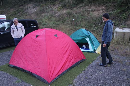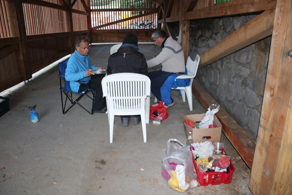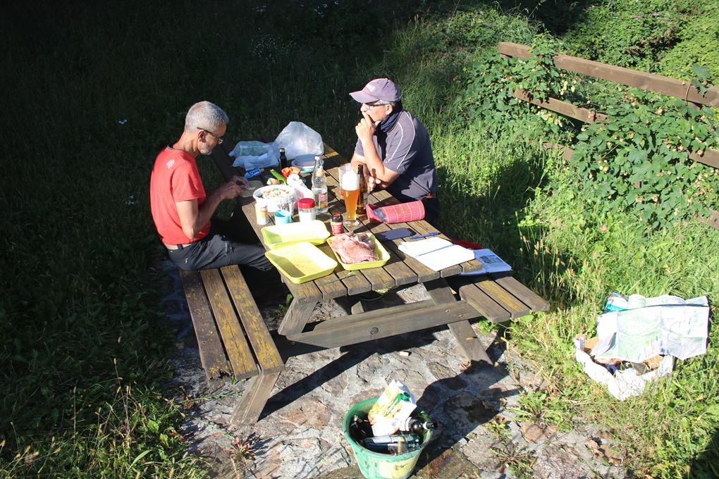 Samstag 17.September: Lang anhaltend erhellen Blitz und Donner in der Nacht den Himmel, das sollte es gewesen sein mit dem Sommer. Nur wenige Tropfen Regen fallen vom Himmel. Die Biere Treiben inmitten der Nacht zum Pinkeln das Zelt verlassen. Interessant die Feststellung das das Himmelszelt leicht geöffnet ist, etliche Sterne am Firmament. Als Humprey den Reißverschluss öffnet ist der Schlaf definitiv zu Ende. Stahlblau der Himmel, da wir am Osthang Campieren wird es noch etliche Zeit benötigen bis die Sonne das Tal erreicht. Der Schlaf wie gewöhnlich unruhig. Das Zelt ist Feucht. In 3 Std. könnte Niederschlag fallen. Die Temperatur ist natürlich gefallen, die Höchsttemperatur liegt heute bei 20 °C. Die nächsten Tage bleibt es Beständig. Die Camper in ihren Fahrzeugen sind deutlich im Vorteil, hier gilt es erstmal die Tische und Stühle ab zu Trocknen. 8.30 Uhr, Gegenüber auf der anderen Talseite am Hang erreicht die Sonne den Hang. Während Olaf Wasser abkocht, geht’s mit einem Kugelschreiber bewaffnet an den Bericht. Als der Wind einsetzt wird es noch kühler brrrr. Kaffee für die Jungs, der Koffein Verweigerer trinkt Kuhmilch mit Kakao. Brot Butter Honig Wurst Käse Rettich Tomaten und mehr findet sich auf dem Frühstückstisch. Humprey und mir geht das Brot aus doch die anderen helfen gerne aus. Es ist 10 Uhr, als die Sonne den Platz erreicht. Wichtig ist es die Schlafsäcke Isomatten und Zelte in der Sonne zu Trocknen. Was gestern gar nicht aufgefallen etwas tiefer am Sträßchen ist ein Spielplatz mit einer Bude, an dem es aus dem Automaten Getränke gibt, hier hält sich gerade der Chef auf, wie es scheint führt hier ein Radweg vorbei, wohl auch für diese die Versorgungsstation. Mehrmals das Zelt wenden wird auch auf den Kopf gestellt. Die Temperatur steigt bereits nach 10 Uhr, meldet der Wetterbericht keinen Regen mehr für den heutigen Tag, Hurra! Der Nordwind hält die Fette Wolken Front, die Südlich hängt, tatsächlich davon ab in die Berge abzuziehen. Die Berge wohl als Wettergrenze. Olaf fleißig wie er nun mal ist, spült nebenbei ab, ja er kümmerst sich um den Haushalt. Ein Fahrzeug fährt vor, wir müssen den Platz zum Trocknen des Equipments wechseln. Der Abbau und aufräumen geht dann sehr Flott. Bezahle beim Chef die Rechnung er verlangt von uns 20 € das ist absolut Preiswert. Die Schranke steht nun offen.