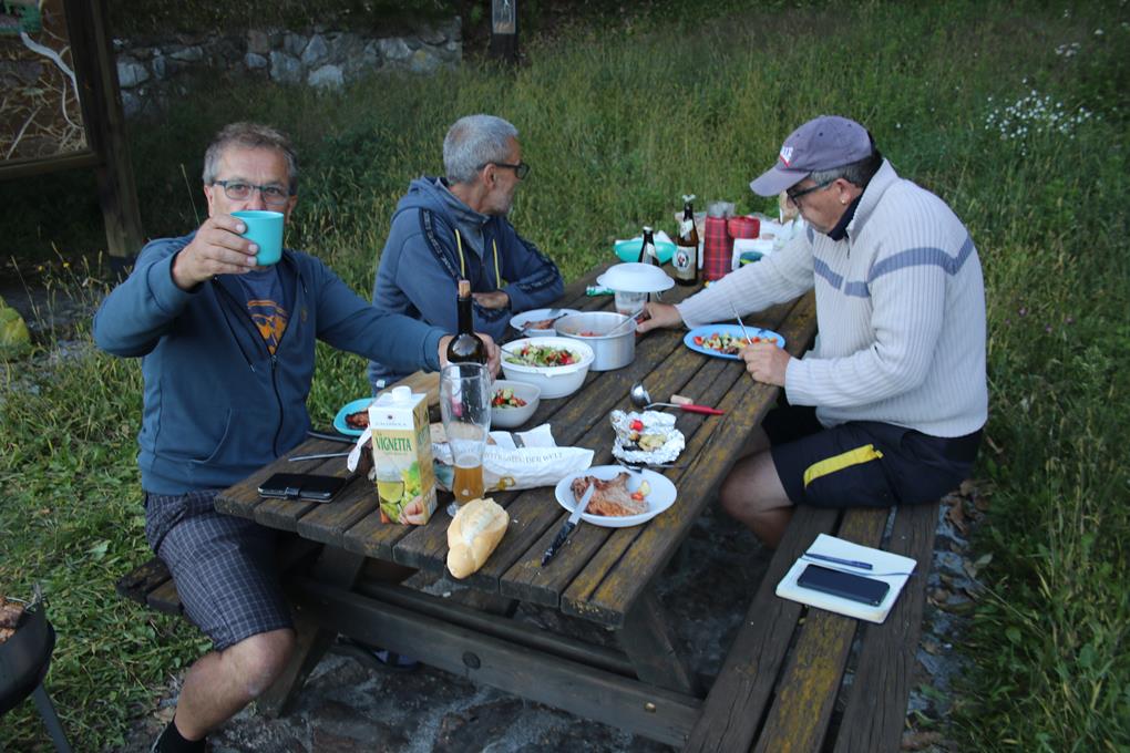 Erstmal die Lage Peilen. Liegt doch die Anlage Einsehbar. Ein kleines Gebäude mit einem überdachten Bereich. Stühle und Tische, eine Etage tiefer sogar fließend Wasser hinter dem Gebäude. Künstler Herz was willst du mehr. Es herrscht Freudige Einigkeit. Vorsorglich wird das Quarttier zum Abend bezogen. Erstmal wird der Rastplatz mit seinen Holztischen und Bänken zum Essen genützt, unter einem überdachten Info Platz gibt es Wissenswertes über Fauna und Flora des Adamello National Park, hier wird das Utensil zum Kochen abgestellt. Grillen ist angesagt. Ein Eimer findet sich an diesem Lagerplatz für eine Straßenbaustelle die etwas Oberhalbbefindet. Kalt das Leitungswasser bestens geeignet zum kühlen der Getränke. Olaf richtet das Fleisch tüncht es in Rot und Weißwein. Bodo und Humprey nehmen sich dem Reinigen und Schneiden des Salates an. Noch liegt dieser Platz in der Sonne, gelegentlich fährt ein Fahrzeug vorbei Deutlich lauter die Bergauf fahrenden. Finde in der Kompass Wanderkarte den Klettersteig. Gute Sicht in die Berge Ringsum, nach Süden der Taleinschnitt. Das ist doch Hopfen der hier Wild etwas Oberhalb des kleinen Wasserlauf wächst, ja das wird bestätigt. Olaf zündet die Holzkohlen an. Die Sonne verlässt uns günstiger gelegen ist das Sportgelände das noch längere Zeit von den Strahlen erreicht wird. Der Bericht schreitet wie das Essen voran. Olaf hat den Grill bestens im Griff. Ein Franziskaner Weißbier nicht zu verachten. Schnell ist der Grill auf Temperatur. Geschälter Knobi wird in der Folie in die Glut gelegt. Der Geruch der Steaks die in der Hitze schnell durch sind deutet auf einen großen Hunger Hin, Weißbrot passt doch Perfekt dazu. Bodo bereitet Gemüse zu, das im Topf geschmorrt wird. Kleine Fliegen die gar nicht wahrgenommen werden, fühlen sich im Bier Glas so richtig wohl. 10 Kotelette werden tatsächlich gegessen auch der Gemischte Salat wird verspeist, wobei Humprey alles dafür gibt das nichts weggeworfen wird.