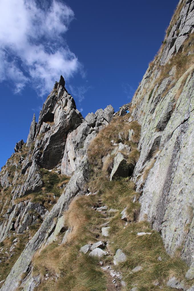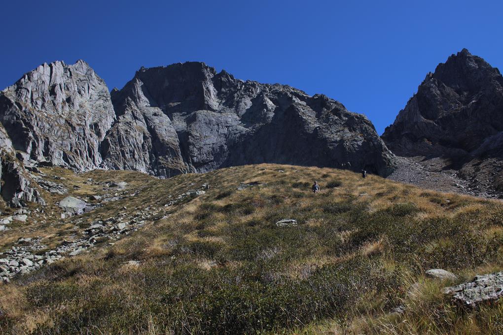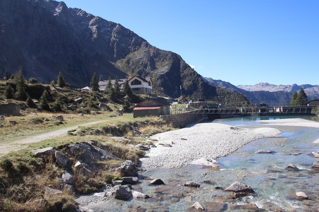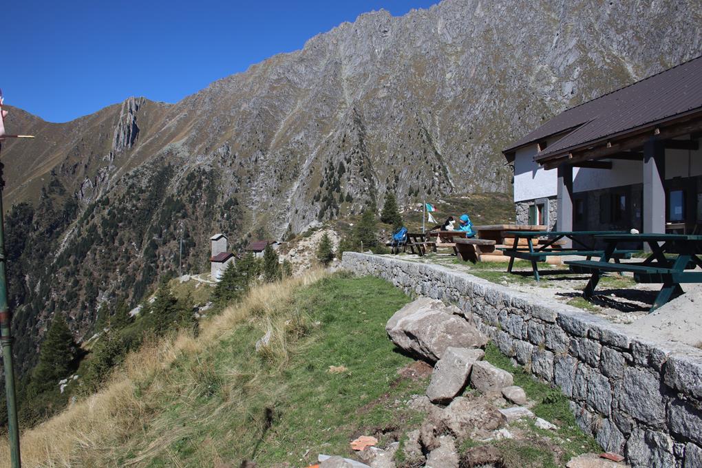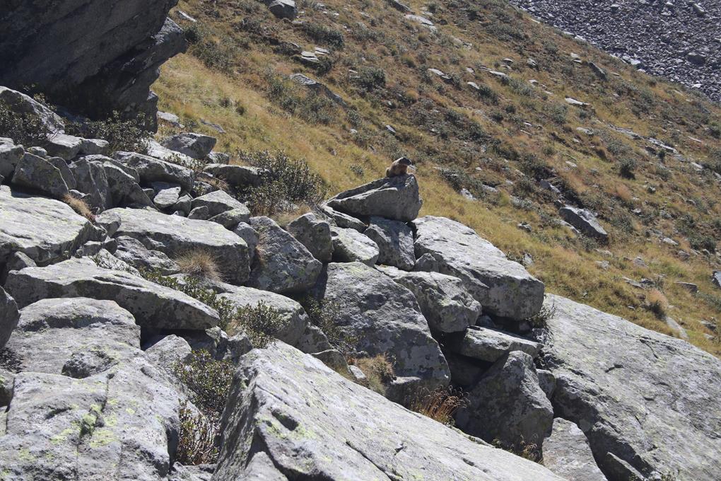 Auffällig die Massive wie große Transport Box. Nach einem Bogen wird klar warum die Box so groß ist. Hier ist ein kleiner Stausee mit Staumauer, wohl für die Strom Erzeugung über den Bedarf der Hütte hinaus. Die Hütte liegt gegenüber, wohl führt ein Weg über den Damm doch ein Zaun verhindert das betreten. Nach Osten ein langer fast ebener Taleinschnitt der auf der Höhe einer Alm endet. Im Hintergrund sind teile der Adamello Gruppe Sichtbar, Stahlblau der Himmel nur schade das es Herbst geworden ist, das Braun der Gräser und Temperatur zeigt dies deutlich auf. In einem Großen Bogen zuerst Östlich eine 3 Seilbrücke ist über das Wasser gespannt, diese darf aber nicht betreten werden. Das Vieh kann wohl nur über diesen Aufstieg auf und abgetrieben werden. Daher also die Kuhfladen im Aufstieg. Die Italienische Fahne weht im Kühlen Wind. Eine Frau bewegt sich Richtung Hütte. Kurz vor erreichen der Hütte berührt mich etwas am Bein, es ist ein Hund. Der Hund springt auf den Tisch an dem die Frau sitzt. Könnte die Chefin sein, die in Winterkleid an einem von vielen teils Massiven Tischen in der Sonne flaniert. Rifugio Citta di Lisone mt. 2020. Prangert an der Wand des aus Natur Stein gebauten Hauses. Unterhalb der Terrasse verlegen Arbeiter Rote Abwasser Rohre. Für eine Pause ist es fast zu kühl, ein Thermometer am Gebäude zeigt 4°C an. Am Nebengebäude befinden sich Wegtafeln darunter auch eine Routen Beschreibung des Klettersteig. Der Gratverlauf des Corno di Crevo in Südlicher Richtung ist gut zu sehen, wobei der Gipfel verdeckt ist. Gehzeit 2 Std. Deutlich Westlich die Scharte über diesen führt der Rückweg. Olaf etwas später Humprey danach Bodo erreichen die Hütte. Die wahrscheinlich gestern am Sonntag ihren letzten Bewirtschafteten Tag hatte. Nach einer kurzen Pause immerhin ist es schon 12 Uhr geworden. Ist es an der Zeit, Bodo bleibt zurück übergebe ihm den Zweitschlüssel. Just now legen die Arbeiter die Mittags Pause ein. Wohl in der Schutzhütte des CAI. Nach wenigen Minuten auf breitem Weg zweigt es Links Südlich auf den Wanderweg 24 ab. Sträucher Gräser die Baumgrenze ist schon überschritten. Einige Wegabscheider im Aufstieg von 300 Hm. Schnell ist der Körper auf Touren. Die Hütte ist nun nicht mehr sichtbar. Wegteilung Links zum Klettersteig halbrechts in die Scharte. Der Grat besticht es stellt sich die Frage wo ist der Einstieg. Humprey hat seine Mühe kann da nicht folgen. Über Steinblöcke die Wegfindung lässt sich erahnen, Steinmänner sehr Hilfreich. Eine Weiße Tafel an der Markanten Wand sehr Hilfreich, ein Wohlgenährtes Murmeltier zeigt sich mit einem schrillen Pfiff warnt er seine Artgenossen.