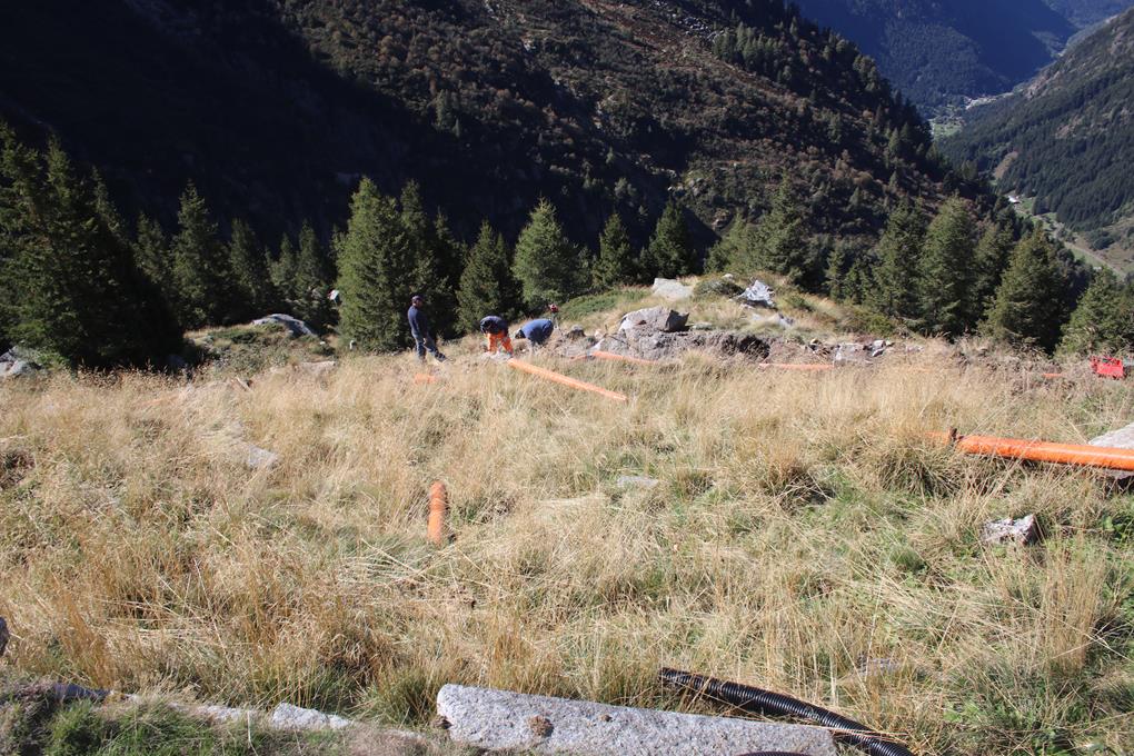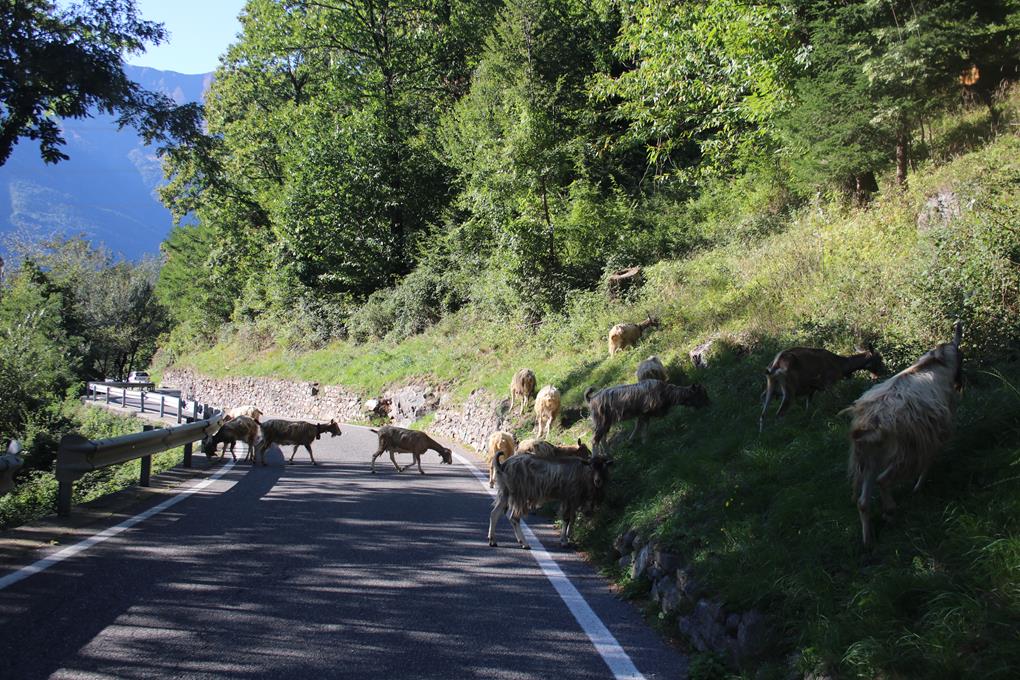 Ganz Angenehm im Windschatten in der Mittags Sonne. Eine Rampe führt zum Einstieg, lege mich um 13 Uhr, in das stachelige Gras in die Sonne. Olaf geht etwas höher, es war wohl Humprey der mich geweckt hatte. Die Rampe erfordert größere Schritte ja nicht in das Gras greifen, es ist leicht ausgesetzt. Olaf deutet auf ein Fels Loch mit 2 m Durchmesser. Toller Blick in die Berge im Osten, am Boden liegt doch tatsächlich Schnee. Kein Wunder auf 2300 m. Die Hütte ist von hier Sichtbar. So richtig Bock für den Klettersteig fehlt mir liegt es an der Uhrzeit? 2 ½ wird für den Aufstieg vorgegeben. Olaf wäre gewillt Humprey zaudert ein wenig. Schnell ist die Entscheidung getroffen, wir steigen Ab. Trotz Traumwetter ist es doch recht kühl. Wir steigen etwas ab für eine Vesperpause. Der Steig besser gesagt die Route schaut schon Beeindruckend aus. Als Olaf absteigt starten auch wir. Der Abstieg weniger Anstrengend doch ein jeder Tritt sollte auch in den losen Steinen gut gewählt werden. Der Ort Valle lässt sich am Hang über dem Tal gut erkennen überhaupt zieht sich das Tal Westlich hin, Herrlich Umrahmt von Bergen die fast an die 3000m Marke Grenzen. Allein schon wegen der Fernsicht hätte sich ein Aufstieg gelohnt, ja wenn und Aber es ist schneller als gedacht Herbst geworden, die Kaltluft hat auch die Alpenkette überschritten. Mehrere Gäste gut Bekleidet, halten sich vor der Hütte auf. Versorgt werden sie leider nicht, Bodo ist wohl schon Abgestiegen. Ein Spezial Bagger mit Teleskop Armen hebt im Gelände den Graben für den Abwasser Kanal aus. Es ist wohl das Hütten Ehepaar das gerade die Seil Brücke abbaut. Ja hier zu Übernachten hatte sich wie von selbst erledigt. Es ist kurz nach 15 Uhr als wir vielleicht nicht so richtig zufrieden den Rückweg antreten, ja die Zeit wäre sicherlich sehr knapp geworden. Olaf möchte gerne in der Nahen Zukunft diesen Steig gehen. Ein Pärchen befindet sich auch im Abstieg, fast schon übervorsichtig wird ein Fuß vor den anderen gestellt. Der Körper kommt auf Touren, das sogar das Fleece abgelegt wird. Ein kurzes Stück ist Steil und Kurvig, wohl die Schlüsselstelle für den Auf und Abtrieb der Rinder. Keine 40 Minuten nach Start ist das Auto erreicht die Heckklappe steht offen. Weitere Fahrzeuge Parken im Umkreis. Bodo lächelt als er uns sieht ist sogleich Überrascht, frägt Olaf in einem Ungläubigen Ton „schon zurück“ spontan Antwortet Olaf „ja wir waren sehr Flott Unterwegs“! Rucksack abstellen das Fleece Funktionshemd sowie T-Shirt in der Herbst Sonne Trocknen. Ein Mix aus Ananas Saft und Wasser für den Durst wie geschaffen. Bodo erwähnt das er erst vor kurzem eingetroffen ist. Hier wäre ein guter Platz zum Campieren satt Saftig und Grün das Gras, doch wissend das es in der Nacht auf dieser Höhe wohl Frost eintreten wird, ist es ein driftiger Grund um im Tal nach einer Schlafgelegenheit Ausschau zu halten. Als wäre nichts gewesen wird dieser Ort wieder verlassen Ziel ist Edolo das im Norden auf dem „Heimweg“ liegt. Auch auf der Rückfahrt muss das nicht so wendige Fahrzeug mehrmals in den Scharfen Kurven zurück gestoßen werden. Eine Schaf Herde behindert den Verkehr, wegen der Leitplanken fällt es ihnen schwer die Straße zu verlassen. Die Temperatur steigt Spürbar an, in Cedogolo das im Tal liegt, sind es angenehme 21°C. da kann man schon mal das Fenster ein wenig öffnen. Die Straßenverhältnisse ermöglichen Notizen im Tagebuch. Olaf stoppt fast schon Obligatorisch an einer Eisdiele. 2 Kugeln Eis in einer Waffel für 3.70 €, ganz schön heftig. Ein Super Markt in Edolo wird angesteuert. Humprey und Bodo dürfen sich beim Einkauf für das Abendessen Beweisen. Was wohl Zeitlich ganz gut gelingt. Folgen der SS 42. Eine Hinweis Tafel auf einen Picknick Platz, ist sicherlich ein Versuch wert. Doch dieser liegt direkt neben Wohn Gebäude. 18 Uhr, noch strahlt die Sonne die Bergkette an, doch über das Tal legt sich schon der Schatten. Das Typische Geduldsspiel. Der Ort Temü 1144 m, wird erreicht. Eine Talstation mit großem Parkplatz, könnte geeignet sein.