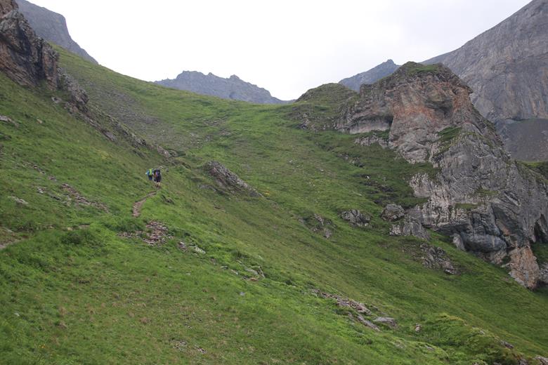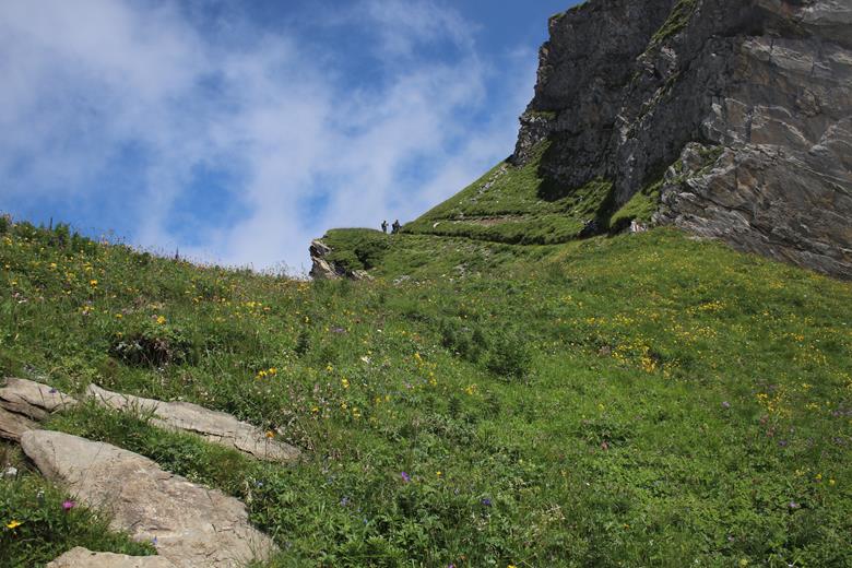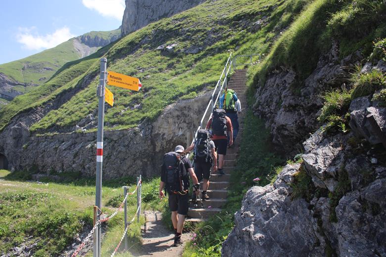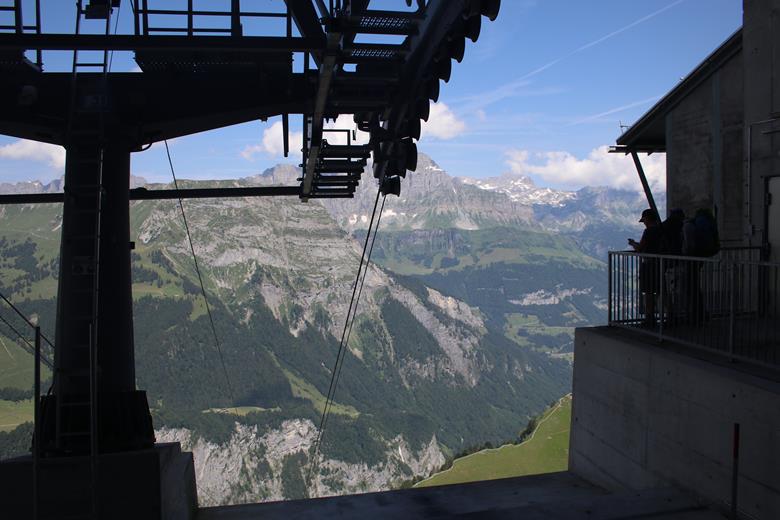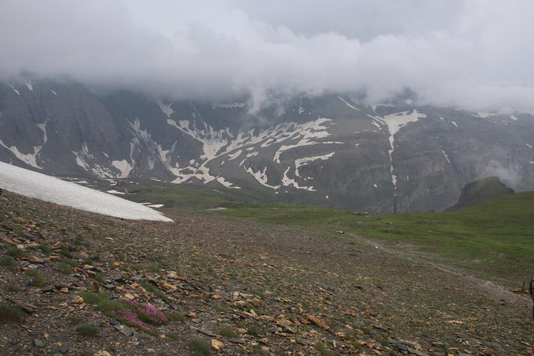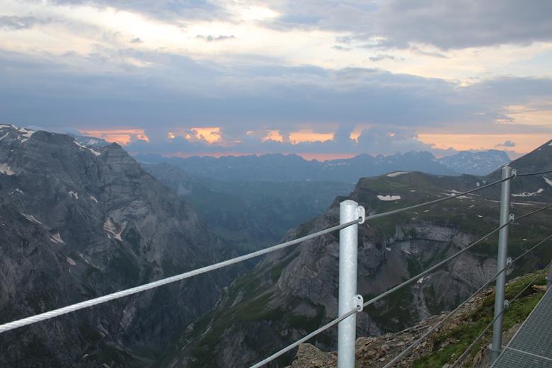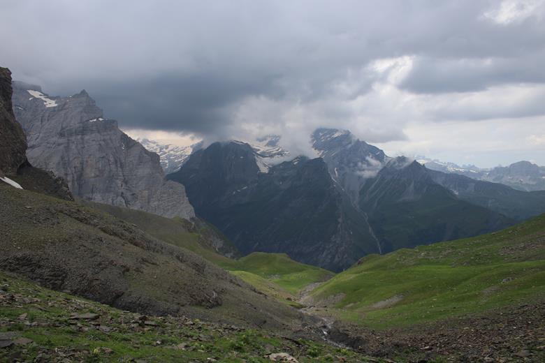 Gut zu sehen der Wegverlauf im Grünen Hang zum Vorderen Nüschenegg, doch jetzt gilt es erstmal in einem Bogen in das Nüschentäli abzusteigen. Teils in Serpentinen geht es an einen Markanten Punkt zum Muttenwändli, eine größere Gruppe müht sich im Aufstieg, während es im Abstieg wenig Anstrengend verläuft. Eine gute teils auch breite Wegführe leitet durch das steil abfallende Muttenwändli, die letzten Meter davon sind gesichert. Kurzer Abstieg im Schotter bis zum Bach, diesen querend, der Schnee ist Sichtbar gewichen. Einige Personen begegnen auf einem fast gleichmäßig Fallenden Gelände. Die Temperatur steigt fühlbar an. Die Querung benötigt in etwa nur 15 Minuten, eine Raffinierte Wegführe von 400 Hm. auf schmalen Pfad im Chalchtrittli. Von hier öffnet sich ein Wunderbarer Blick in einer der Zustieg zur Clariden Hütte und den Gamsfairenstock (Profitour 2020). Auch hier ziehen Tief Wolken durch. Bunt die Sommerwiese, hier auf dieser Moderaten Höhe wachsen und gedeihen Pflanzen in allen Farben, ein Lichtblick. 13.30 Uhr der Betonklotz der Bergstation wird sichtbar, gleich ist es nach etwas über 1 ½ Stunde im Abstieg geschafft. Die Stahltreppe abwärts, eine Gemse bemerkt mich, steigt erschreckt über die Absperrkette direkt vor der Stahltüre der Station, es scheint die Wand wäre Senkrecht. In etwa kann man erahnen nach dem die Informationen über das Jahrhundert Projekt Limmern bekannt sind, was sich hier während der Baustelle der Staumauer, für den Transport der Geräte und Material abgespielt haben muss.