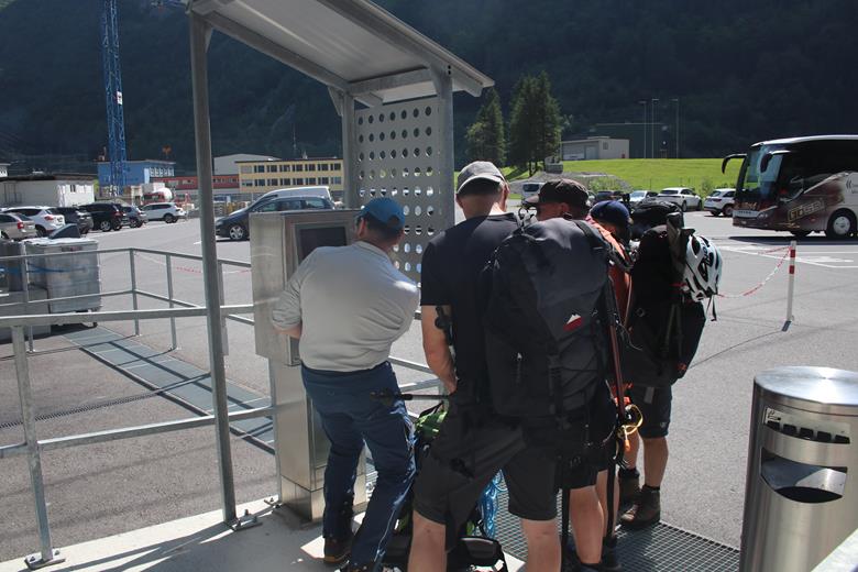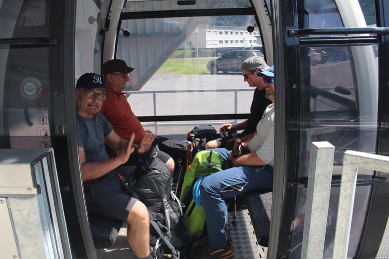Die Detaillierte Ausarbeitung für diese Tour, die wir weit vorab gemeinsam planten, erfolgte von Stuif, der keine Kosten scheute und ein Abo für das SAC Tourenportal abschloss. Die zweite Ausfahrt nach dem Autobahndreieck gilt es die Autobahn zu verlassen so die Angabe, schon vor dem Kreisverkehr war der Treffpunkt Unübersehbar. 9.25 Uhr, Komplett in Montur und den Rucksack gepackt, heute gekleidet nicht wie sonst üblich in der Grünen Berg Hose, heute trägt er eine Grau Blaue. Olaf steuert auf in zu, parkt das Fahrzeug vor einer Elektro Zapfsäule. Schnell mal zum Pinkeln. Gut und gerne 10 Minuten tauschen wir uns aus, als ein Fahrzeug mit Wohnwagen vorfährt um die Batterie zu speisen, das ist das Zeichen, ist es an der Zeit. Wie schon 2020 liegt das Ziel in den Glarner Alpen, eine Logische Fortsetzung der Tour vor 4 Jahren. Nach dem herrlich in die Landschaft eingebetteten Walensee zweigt es Richtung Linthal ab. Christian zieht an einem ATM in Glarus Fränkli. Es scheint nicht so das, wir in der Schweiz sind, doch das sollte sich noch heute ändern. Zeitlich passt das gut, Ziel ist es noch vor 12 Uhr, mit der Tierfed Bahn die erste Höhe zu nehmen. Unscheinbar aber Stetig steigt es in diesem Tal an, relativ wenig Fahrzeuge sind Unterwegs auf der Straße Richtung Klausenpass. Stuif teilt Olaf mit, das wir in Linthal Links abbiegen. Die Fahrt zieht sich noch einige Kilometer nach Linth. Wenn man bedenkt das hier noch vor kurzer Zeit ein Unglaublich Großes Kraftwerks Projekt umgesetzt worden ist, dürften die Anlieger Jahre danach sehr entspannt sein. Es ist vieles wieder renaturiert. Was sich seinerzeit hier abgespielt hatte, wird erst mit der Literatur die auf den Hütten ausliegt so richtig Bewusst. Wir sind noch nicht im Talschluß, aber jetzt schon umgeben von hoher Bergen. Das Gelände der Kraftwerksverwaltung ist eingezäunt mehrere Gebäuden befinden sich Nahe des Parkplatzes, überraschenderweise sind sehr viel Fahrzeuge am Parkplatz abgestellt, gleich daneben befindet sich die Berg Bahn, die vor 6 Jahren speziell für die Arbeiter errichtet worden ist. Die Stahlseile befinden sich fast über uns. Es ist 10.50 Uhr geworden, gut 4 Stunden für die Anfahrt. Temperatur auf 800 m 23°C. Die berühmte „Schichterei“ beginnt ein Bierchen darf natürlich nicht fehlen. Wie üblich erfolgt eine Absprache speziell wegen der Sicherheits Ausrüstung. Das gilt insbesondere für den Biffertenstock. Stuif nimmt sich des Seiles an, das gewichtigste Stück, dazu das „Hiking Water Bag“ Respekt . Ärgerlich ich habe die Waage vergessen. Die Sonne brennt vom Himmel es ist relativ Windstill. Aufgrund der Steigeisen sind die schweren Bergschuhe angesagt, Stuif schwört auf seine Sportiva, die Kameraden tragen eher einen leichten Schuh. Stuif langweilt sich derweil, um 11.20 Uhr, ist es soweit, Olaf verschließt das Auto. Die nächsten 4 Tage verbringen wir über der 2000 Meter Marke. Gut und gerne 10 Kg schwer der Rucksack, darunter wird keiner liegen, das Gewicht drückt auf die Schultern. Bis auf Stuif gehen wir in kurzem Textil. Die Ticket gibt es am Automat, 12 Sfr. die einfache Fahrt, gierig schluckt der Automat das Geld, als Gegenleistung gibt es ein Ticket mit Barcode, das am Drehkreuz eingelesen wird. Die Gondel schwebt ein, alles ist hier Vollautomatisiert 8 Personen sollen hier Platz finden. Mit 6 Minuten in der Sekunde schwebt die Kalktrittli Bahn in 7 ½ Minuten 1058 Höhenmeter nach Oben. Die Aussicht steigert sich auch die höheren Berge werden sichtbar, 3 Stützen bringen die Gondel ins schwingen. Fahrgäste warten auf die Abfahrt. Etwas Unübersichtlich die Station, Hinweisschilder deuten den Weg, es stellt sich heraus das da mehrere Seil Bahnen Installiert waren. Stuif trifft eine Entscheidung, ob des Guten Wetter gehen wir nicht durch den Tunnel diese Route wäre 15 Minuten weniger, gesagt getan. Stufen führen Östlich nach Oben, nur für Schwindelfreie Berggeher, oh das wird kein Spaziergang, 2 ½ Std. für die 700 Hm. bis zur Muttsee Hütte. Es ist jetzt 11.50 Uhr. Stuif geht ob seines Kontinuierlichen gleichmäßigen Schritt voran. Die Temperatur ist ob der Höhe gefallen, sehr Angenehm zu gehen. Interessant die Wegführung, zuerst unter der Aufragenden Wand des Chalchtrittli. Steil das Gelände schmal der Pfad erst Westlich, danach nach Oben, tolle Wegführung. Schnell ist der Körper gefordert. Tief unten wie im Modell das Betriebsgelände, in Serpentinen wird richtig an Höhe gewonnen. Erste Absteigende begegnen. Der Puls pendelt sich ein, die Atmung passt sich an, gehen unser Tempo. Wie aus dem nichts graut der Himmel ein, dadurch das die Sicht nach Süd und West noch fehlt, ist das völlig Überraschend. Es geht am Satt Grünen Gelände in einem Bogen stetig Bergauf eine kurze Zeit Östlich. Die Ferse wird spürbar reibt da etwa der Schuh? Christian fällt zurück. Endlich fällt das Gelände zurück, warte an geeigneter Stelle auf die Kameraden.