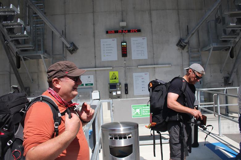 Als Christian eintrifft, steigen wir in die nächste Gondel, eine wartende Person gesellt sich zu. Mit 6 m in der Sekunde legt die Bahn in 7 ½ Minuten die Distanz von 1975 Meter zurück. Einst wurde diese Spur von der Bauseilbahn I genützt. Toller Blick in die Tiefe „die Ausmaße der Kraftwerksanlage ist schon Enorm, erkennbar wie das Wasser aus den Röhren in den oberen der beiden Hell Blauen Seen fließt. Wohl ein Deutsch Türke aus der Ecke von Stuttgart, der mit Freunden die Anlage Besichtigt. Bezahlt wird erneut am Automat. Hochsommerlich die Temperatur auf 780 Meter. Die letzten 70 Meter bis zum Auto wie eine Befreiung, insbesondere als Olaf das Auto öffnet, Runter mit den Berg Stiefel, rein in die Schlappen. Gut aufgeheizt das Fahrzeug, dennoch sind die Getränke die WPO Organisierte, von der Nacht relativ kühl geblieben. Die Verse schaut Übel aus, wie verläuft der Heilungs Prozess? in 11 Tagen startet die Bergwoche. Leider ist der Blick vom Tal in die Tour von hier überhaupt nicht einsehbar. Die Person die mit uns zu Tale gefahren ist, reist mit einem Wohnmobil gemeinsam mit den Kumpels durch die Schweiz,