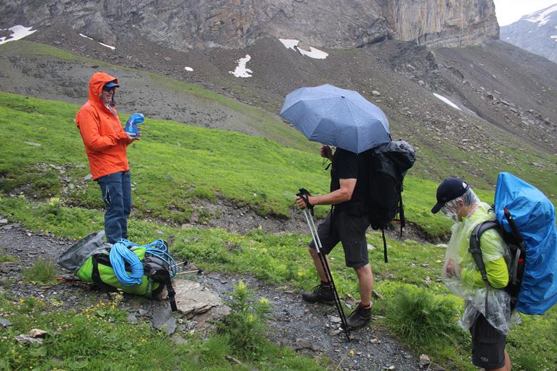 Übergang in den Beginn des Ödkessel am Muttenwändli, 2/3 der Höhe liegt hinter uns. Wind setzt ein es beginnt zu Tröpfeln es geht so schnell, es dauert bis die Regenjacke angelegt und der Schirm geöffnet ist, echt greazy, wie aus dem nichts. WPO tut gleich doch mit den Stöcken und dem Schirm in der Hand geht das nicht, Olaf trägt über seiner Windjacke ein ganz einfaches Plastik Cape, Stuif nützt die Regenjacke. Seit Jahren ist der einst verpönte Schirm ein wichtiges Utensil geworden. Vereinzelt Altschnee Felder unter dem Muttenwändli, Personen bewegen sich oben am Grat, die Route zwar nicht klar, wenigstens ist jetzt bewusst wohin des Weges. Aufstieg am Hang des Nüschenegg, der Nüschenbach wird in einer Rinne überquert, durch den Regen führt er schwarzes Segment. Ein Stück Bergauf, der Übergang über ein Schneefeld zum Muttenwändli schaut spannend aus. Beim Näherkommen und begehen, Entpuppt sich das entspannter. Teils Seilversichert, quert es in der schwarzen Wand auf doch gutem Pfad. Christian ist nicht weit zurück. Was vorher als Grat ausschaute ist eher ein Rücken. Tief ziehen die Wolken durch, durch die Körperliche Belastung zirkuliert das Blut, außer kühle Hände ist der Rest des Körpers gut mit Blut versorgt, der Schirm schützt den Oberkörper. Gut Markiert die Route, das Bild ändert sich, zwischen den Steinen auch Erde, Gras findet seinen Lebensraum. Der Schnee ist auf dieser Höhe erst gewichen, in den Mulden und Hängen hält er sich noch. Ein Rücken wird erreicht, inmitten einer Art Hochfläche liegt der blaue Muttsee (das Höchstgelegene Speicherbecken Europas) auffällig die graue Staumauer, rechts davon auf der Anhöhe die nach dem See benannte Muttsee Hütte. Die letzten Meter geht es durch eine leichte Senke. Das Steingebäude wurde mit einem Roten Holzvertäfelten Anbau versehen. der gar nicht so in das Bild passt. Im Hintergrund die Wand des 3000er Muttstock und den Muttbergen der obere Teil dieser liegt in den Wolken, ein Ziel der nächsten 3 Tage. Stuif erreicht kurz vor uns um 14.13 Uhr, die Hütte auf 2500 Meter. Laut Angabe sind es zur Kistenpass Hütte 1 ½ Std. es lässt sich in etwas erahnen wo sie liegt. Tief unten im Westen ist ein Zipfel des Limmersee zu erkennen. Ein erstes wenn auch winziges blaues Loch am Himmel, wir Beschließen ob der Zeit und des Regen hier eine Pause einzulegen, wenn möglich bleibt ein Teil der Ausrüstung hier, da wir Morgen auf Sonntag hier Übernachten, die Hütte ist heute leider ausgebucht die 69 Schlafplätze sind vergeben. Auf der Rückseite des Alten Gebäudes ist der Eingang, Grau gepflastert die Terrasse die Garnituren verwaist. Gebetsfahnen hängen an der Front. Deutlich Wärmer im Vorraum mit dem Aufgang in das OG. Ablegen der Regenkleidung und Schuhe. Links ist der Trockenraum, Rechts der Gastraum. Werfe einen Blick in den Trockenraum, es sollte möglich sein etwas Ausrüstung aufzubewahren. Die Tür ist der Übergang in den Neubau Die Räumlichkeit und Ausstattung in hellem Holz. Reichlich Fenster sorgen für Ausreichend Helligkeit. Geschätzt 30 % der Plätze sind besetzt, ein Tisch in der rechten Ecke ist frei. Eine Bedienung versorgt die Gäste, Alkoholfrei ist angesagt, Stuif gönnt sich einen Kuchen, bis hier konnte er bei seinem Visite der Tour vorstoßen. Auch damals gönnte er sich einen Kuchen. Der Aufstieg forderte die Schultern, diese sind auch etwas Maletriert. Auf Anfrage dürfen im Trockenraum etwas Deponieren. Viel zu schnell ist eine Stunde vergangen. Die Rucksäcke sind deutlich leichter. Das Wetter unverändert, wobei der Regen nachgelassen hat. Die Weg Tafel weist die Richtung .