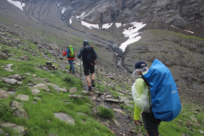 Sonntag 21.Juli: Die ersten Geister sind schon früh Unterwegs, selbst im Schlaf wird das wahrgenommen, es ist nach 6.30 Uhr, als wir uns berappeln, es scheint so das das aller Beste Wetter auf uns wartet. Das Bettenlager ist schnell geräumt, allzu viel ist es ja nicht, die Ausrüstung selber ist ja im Trockenraum gelagert. Wenig Gäste verteilen sich noch vor 7 Uhr in der Sonnengefluteten Gaststube. Kleine Foto Session vor der Hütte, die Temperatur liegt bei 10 °C, der Barometer zeigt mit 950 mbar Tiefdruck Wetter an. Das wird wohl nichts mit dem Muttstock, letztendlich fällt die Entscheidung spätestens auf der Bifertenhütte. Gemeinsam Frühstücken wir am selben Tisch, die Sitz Ordnung wird selbstverständlich eingehalten. Wasser Milch Kaffee steht an der durchreiche zur Küche, 2 Personen agieren von der Küche aus. Schlicht wie Typisch die Auswahl an Speisen, ein kleiner Tisch ist da ausreichend. Ohne auf die Uhr schauen zu müssen, sitzen die Gäste nicht lange am Tisch, es ist ein kommen und gehen. Im Vorraum geht es eng zu verlagern das Packen auf die Terrasse, Wolkenverhangen nun der Himmel, wie schnell es doch geht. Heute übernehme ich das Seil, im großen Touren Rucksack fällt das gar nicht auf, ja wenn`s nur das wäre. Verteilt an den Außen Tischen sind wir um 8 Uhr, Start klar. In Richtung Kistenpass Hütte ist die Route bekannt, es scheint niemand dorthin Unterwegs zu sein. Die Kurze Hose ist angesagt. Stuif geht voran. Wie gehabt erstmal Bergab in die Senke, wenig Wind das ist schon mal gut, die Ruhe ist Enorm, die Beine laufen fast selbständig, die Verse ist spürbar, Bergauf verstärkt sich das reiben im Schuh. Ein Rudel Steinböcke quert tiefer über ein Schneefeld, edle Wesen es ist immer wieder eine Freude die Könige der Alpen aus nächster Nähe zu erleben. Etwas Verwunderlich ob der dürftigen Nahrung findet sich dennoch etwas Grün zwischen den Steinen. Die hier wenig scheuen Tiere wechseln ständig ihr Quartier auf der Futtersuche. Die Schneeflächen werden bald abgeschmolzen sein, es läuft sich ganz gut darauf, der Untergrund ist eben. Die Kistenpass Hütte lässt sich mit dem Wissen wo diese sich befindet, schon früh erkennen. Komischerweise ist mein schritt etwas schneller, gehe voran, gefühlt läuft es sich etwas leichter als noch am ersten Tag. Ist es doch die Ruhe was so im Alltag abhandengekommen ist. Wenn es auch anstrengend sein sollte der innere Schweinhund ist der Gegner, ja Christian kämpft mit sich und seinem Lebenswandel, das ist unverkennbar. Fordernd die letzten 600 Schritte, 600 Schritte so steht es an einem Stein. Ramona und ein Helfer der Sektion, montieren gerade die Stahlketten, kurzer Oberflächlicher Austausch, die Kollegin sei in der Hütte, eine Stelle zum Passieren findet sich. Jetzt nachdem der Schnee weicht, kann das Seil Provisorium abgebaut werden.