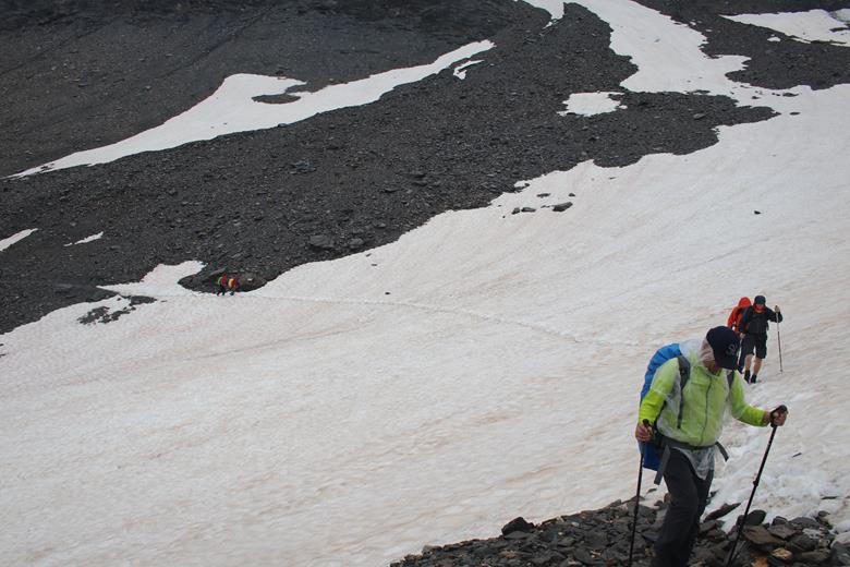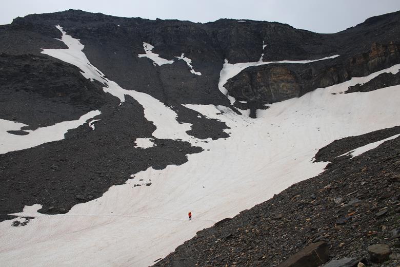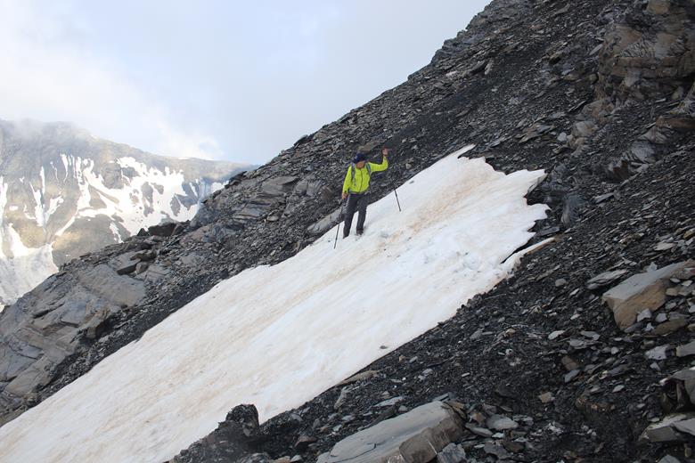 Samstag 20.Juli: Nicht ganz freiwillig beginnt der neue Tag nach einer doch ruhigen Nacht. Ein gutes Zeichen auf einer doch Staatlichen Höhe. Jetzt im Hochsommer ist es schon früh Hell, das bei solchen Touren wohl nicht so bedeutend sein sollte . Zwar sind wir heuer eine Woche später Unterwegs, als an einer Profitour sonst üblich, dadurch sollte einiges an Schnee gewichen sein. Zwei Fenster Sorgen für ausreichend Licht im Raum. Noch auf der Matratze sitzend, wird der Hüttenschlafsack und die Decke zusammengelegt. Es ist Eng irgendwie Organisiert sich das Ankleiden und Packen auch auf engsten Raum. An der Durchreiche zur Küche bedient Ramona die Gäste. Das Brot die Butter und Marmelade steht am Tisch. In der Nacht ist eine Freundin von Ramona Aufgestiegen Unterstützt Sie im Hintergrund, heute sind alle Plätze belegt. Verhalten die Unterhaltung. Die Äußerungen Bedingungen könnten besser sein. Wolken in Form von Nebel zieht durch. Die Temperatur bei 10°C. Begleichen der Rechnung die HP kostet 76 Sfr. Der geeignete Platz für das Anziehen der Schuhe ist auf der Terrasse, bestens geeignet zum Sitzen die Trockenen Metall Gitter Stühle. Entsprechend der Bedingungen benötigt das Prozedere wenig Zeit. 7.07 Uhr, setzen wir uns in Bewegung, gleich zu Beginn ein Kontrolliertes gehen, im Teils versicherten Gelände. Nach wenigen Minuten ist die Anspruchsvolle Passage durch. Relativ leicht Bergab Flott der Schritt, mehrere Querungen auf wenig steilen Schneefelder unter den Muttenberge, bereiten wenig Sorgen, der Schnee ist Weich. Es deutet sich ja schon gestern an, ob des Wetters, den 3000er Ruchi anzugehen, dieser liegt am Zustieg zum Haustock, die Entscheidung erfolgt auf der Muttsee Hütte. Ein Mix aus Sonne und Wolken begleitet uns. Fast selbstständig bewegen sich die Beine. Olaf schreitet als Pacemaker voraus, die Hütte kommt näher.