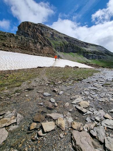Bergab die Kür, die Wegfindung ist natürlich einfacher von Oben ist der Pfad eher erkennbar, wobei in diesem Schuttberg eher die Direkte Linie Richtung dem Muttsee genommen wird. Es scheint so das das Wasser des Stausee zur Stromgewinnung abgelassen worden ist. Aufsteigende begegnen, ja es ist müßig. Heute habe ich als ich hier an der Tourenbeschreibung arbeite, die GPS Daten von Stuif (Komoot) erhalten, der Aufstieg im Unter Ruchifirn weicht Teilweise um die 50 Meter vom Abstieg ab. Wir lagen vorhin gar nicht so daneben😊 Der Untergrund ist teilweise sehr Weich, das ist natürlich beim Abstieg für die Gelenke nicht so belastend. Es quert teils im Schnee auf 2700 m Nördlich. Gut zu finden die Weg Spur ab und an auch ein Steinmann, vor dem Abbruch geht es über eine breiten steilen Rücken, das letzte Stück bis zu den beiden Seen verlaufen meist über Schnee, die Temperatur nimmt zu. Die Sonne setzt sich vermehrt durch. Von Christian ist nichts mehr zu sehen.