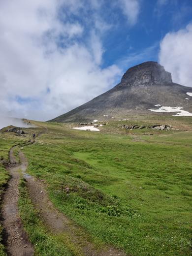 Dienstag 23.Juli: schon sehr Früh sorgt die Gruppe für Umtrieb, ärgerlich die lauten Unterhaltungen in einem Schlafraum, ganz so eilig haben wir es heute nicht. 6.50 Uhr, ein neuer Tag beginnt, es ist heller als noch gestern, ein Blick aus dem Fenster, die Wolken sind heute hoch, die Sicht zumindest nach Osten schaut schon mal passabel aus. Das packen verschieben wir, jetzt geht es erstmal eine Etage tiefer zum Frühstück. Verteilen uns wie schon zuvor am selben Tisch. Wie wohl Tag täglich ist die Auswahl des Frühstücks unverändert Die Frühaufsteher bereiten sich schon auf den Abmarsch vor, dementsprechend ist Bewegung im Haus und der Terrasse. Beständig ziehen Wolkenfelder durch oder vom Tal auf. Gut gestärkt und gelaunt wird der Abschied vorbereitet, mit dem Volumen des großen Rucksack ist die Ausrüstung schnell verstaut. Einige Kilo die jeder wegen der Sicherheit dieser Tage tragen durfte, waren wesentlich für die Tour zum Bifertenstock angedacht. Persönliche Verabschiedung bei der Chefin und dem Personal. Einheitlich in kurzer Hose, ja bis auf Stuif. Vor der Hütte versammeln wir uns, die Schuhe anzuziehen ein Übel. Ca. 4 Std. Gehzeit trennen uns bis zum Bähnli. 8.25 Uhr, setzen wir uns in Bewegung, der Körper deutlich besser angepasst auch an die Höhe, eins ist mir auch klar geworden, die Vorbereitung mit dem Rennrad, ersetzt nicht das Joggen, das doch der Ertüchtigung für den gesamten Körper dient. Die Wolken in Form von Hoch Nebel verdecken die Sonne. Leicht Bergauf bis zum Kistenpass. Die Querung unter den Muttberge bis zur Hütte, teils im Weichen speziell auf dem Weg verschmutzten Schnee. Für wenige Minuten setzt sich sehr zur Freude die Sonne durch. Kurz vor der Stahltreppe zur Kistenpass Hütte, treffen wir auf eine Gruppe der Älteren Generation. Gut 1 Stunde Gehzeit, wir sind uns einig, der Umweg in die Gaststube kann nicht schaden. Die Morgendlichen Aufräumarbeiten sind schon abgeschlossen. Angenehme Wärme in der Räumlichkeit. Ramona hat sich wohl schon an uns gewöhnt oder vermisst? 😊