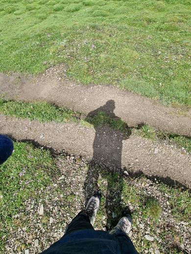 Es ist 11.20 Uhr, 3 Stunden sind schon vergangen als die 3 Hütte erreicht ist, noch nie zuvor waren die Touren Ziele auf einer so engen Fläche. So schnell wie es nur geht die Schuhe ablegen. Verteilt entspannt sich jeder auf seine Art. Die ersten Tages Gäste weilen in der Sonne. Unglaublich was Olaf Christian und WPO noch an Essen mit sich führen. Ungeniert wird am Tisch das mitgebrachte verspeist und getrunken, was nicht passt wird passend gemacht, das Personal ist wohl noch im inneren des Gebäude beschäftigt. Ich fühle im Waschraum der von außen zugänglich ist die Wasserflasche, eine Multivitamin Tablette als Geschmacks Verstärker. Ein Mix aus Sonne und Wolken. Schön anzusehen wie eine zerfetzte Wolken vom Limmersee kommend wieder am Hang vor der Hütte nach Oben ziehen. Eine der Bedienungen versorgt die Gäste, die ständig etwas ausgelaugt ankommen, das Verlangen nach einem Getränk nachvollziehbar, der Aufstieg vom Bähnli fordert. Die übliche Situation an einem Ort zu weilen bei brauchbarem Wetter, wer gibt da gern das Zeichen zum Aufbruch? 😊 Kurz nach 12 Uhr, ist es dann soweit, der Finale Abstieg liegt vor uns. Kurzer Halt um einen letzten Blick auf die Muttsee Hütte zu werfen, die Kameraden legen gerade auch einen Halt ein. Von Westen zieht gerade eine Wolke direkt über der Hütte durch. Im Hintergrund ist der Ruchi zu sehen, von der Hütte ist der Blick verdeckt. Blau spiegelt der See, wäre da nicht die unnatürliche Staumauer andererseits vergrößt sich der See sich erheblich, insbesondere wenn dieser mit der Überkapazität an Strom mit dem Wasser vom 4-fach großen Limmersee gespeist wird. Als die Kuppe erreicht wird öffnet sich der Blick in den Abstieg.