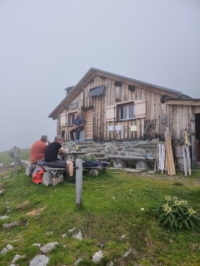 Ein Tisch in der Ecke mit Eckbank ist für uns Reserviert. Bemerkenswert wir halten uns mit dem Alkohol zurück, Saurer Moscht Alkoholfrei in der Bügelverschluss Flasche die Alternative. Rege Unterhaltungen, der Hunger zieht die Gäste zum Abendessen an. Ziemlich Pünktlich wird das Essen in Schüsseln Serviert, Salat Kartoffelpüree dazu Schweinebraten. Perfekt Christian versorgt mit Chili😊 Ruhig ist es für einige Minuten geworden, ein Nachschlag ist vonnöten, klar Fleisch ist Rationiert, statt Püree gibt es feingehobelte Bratkartoffel, mundet auch. Zum Nachschlag gibt es etwas später eine Süßspeise. Hilfsbereit werden die Teller und das Besteck an der Theke abgestellt. Die Sonne geht langsam hinter den Bergen im Westen unter, dort ist Morgen das Ziel die Bifferten Hütte. Nach 20 Uhr, ziehen sich die ersten Gäste noch vor der Nacht zurück, da sind wir schon noch etwas Sesshafter. Morgen soll das Wetter ähnlich wie heute sein, unbeständig geht es auch die nächsten Tage in den Bergen weiter. Begleichen der Rechnung 77 Sfr. Übernachtung mit HP. Ohne viel zu konsumieren liegt der Betrag bei 100 Fränkli. Frühstücken werden wir um 7 Uhr. Unauffällig wie möglich endet der Tag mit der Hütten Ruhe im Vorgeschriebenen Hüttenschlafsack.