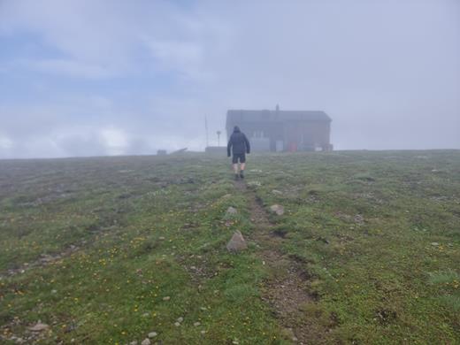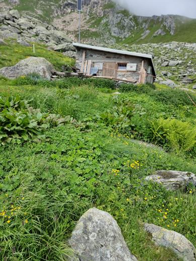 Freiwillige vortreten😊 Christian verliert diesen Wettbewerb, obwohl er mit seinem Gewicht die ca.10 Kg in Relation leichter stemmen sollte, er bleibt als einziger unter 20. Ein erste zartes Blau noch vor 11 Uhr. Stuif zieht es Richtung Bifertenstock. Alternativ ein Abstieg zur Rubi Sur. Olaf schließt sich Stuif an. Ohne jegliches Gepäck aber mit Regenfester Kleidung, gegen 11.20 Uhr, treffen wir uns vor der Hütte. Die Kamera bleibt ausnahmsweise zurück, es ist hefig in die Berg Schuhe zu steigen. Während Stuif und Olaf in Nördlicher Richtung aufsteigen, schreiten wir erst Südlich gen Brigels. Der Weg wohl gut begangen, meist begangen von Tages Gästen, die Hütten Zustiege sind Markiert. Saftig grün das Gras, nachdem wohl erst vor kurzer Zeit der Schnee gewichen war. Trotz der Regenfälle ist der Untergrund fest. In einem Bogen wechselt die Richtung. Einige Schneefelder sind die Zeugen des letzten Winters. Das Thema beim Gehen, der Politische Irrsinn der speziell in Deutschland tobt, speziell die Medien tragen wegen einer einseitigen Informations Politik eine hohe Schuld, wird von Christian etwas pauschal verschönert, gebe WPO in allen belangen Recht, zu sehr beschäftige ich mich damit. Mit etwas Glück öffnet sich etwas die Sicht. Die Nahe Bergstation Fil da Rubi wird sichtbar Die Umgebung wird mit jedem Meter Bunter. Entlang des Weges befindet sich ein Weidezaun. Das Ziel 2171 m, wird nun sichtbar, nach doch 1 Stunde endet der Abstieg, an einer kleinen Hütte die im Hang eingebettet liegt, das aus Holz errichtete Gebäude ist zum Schutz vor dem Vieh mit einem Elektro Zaun umgeben.