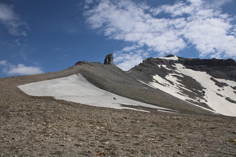 Stuif ist gewillt ob der leicht verbesserten Wetter Situation die Tour anzugehen, Olaf schließt sich an WPO gesellt sich dazu, der Rucksack wird an der Weg Tafel 2501 m, deponiert. Christian und ich lehnen die Tour über 2 ½ Std. ab. Auffällig ein großer Gendarm der natürlich umgangen wird. Wir beobachten die drei einige Zeit in ihrem Aufstieg. Ein naher See in einer Senke der nicht am Weg liegt, zieht uns an, verweilen einige Zeit nahe des Ufers, beobachten und genießen die Sonne die jetzt deutlich die Oberhand inne hat. Es scheint das es in einem steileren Hang das Gelände den drei zu schaffen macht. Ein Schneefeld das wohl am Grat liegt wird auf der Rückseite begangen. Es ist 11.30 Uhr, als wir uns aufraffen, die Hütte ist Sichtbar liegt Nord Westlicher auf einer Anhöhe, etwas entfernt der kleine Markante Kistenstöckli 2748 m. das ist der Hütten Gipfel. Im Hintergrund die teils Schneebedeckte Kulisse der Brigelser Hörner. Von Westen zieht schon wieder eine Graue Wolkenfront auf. Versuchen uns gradlinig dem Ziel zu nähern, das in diesem Gelände nicht ganz gelingt, ein Auf und ab hin und her. Wir treffen auf den Weg nach Brigels, passieren diesen, eine wenig begangene Spur führt Richtung der Biferten Hütte. Die Natur erholt sich vom Schnee, in nur wenigen Tagen gedeihen hier die Gräser und Pflanzen. Es geht deutlich tiefer als vermutet, treffen auf den Weg am tiefsten Punkt, der von Brigels zur Hütte führt. Tief unten Im Tal ist der Ort, die Temperatur eine ganz andere, Oberhalb ist ein See und etliche Gebäude zu erkennen.