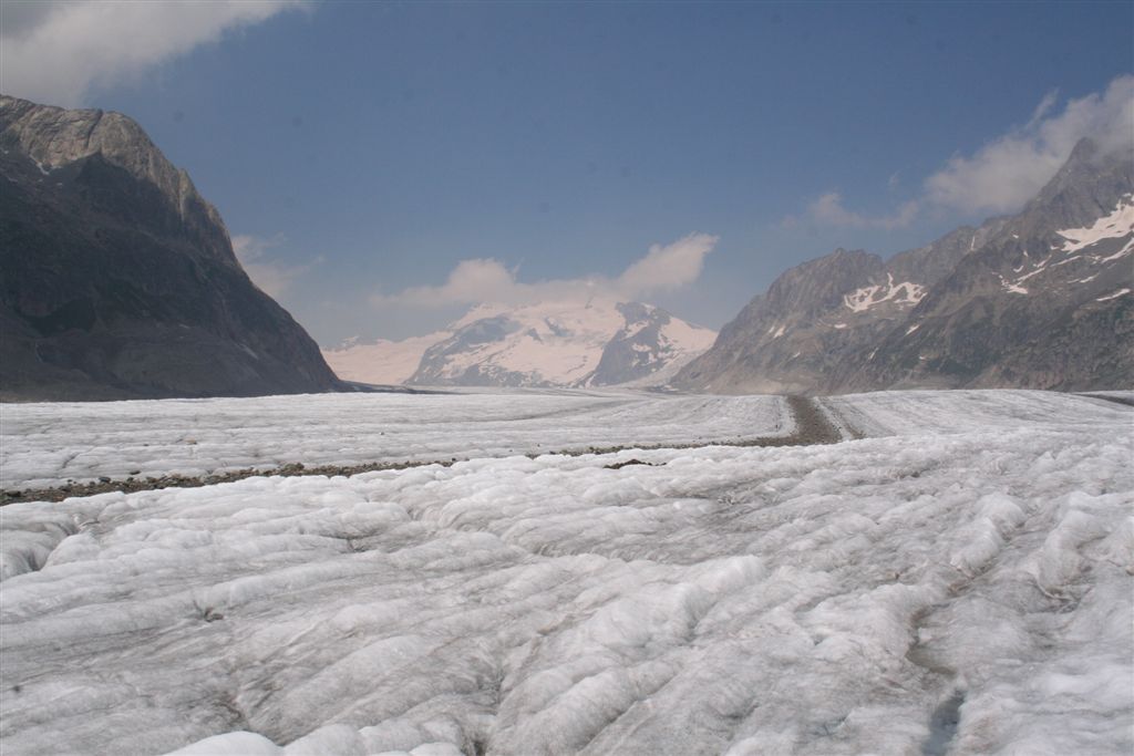 Samstag 01.August : 10.000 Uhr.Bahnfahrt auf die Bettmeralp (2647 m) .14,90 € Aufstieg durch denn Marjelenstollen vorbei an der gleichnamigen Hütte, Abstieg zum faszinierenden türkis farbenen Gletscher Einstieg. Wow! 11.40 Uhr wird der größte Gletscher der Alpen mit seiner 25 Km länge, zum X-ten mal betreten, für einen erfahrenen ne lockere Geschichte, nicht so für Jens * später stellt sich heraus das das Schuhwerk unter aller Kanone war.