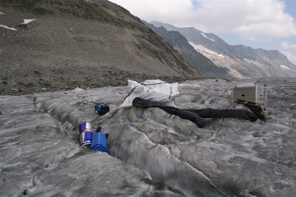 Die Querung zur Mittelmoräne in diesem Part, ist sehr heikel, sehr Große offene Spalten und die nicht vorhandene Einsehbarkeit, kein Wunder steigt der Bursche hier richtig an, oder besser gesagt fliesst der Eisstrom hier über einen Felsrücken, dies erschwert eben das Vorwärtskommen, für die einen Genuss für die anderen ne brenzlige Angelegenheit. Ein Gletschertisch inmitten der rechten *Moräne,dient als idealer Platz zum Vespern. Für eine längere Pause ist es knapp über dem Eis doch eher Kühl, trotz des passablen Wetters.* Moräne= der Gletscher der am Bergrand vorbeifliesst dient als Transportmittel für die herabfallenden Steine und zieht sich komplett wie eine gepflasterte Strasse bis zur Mündung. Ein Marathonlauf der ein Jahr vorher in der Nähe statt gefunden hat hinterließ unglaubliche Spuren, Große Container, Mülltonnen riesige Gepäcknetze und kleinere Gebinde verschandelten in unglaublicher Art und Weise denn Gletscher und das auch noch in fast Reichweite der Konkordiahütte. Christians Durst auf ein Red Bull das in einem Paket verstaut war, sollte noch für eine Böse Überraschung sorgen, wir begnügten uns mit Mineralwasser,klar ein paar Flaschen verschwanden im Rucksack.