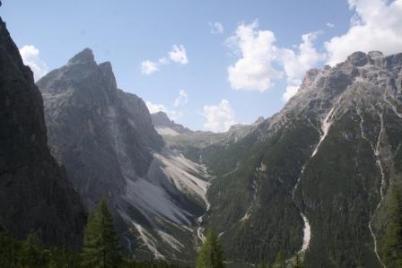 Montag 22.Aug.Gut gefrühstückt schuhten wir einem neuen Abenteuer entgegen, Ziel war heute der Alpini Steig, ein nicht ganz so anspruchsvoller Steig, in Landschaftlicher großer Runde, die einzelnen Abschnitte sorgten für einen puren Genuss, ja die teilweise sehr ausgesetzen Felsbänder boten besonderes…Wolfgang ein eh etwas unerfahrener, hielt gern das Sicherungsseil in den Händen. Nach gut 3 Std. Alpiner Wanderung, Sonnten wir uns mit einigen Bergsteiger in der Elferscharte auf (2650m) Höhe. Für den Weiterweg bzw.Abstieg wählten wir den Abstieg in Richtung Rotwandwiesen, noch vor 12 Uhr traten wir diesen an. Ein paar minütchen vor 14 .00 Uhr, ereichten wir den Großen Parkplatz Fischleinboden schweissgebadet