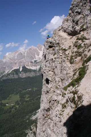 Zwei Schweizer befanden sich gerade im Einstieg, eigentlich sah der Beginn leicht aus, sollte ich mich täuschen? Jens bekamm denn Vorzug, die ersten Meter ließen sich gut meistern, ja es war die Schlüsselstelle, richtig! Wenn dann am Anfang, wenn auch mit Mühe aber es gelang ihm.Aber um 12.15 Uhr war für ihn diese Tour zu Ende, der Respekt und die Ungewissheit über das kommende bewegte zur Umkehr. Der Treffpunkt wurde festgelegt! Der gute Fels und eine perfekte Sicherung sorgten für erstklassiges Ferrata Feeling, ja der Name „Cortineser Art“ wurde eindrücklich bestätigt. Sehr abwechslungsreich wechselte die Szenerie, steilerer passagen folgten abwechslungreichen querungen, ja es war ein hin und her im stetigen Anstieg, die Erbauer leisteten Grossartige Arbeit! Nach einem kurzen plausch mit den Eidgenossen, kam wohl der schönste Abschnitt, ein Felsband führte in einem inneren Bogen durch eine Schlucht, um wenig später, Oberhalb diese Stelle wieder einzusehen. Einfach grandios! Ein Italiener wurde regelrecht überflogen, um dann nach einer kleinen Gratwanderung, vor der Ausstiegs Querung Tief und zufrieden auszuschnaufen.