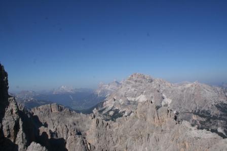 Donnerstag 25.August Via feratta Merlone. Gegen 7.30 Uhr war die Hütte schon fast verwaist, genau die richtige Zeit für ein gemütliches Frühstück, neben dem obligatorischen Teewasser, bestand das Frühstück aus denn mitgebrachten Speisen wie Brot Wurst, Käse, und Tomaten o.ä. gegen 8.00 Uhr, bei schon angenehmer Temparatur, sollte es unser letzter Großer Tag dieser Tour werden, der Reihe nach, gleich neben der Hütte teilten sich die Wege in alle Himmelsrichtungen, für uns ging es in Südlicher Richtung Bez.116, nach halber Weg Länge zweigt der Weg zur ferrata deutlich markiert links in Richtung Abstürze der Cima Cadin Nord West ab, kleiner Schneefelder zeugen noch vom letzten Winter. In weniger als 30 Min. ist der Einstieg des Steigs erreicht, schnell wird ein vorraus steigender der flott an Höhe gewinnt ausgemacht, es scheint doch ganz schön ausgesetzt zu sein! Anfangs gilt es querend mehrere Stufen in leichter Kletterei 1-2 zu überwinden, alsbald ist die Wand erreicht, über steile teilweise verbogene Eisenleitern (ja Wind und Wetter sowie Blitz und Steine setzen dem Blitzableiter ganz schön zu), nimmt der Tiefblick stetig zu! es wechselt sich eine Seilversicherte und eine mit Leitern bestückte passage ab.Jens scheint es richtig zu gefallen, ja die Stimmung ist dem Wetter angepasst, wir sind in unserem Element wer kann uns aufhalten? Mit diesem Termin landeten wir einen Volltreffer, schade nur das keiner der Einladung folgen wollte oder konnte!!Am Ausstieg aus der Wand gilt es sich aufgrund von losem Gestein äusserst vorsichtig zu bewegen, selbst die errichteten Barieren schützen die nachsteigenden wenig. Über Geröll wird eine Rinne die zum Grat führt durchstiegen, im folgt man bis zum Gipfel mit fantastischer Rundumsicht, die Drei Zinnen scheinen zum greifen Nahe zu sein. Cristallo, Sextener, Tofane um nur einige zu nennen, wecken erinnerungen an Tolle Touren… mit einigen Bergkameraden in denn letzten zwei Jahrzenten, ja gibt es etwas schöneres als in der Vergangenheit zu stöbern?