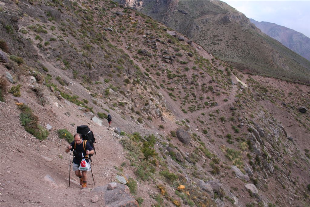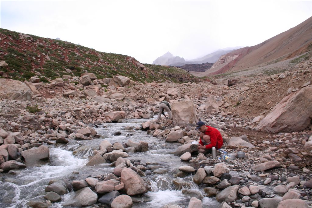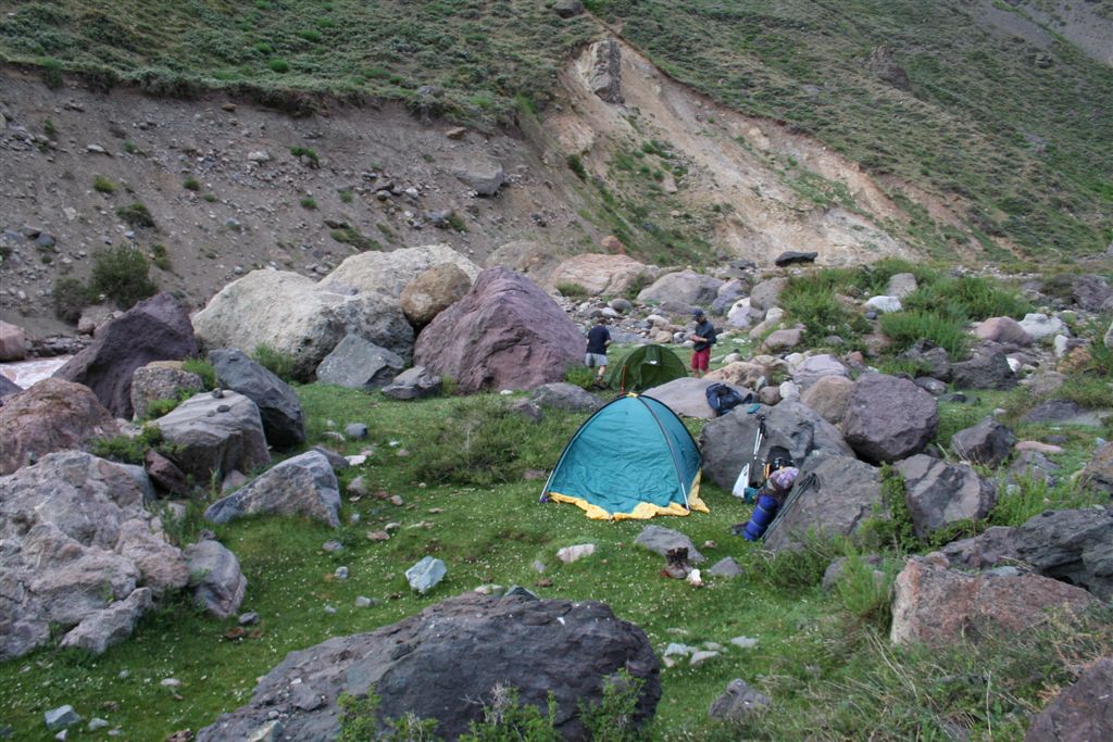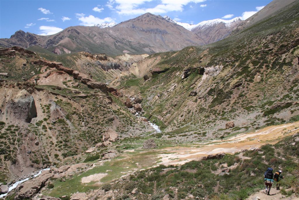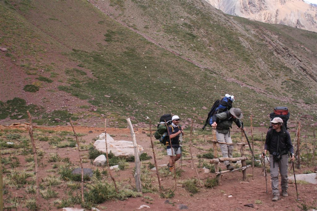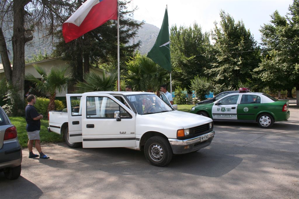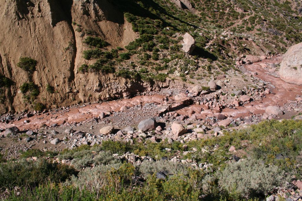 Do.27.12.Nachdem wir Fritz* (ein Freund von Ulli und Alvaro) am El Kika wie vereinbart treffen, um die Genehmigung für das Betreten des Militärischen Schutzgebietes (for Foreigner) „ein kleiner Wegabschnitt im Tal des Rio Colorado“ zu erhalten, steht uns eigentlich für die Tour nichts mehr im Weg, doch eine kleine Unbekannte macht uns noch Sorgen, wie kommen wir von San Jose de Maipo nach Chacayer, *Fritz Kobel ist ein renommierter Schweizer Bergführer, ihm gelangen unter anderem  drei 8000 m Gipfel im Himalaya. Mittlerweile lebt Fritz nun schon seit 12 Jahren in Santiago, er Organisiert und betreut eigene Expeditionen. Diese Frage stellen wir Fritz, er war der Meinung dies sollte kein Problem darstellen, vorsorglich bitten wir ihn,  uns doch die Frage nach einem Fahrzeug auf ein Stück Papier zu notieren. Wir verabschieden uns Herzlichst Dankend  von diesem netten Eidgenossen versprechen ihm nach der Rückkehr über die Bedingungen am Berg und unseren Erlebnissen zu berichten. (Diese Infos benötigt er, da er zwei Expeditionen im Februar dorthin leitet). Mit der Metro ereichen wir in Kürze das Busterminal, und ehe wir uns versehen sitzen wir schon im Bus nach San Jose de Maipo. Die 70 Km lange Fahrt kostet uns unglaubliche 2 €. 2 ½ Std. später erreichen wir San Jose und begeben uns schnurstraks zur dortigen Station der Carabineros de Chile. Nun geschieht das Unglaubliche, der erste Uniformierte scheint sich wenig zuinteressieren, aber sein Kollege der dazu kommt begrüsst uns per Handschlag und nimmt sich der Sache wie selbstverständlich an, er liest unsere Papiere wohl gelaunt durch, schaut uns an,  und nennt denn Namen Tupungato,  wir antworten mit Si, nun geben wir ihm die Notiz mit der Frage nach einem Auto, prompt antwortet er mit No, für uns stürzt plötzlich ein Berg ein, damit hatten wir nie und nimmer gerechnet, er stellt weitere Fragen die wir aber nicht beantworten können, eigentlich liegt das Problem an unseren genialen Spanischkenntnissen, die wirklich ein Armutszeugnis darstellen. Doch wir wissen uns zu helfen und legen ihm die Telefonnummer von Fritz vor, ohne zu zögern greift er zu seinem Privat Handy und klingelt bei Fritz an. Wir können nur an seinen Äusserungen und Gesichtszügen erkennen dass er dies alles sehr locker aufnimmt, auch wir schmunzeln mit, man spürte richtig, dass  er sich unseres Problems ernsthaft annimmt. Nach dem er einige Sätze mit Fritz gewechselt hat  übergibt mir der sympathische Beamte sein Handy, ich kann mich nun  mit Fritz austauschen, erfahre dabei das die gespräche wegen des Fahrzeugs im Gange sind! Der Polizist tätigt ein weiteres Gespräch, wir konnten diesem aber nicht folgen, so verging die Zeit ohne ungeduldig zu werden. Nach einigen Minuten holte mich der Beamte in sein Office und übergab mir das Telefon, ich meldete mich mit meinem Namen, die Frage ob ich Englisch Spreche wurde mir gestellt, ohne Rot zu werden sagte ich ja, er nannte seinen Namen Max Madonis, schnell wurde mir klar, dass ist der Mann von Gener (ein Freund von Fritz) er teilt mit  das um 19.00 Uhr ein Auto kommt um uns nach Chacayer zubringen ,ich bedankte mich aufs Herzlichste. Schnell waren die Kameraden informiert, Begeisterung flackerte in den Gesichtern auf, von einer Minute auf die andere war die Welt wieder in Ordnung. Da wir nun viel Zeit hatten begaben wir uns ins Zentrum der Ortschaft in einen typischen  Tante Emma Laden und stärkten uns mit Kaffee und Kuchen, anschliessend beschlossen wir uns am Plazza niederzulassen, vorher wollte Bodo nochmals kurz zurück Jens begleitete ihn um sein Tagebuch aus dem Rucksack zuholen. Ich lag gerade auf dem Rücken und genoss die wärmenden Strahlen der Sommersonne, als die beiden auf mich zuliefen und mich aufforderten schnell zukommen, ein Fahrzeug steht bereit. Eiligst begaben wir uns zur Station, ruckzuck wurde das Gepäck verstaut, wir bedankten uns selbstverständlich bei dem Beamten, schon ging die Fahrt Los. * 2 Wochen Später erfahren wir von Fritz, das dieses Fahrzeug nicht von Gener war, sondern der Polizist hatte dies Organiesiert. Nach 31 km Fahrt durch das wunderschöne Allfal-Tal erreichten wir die Pforte von Gener(ein Elektrizitätsunternehmen), hier wird die Genehmigung vorgelegt die uns Fritz einholte. Relativ formlos wurde uns die Schranke geöffnet, der Weiterfahrt stand nichts mehr im Weg. Über eine unbefestigte aber sehr gut befahrbare Schotterstrasse, ereichten wir nach 24 Km Chacayer unserem Ausgangspunkt der Tour auf 2240 m. Der Fahrer forderte von jedem 15.000 Peso (22 €) die wir gerne bezahlten. Es war zwar schon 19.00 aber wir wollten noch die Zeit bis zur Dunkelheit nützen und ein Stück Wegstrecke zurücklegen, so erreichten wir um 20.30 einen sehr schönen Platz  am Rio Colorado auf 2350m. Das grosse Gesprächsthema an diesem Abend war die wundersame Organisation eines Fahrzeugs in San Jose, es war einfach überwältigend wie man sich hier um uns Bergsteiger kümmert, das war unser Schlüsselerlebnis und wohl der Startschuss für diese perfekte Tour oder unseres „Traumurlaubs“. Fr.28.12. Später Abmarsch um 10.45 Uhr, wir wollten die warmen Strahlen der Sonne nützen um die Schlafsäcke sowie die Zelte zu trocknen. Leider war das Tal sehr ungünstig oder die umliegenden Berge noch zu hoch, doch dies sollte sich aber bald ändern! Unser Tagespensum war das Erreichen des Estero Azufre ca.2700m,  4 Std. wir hatten das Tagesziel etwas höher angesiedelt aber das Gepäck macht uns ernsthaft  zu schaffenWeinend die Schultern schmerzten, zudem waren wir noch wenige Tage davor im Tiefsten WinterStirnrunzelnd hier war nun absoluter Hochsommer angesagt, die Sonne stand um die Mittagszeit Senkrecht am Firnament!!