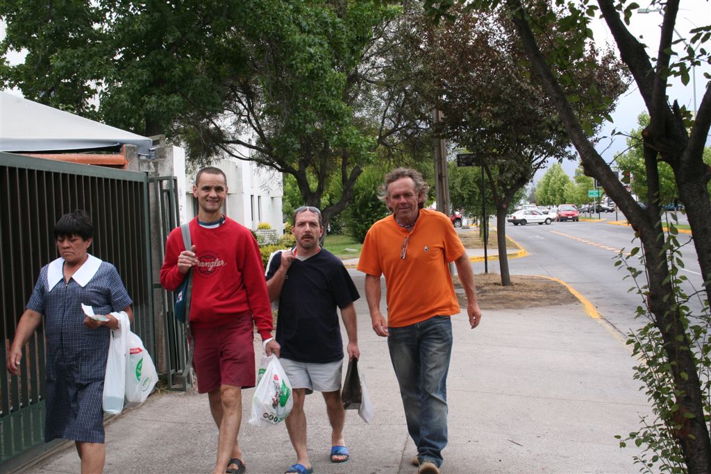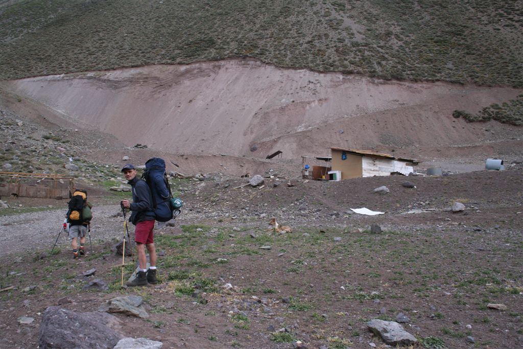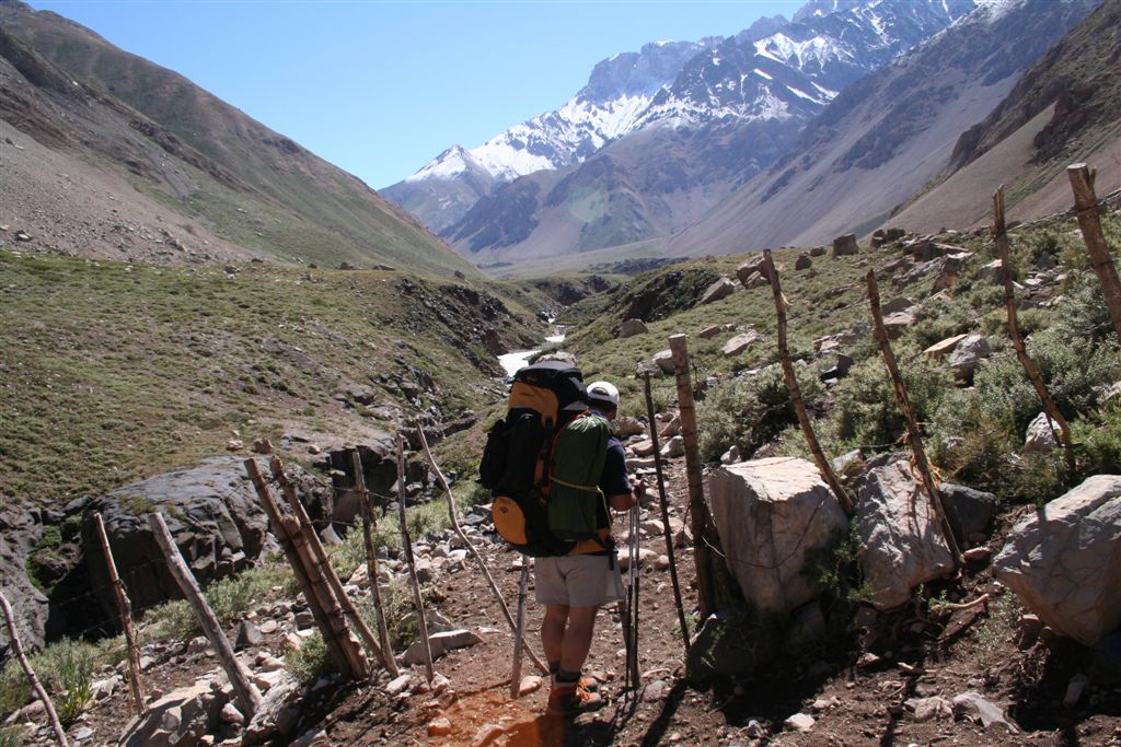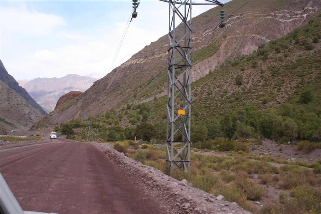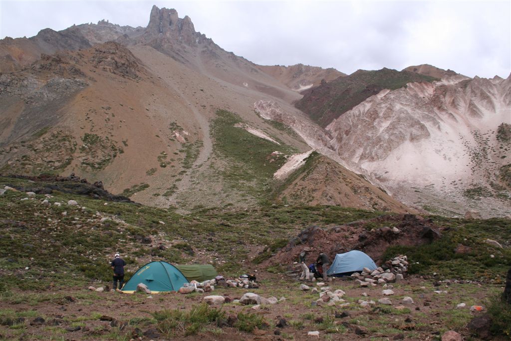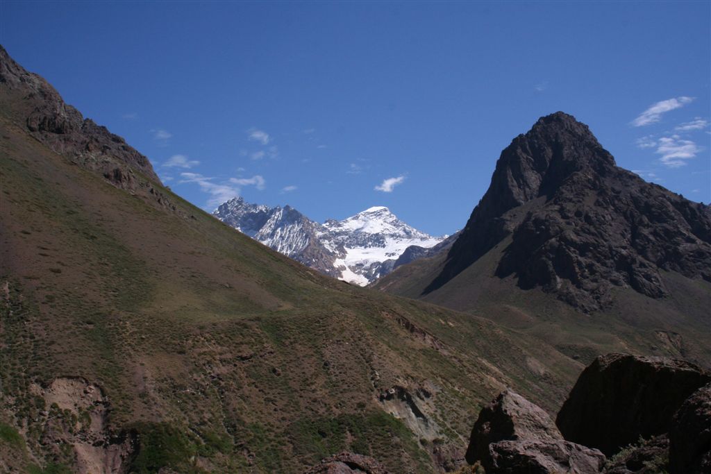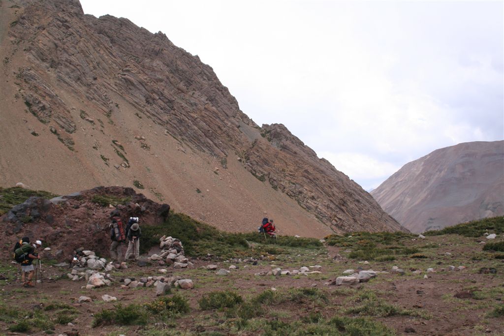 Do.27.12.Nachdem wir Fritz* (ein Freund von Ulli und Alvaro) am El Kika wie vereinbart treffen, um die Genehmigung für das Betreten des Militärischen Schutzgebietes (for Foreigner) „ein kleiner Wegabschnitt im Tal des Rio Colorado“ zu erhalten, steht uns eigentlich für die Tour nichts mehr im Weg, doch eine kleine Unbekannte macht uns noch Sorgen, wie kommen wir von San Jose de Maipo nach Chacayer, *Fritz Kobel ist ein renommierter Schweizer Bergführer, ihm gelangen unter anderem  drei 8000 m Gipfel im Himalaya. Mittlerweile lebt Fritz nun schon seit 12 Jahren in Santiago, er Organisiert und betreut eigene Expeditionen. Diese Frage stellen wir Fritz, er war der Meinung dies sollte kein Problem darstellen, vorsorglich bitten wir ihn,  uns doch die Frage nach einem Fahrzeug auf ein Stück Papier zu notieren. Wir verabschieden uns Herzlichst Dankend  von diesem netten Eidgenossen versprechen ihm nach der Rückkehr über die Bedingungen am Berg und unseren Erlebnissen zu berichten. (Diese Infos benötigt er, da er zwei Expeditionen im Februar dorthin leitet). Mit der Metro ereichen wir in Kürze das Busterminal, und ehe wir uns versehen sitzen wir schon im Bus nach San Jose de Maipo. Die 70 Km lange Fahrt kostet uns unglaubliche 2 €. 2 ½ Std. später erreichen wir San Jose und begeben uns schnurstraks zur dortigen Station der Carabineros de Chile. Nun geschieht das Unglaubliche, der erste Uniformierte scheint sich wenig zuinteressieren, aber sein Kollege der dazu kommt begrüsst uns per Handschlag und nimmt sich der Sache wie selbstverständlich an, er liest unsere Papiere wohl gelaunt durch, schaut uns an,  und nennt denn Namen Tupungato,  wir antworten mit Si, nun geben wir ihm die Notiz mit der Frage nach einem Auto, prompt antwortet er mit No, für uns stürzt plötzlich ein Berg ein, damit hatten wir nie und nimmer gerechnet, er stellt weitere Fragen die wir aber nicht beantworten können, eigentlich liegt das Problem an unseren genialen Spanischkenntnissen, die wirklich ein Armutszeugnis darstellen. Doch wir wissen uns zu helfen und legen ihm die Telefonnummer von Fritz vor, ohne zu zögern greift er zu seinem Privat Handy und klingelt bei Fritz an. Wir können nur an seinen Äusserungen und Gesichtszügen erkennen dass er dies alles sehr locker aufnimmt, auch wir schmunzeln mit, man spürte richtig, dass  er sich unseres Problems ernsthaft annimmt. Nach dem er einige Sätze mit Fritz gewechselt hat  übergibt mir der sympathische Beamte sein Handy, ich kann mich nun  mit Fritz austauschen, erfahre dabei das die gespräche wegen des Fahrzeugs im Gange sind! Der Polizist tätigt ein weiteres Gespräch, wir konnten diesem aber nicht folgen, so verging die Zeit ohne ungeduldig zu werden. Nach einigen Minuten holte mich der Beamte in sein Office und übergab mir das Telefon, ich meldete mich mit meinem Namen, die Frage ob ich Englisch Spreche wurde mir gestellt, ohne Rot zu werden sagte ich ja, er nannte seinen Namen Max Madonis, schnell wurde mir klar, dass ist der Mann von Gener (ein Freund von Fritz) er teilt mit  das um 19.00 Uhr ein Auto kommt um uns nach Chacayer zubringen ,ich bedankte mich aufs Herzlichste. Schnell waren die Kameraden informiert, Begeisterung flackerte in den Gesichtern auf, von einer Minute auf die andere war die Welt wieder in Ordnung. Da wir nun viel Zeit hatten begaben wir uns ins Zentrum der Ortschaft in einen typischen  Tante Emma Laden und stärkten uns mit Kaffee und Kuchen, anschliessend beschlossen wir uns am Plazza niederzulassen, vorher wollte Bodo nochmals kurz zurück Jens begleitete ihn um sein Tagebuch aus dem Rucksack zuholen. Ich lag gerade auf dem Rücken und genoss die wärmenden Strahlen der Sommersonne, als die beiden auf mich zuliefen und mich aufforderten schnell zukommen, ein Fahrzeug steht bereit. Eiligst begaben wir uns zur Station, ruckzuck wurde das Gepäck verstaut, wir bedankten uns selbstverständlich bei dem Beamten, schon ging die Fahrt Los. * 2 Wochen Später erfahren wir von Fritz, das dieses Fahrzeug nicht von Gener war, sondern der Polizist hatte dies Organiesiert. Nach 31 km Fahrt durch das wunderschöne Allfal-Tal erreichten wir die Pforte von Gener(ein Elektrizitätsunternehmen), hier wird die Genehmigung vorgelegt die uns Fritz einholte. Relativ formlos wurde uns die Schranke geöffnet, der Weiterfahrt stand nichts mehr im Weg. Über eine unbefestigte aber sehr gut befahrbare Schotterstrasse, ereichten wir nach 24 Km Chacayer unserem Ausgangspunkt der Tour auf 2240 m. Der Fahrer forderte von jedem 15.000 Peso (22 €) die wir gerne bezahlten. Es war zwar schon 19.00 aber wir wollten noch die Zeit bis zur Dunkelheit nützen und ein Stück Wegstrecke zurücklegen, so erreichten wir um 20.30 einen sehr schönen Platz  am Rio Colorado auf 2350m. Das grosse Gesprächsthema an diesem Abend war die wundersame Organisation eines Fahrzeugs in San Jose, es war einfach überwältigend wie man sich hier um uns Bergsteiger kümmert, das war unser Schlüsselerlebnis und wohl der Startschuss für diese perfekte Tour oder unseres „Traumurlaubs“. Fr.28.12. Später Abmarsch um 10.45 Uhr, wir wollten die warmen Strahlen der Sonne nützen um die Schlafsäcke sowie die Zelte zu trocknen. Leider war das Tal sehr ungünstig oder die umliegenden Berge noch zu hoch, doch dies sollte sich aber bald ändern! Unser Tagespensum war das Erreichen des Estero Azufre ca.2700m,  4 Std. wir hatten das Tagesziel etwas höher angesiedelt aber das Gepäck macht uns ernsthaft  zu schaffenWeinend die Schultern schmerzten, zudem waren wir noch wenige Tage davor im Tiefsten WinterStirnrunzelnd hier war nun absoluter Hochsommer angesagt, die Sonne stand um die Mittagszeit Senkrecht am Firnament!!