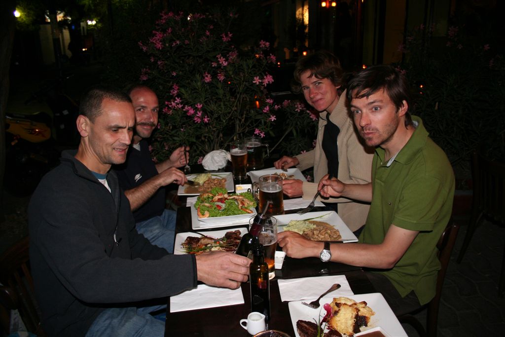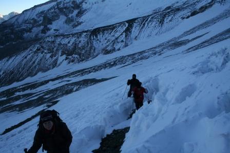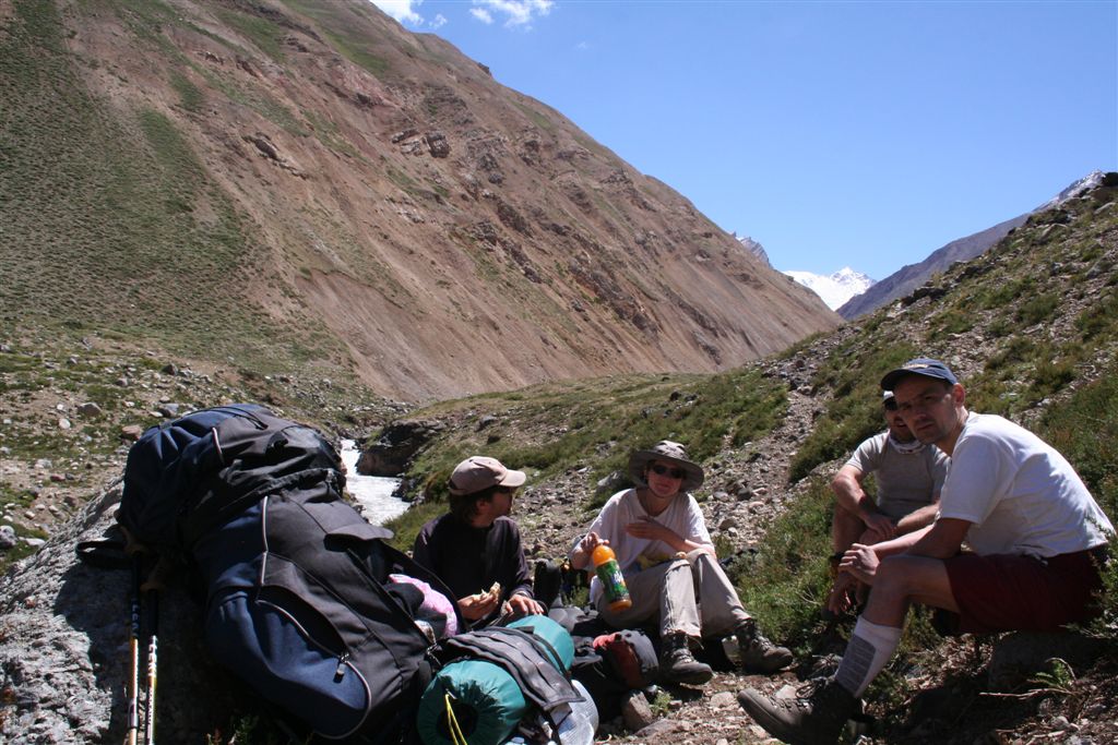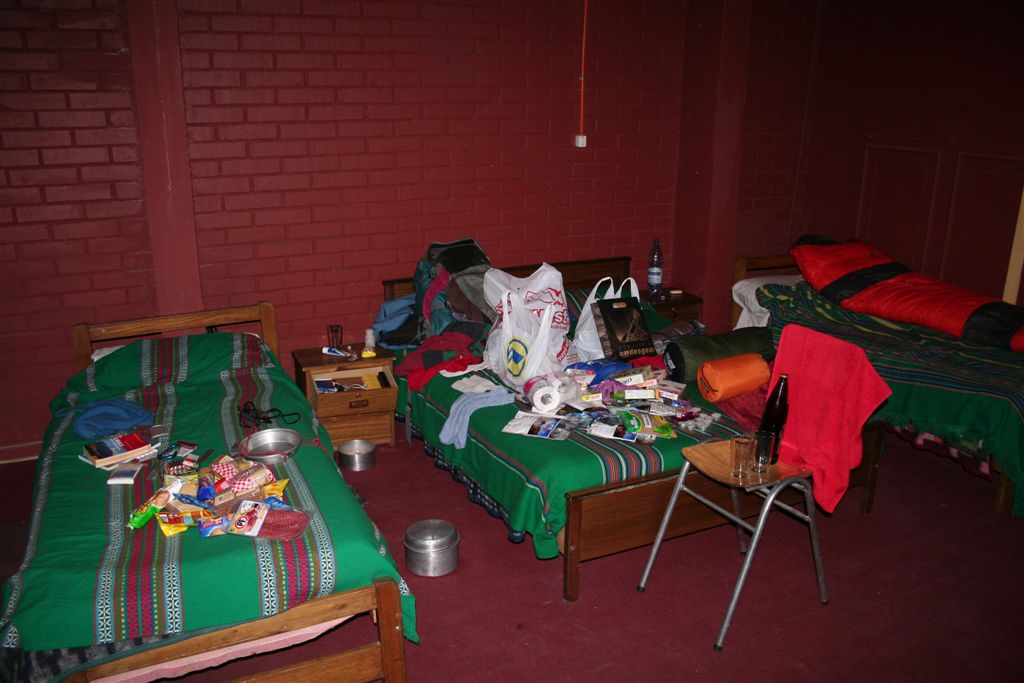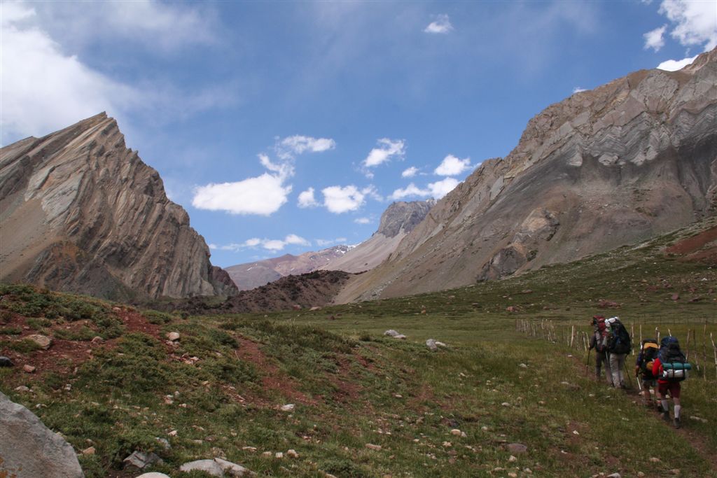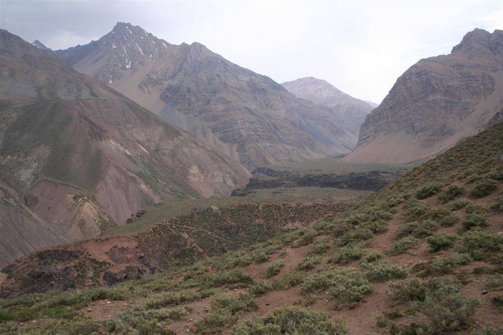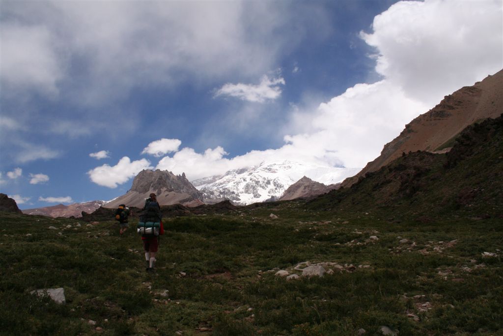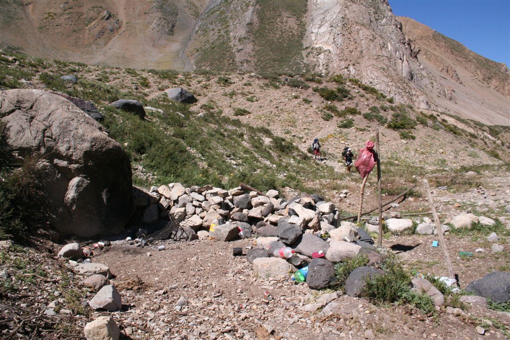 Do.27.12.Nachdem wir Fritz* (ein Freund von Ulli und Alvaro) am El Kika wie vereinbart treffen, um die Genehmigung für das Betreten des Militärischen Schutzgebietes (for Foreigner) „ein kleiner Wegabschnitt im Tal des Rio Colorado“ zu erhalten, steht uns eigentlich für die Tour nichts mehr im Weg, doch eine kleine Unbekannte macht uns noch Sorgen, wie kommen wir von San Jose de Maipo nach Chacayer, *Fritz Kobel ist ein renommierter Schweizer Bergführer, ihm gelangen unter anderem  drei 8000 m Gipfel im Himalaya. Mittlerweile lebt Fritz nun schon seit 12 Jahren in Santiago, er Organisiert und betreut eigene Expeditionen. Diese Frage stellen wir Fritz, er war der Meinung dies sollte kein Problem darstellen, vorsorglich bitten wir ihn,  uns doch die Frage nach einem Fahrzeug auf ein Stück Papier zu notieren. Wir verabschieden uns Herzlichst Dankend  von diesem netten Eidgenossen versprechen ihm nach der Rückkehr über die Bedingungen am Berg und unseren Erlebnissen zu berichten. (Diese Infos benötigt er, da er zwei Expeditionen im Februar dorthin leitet). Mit der Metro ereichen wir in Kürze das Busterminal, und ehe wir uns versehen sitzen wir schon im Bus nach San Jose de Maipo. Die 70 Km lange Fahrt kostet uns unglaubliche 2 €. 2 ½ Std. später erreichen wir San Jose und begeben uns schnurstraks zur dortigen Station der Carabineros de Chile. Nun geschieht das Unglaubliche, der erste Uniformierte scheint sich wenig zuinteressieren, aber sein Kollege der dazu kommt begrüsst uns per Handschlag und nimmt sich der Sache wie selbstverständlich an, er liest unsere Papiere wohl gelaunt durch, schaut uns an,  und nennt denn Namen Tupungato,  wir antworten mit Si, nun geben wir ihm die Notiz mit der Frage nach einem Auto, prompt antwortet er mit No, für uns stürzt plötzlich ein Berg ein, damit hatten wir nie und nimmer gerechnet, er stellt weitere Fragen die wir aber nicht beantworten können, eigentlich liegt das Problem an unseren genialen Spanischkenntnissen, die wirklich ein Armutszeugnis darstellen. Doch wir wissen uns zu helfen und legen ihm die Telefonnummer von Fritz vor, ohne zu zögern greift er zu seinem Privat Handy und klingelt bei Fritz an. Wir können nur an seinen Äusserungen und Gesichtszügen erkennen dass er dies alles sehr locker aufnimmt, auch wir schmunzeln mit, man spürte richtig, dass  er sich unseres Problems ernsthaft annimmt. Nach dem er einige Sätze mit Fritz gewechselt hat  übergibt mir der sympathische Beamte sein Handy, ich kann mich nun  mit Fritz austauschen, erfahre dabei das die gespräche wegen des Fahrzeugs im Gange sind! Der Polizist tätigt ein weiteres Gespräch, wir konnten diesem aber nicht folgen, so verging die Zeit ohne ungeduldig zu werden. Nach einigen Minuten holte mich der Beamte in sein Office und übergab mir das Telefon, ich meldete mich mit meinem Namen, die Frage ob ich Englisch Spreche wurde mir gestellt, ohne Rot zu werden sagte ich ja, er nannte seinen Namen Max Madonis, schnell wurde mir klar, dass ist der Mann von Gener (ein Freund von Fritz) er teilt mit  das um 19.00 Uhr ein Auto kommt um uns nach Chacayer zubringen ,ich bedankte mich aufs Herzlichste. Schnell waren die Kameraden informiert, Begeisterung flackerte in den Gesichtern auf, von einer Minute auf die andere war die Welt wieder in Ordnung. Da wir nun viel Zeit hatten begaben wir uns ins Zentrum der Ortschaft in einen typischen  Tante Emma Laden und stärkten uns mit Kaffee und Kuchen, anschliessend beschlossen wir uns am Plazza niederzulassen, vorher wollte Bodo nochmals kurz zurück Jens begleitete ihn um sein Tagebuch aus dem Rucksack zuholen. Ich lag gerade auf dem Rücken und genoss die wärmenden Strahlen der Sommersonne, als die beiden auf mich zuliefen und mich aufforderten schnell zukommen, ein Fahrzeug steht bereit. Eiligst begaben wir uns zur Station, ruckzuck wurde das Gepäck verstaut, wir bedankten uns selbstverständlich bei dem Beamten, schon ging die Fahrt Los. * 2 Wochen Später erfahren wir von Fritz, das dieses Fahrzeug nicht von Gener war, sondern der Polizist hatte dies Organiesiert. Nach 31 km Fahrt durch das wunderschöne Allfal-Tal erreichten wir die Pforte von Gener(ein Elektrizitätsunternehmen), hier wird die Genehmigung vorgelegt die uns Fritz einholte. Relativ formlos wurde uns die Schranke geöffnet, der Weiterfahrt stand nichts mehr im Weg. Über eine unbefestigte aber sehr gut befahrbare Schotterstrasse, ereichten wir nach 24 Km Chacayer unserem Ausgangspunkt der Tour auf 2240 m. Der Fahrer forderte von jedem 15.000 Peso (22 €) die wir gerne bezahlten. Es war zwar schon 19.00 aber wir wollten noch die Zeit bis zur Dunkelheit nützen und ein Stück Wegstrecke zurücklegen, so erreichten wir um 20.30 einen sehr schönen Platz  am Rio Colorado auf 2350m. Das grosse Gesprächsthema an diesem Abend war die wundersame Organisation eines Fahrzeugs in San Jose, es war einfach überwältigend wie man sich hier um uns Bergsteiger kümmert, das war unser Schlüsselerlebnis und wohl der Startschuss für diese perfekte Tour oder unseres „Traumurlaubs“. Fr.28.12. Später Abmarsch um 10.45 Uhr, wir wollten die warmen Strahlen der Sonne nützen um die Schlafsäcke sowie die Zelte zu trocknen. Leider war das Tal sehr ungünstig oder die umliegenden Berge noch zu hoch, doch dies sollte sich aber bald ändern! Unser Tagespensum war das Erreichen des Estero Azufre ca.2700m,  4 Std. wir hatten das Tagesziel etwas höher angesiedelt aber das Gepäck macht uns ernsthaft  zu schaffenWeinend die Schultern schmerzten, zudem waren wir noch wenige Tage davor im Tiefsten WinterStirnrunzelnd hier war nun absoluter Hochsommer angesagt, die Sonne stand um die Mittagszeit Senkrecht am Firnament!!