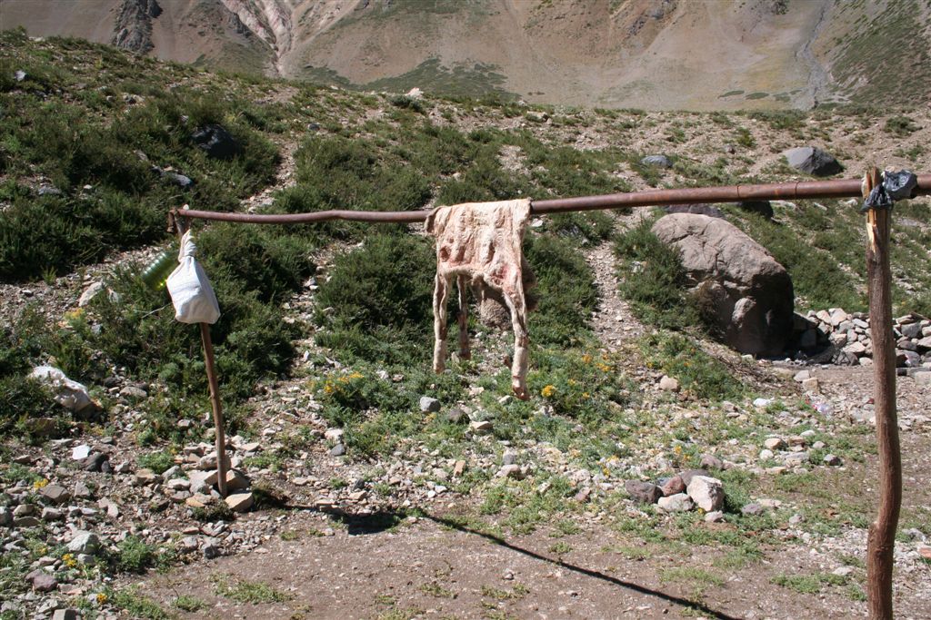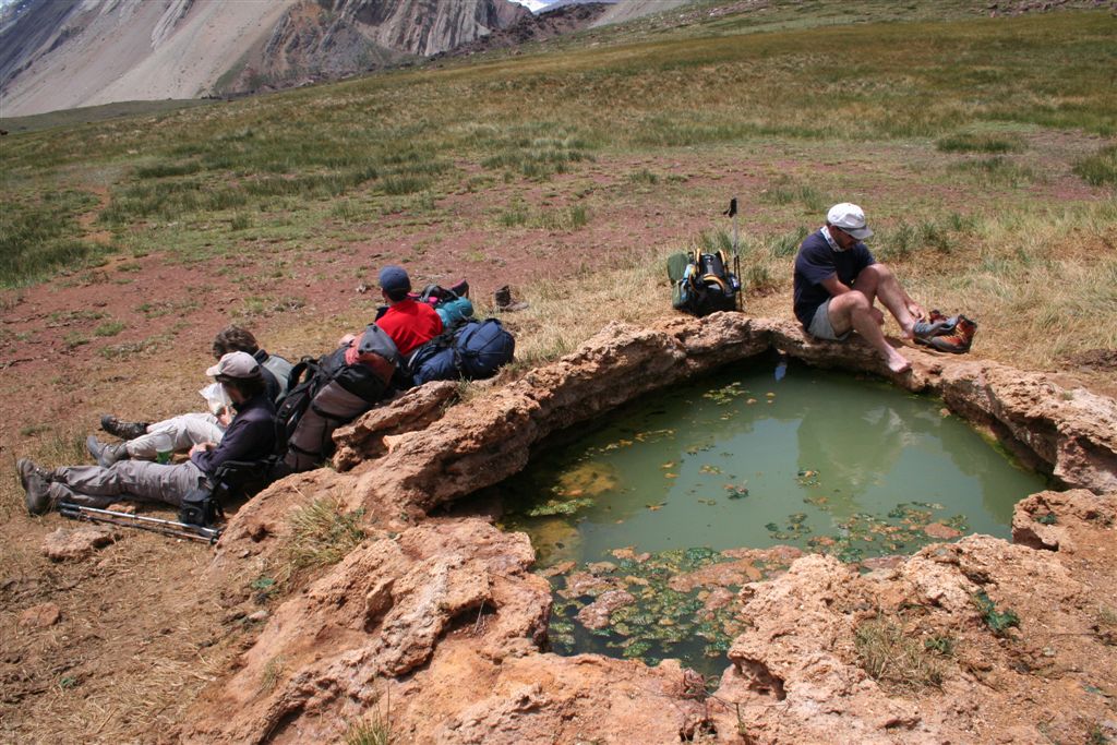 Sa.29.12  Abmarsch um 10.00 Nachmittags treffen wir bei einer Rast an einem Mulitreibercamp auf Ulli und Alvaro, ca.2 Stunden vorher hatten wir sie bei einem Abstieg  einer  Flussmündung bereits gesehen (Abstieg von 180 Höhenmeter)!! Ein wohl seltenes Schauspiel können wir heute bewundern Majestätisch kreisen doch tatsächlich 5 Kondore zur gleichen Zeit am Himmel, voller Neugier überfliegt bzw. dreht immer wieder ein Exemplar eine Runde über uns. (Die Kondore sind die Könige der Anden) Nachmittag erreichen wir das Banos Tupungato auf 3000m, Ulli hatte ein Vollbad vor unserem erscheinen genossen. Wir begnügten uns mit einem erholsamen Fussbad. Beim Verlassen der Therme sehe ich wie eine  Kuh über denn 1,30 m hohen Schutzzaun springt, ein Kalb durchbricht das Hindernis durch den Stacheldraht, unglaublich diese wilden Kühe, im eingezäunten Bereich sehen wir eine tote Kuh liegen, wahrscheinlich zog dies die Aas fressende Gross Vögel an. Spätnachmittag erreichen wir zufrieden über die ausdauernde Tagesetappe unser Camp am Estero Tupungatito auf 3200m.