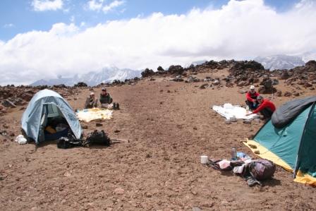 So.30.12.Verstauen der Verpflegung und Ausrüstung, die für den Tupungato benötigt wird, in den reisfesten (Aconcaqua) Sack, Er wird unter einen Fels gelegt und mit Steinen abgedeckt. 9.45 Uhr, Aufstieg auf das Lager zum Tupungatito, die Spur von unseren Freunden geht im Sand verloren eigentlich unlogisch aber so geschehen. Wir steigen direkt die sehr steile Flanke auf,  mühsam geht es Bergauf, wir gewinnen  aber unter schwerster Anstrengung deutlich an Höhe, die Senkrecht am Himmel stehende Sonne tut ihr übriges dazu, um uns zu schwächen. Nachmittags erreiche ich denn  von den Freunden gewählten Lagerplatz auf 4200 m, nicht schlecht  1000m Höhendifferenz, und das in wenigen Stunden, ja wir hatten uns nicht verfehlt und dies ohne jegliche technische Hilfsmittel wie Karte oder Kompass und ohne Absprache. Jens und Bodo kommen alsbald ebenfalls erschöpft aber glücklich an. Wir beginnen gleich mit der Schneeschmelze (Folie), nebenher werden die Zelte aufgestellt, das erste Schmelzwasser dient zum Durstlöschen, sehr schnell haben wir ca. 10 L. Trinkwasser aus dem Büsserschnee gewonnen, das wird uns selbst für das Frühstück und denn Anstieg zum Tupungatito reichen. Gute Arbeit von uns, übrigens für Bodo war das Schmelzen auf diese Art ein ganz neuer Eindruck.Tatsächlich  benötigten wir nur 6 Kartuschen an Camping Gas, für die kompletten 17 Tage, natürlich stark bedingt durch das Schmelzen mit der umweltfreundlichen und kostenlosen Sonnenenergie.
