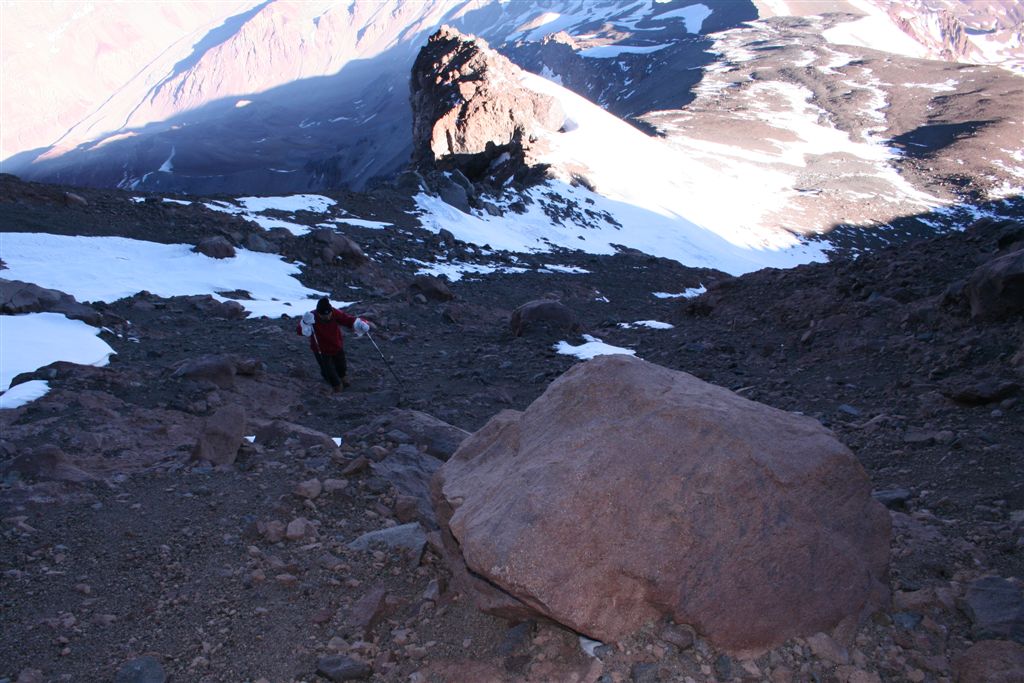 Der Abstieg geht zügig und tatsächlich kommt Wärme in die fast schon eingefroren Gliedmassen, nach einer ½ Std. erreichen wir schon die Canaleta. Mittlerweile haben die warmen Strahlen der Sonne den Schnee etwas aufgeweicht, so dass der Abstieg dieser doch heiklen Passage sehr vereinfacht wird, nachdem wir gequert haben, sehe ich in weitere Ferne Bodo im Abstieg, Gott sei Dank scheint alles OK zu sein, ich gebe Jens Bescheid, dass ich versuche in einzuholen, um nach im zu schauen. Nach ca. 25 Minuten gelingt es mir, ihn zu erreichen. Einige Meter gehe ich neben ihm, er bemerkt mich aber nicht. Ich nehme dann direkt Kontakt auf, wie geht es dir? ist alles klar? Er antwortet mit ja, dies kommt mir nicht so vor. Kommst du aus eigener Kraft bis zum Lager? Dies beantwortet er ebenfalls mit ja. Sei so gut gib mir deinen Rucksack! Er übergibt ihn mir. Warum ist der so schwer, hast du deinen Tee nicht getrunken? Dieses Mal folgte ein Nein. So ne Scheiße entfuhr es mir, du musst doch etwas Trinken. Und tatsächlich nimmt er einen Becher zu sich. Ich gehe jetzt voraus zum Lager und schaue das ich Schnee zum Schmelzen bringe! Jens wird auch bald bei dir sein. 2 1/2 Std. nach dem wir den Rückweg angetreten hatten, stand ich wieder an unserem Lager.