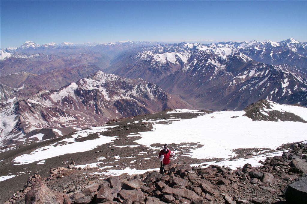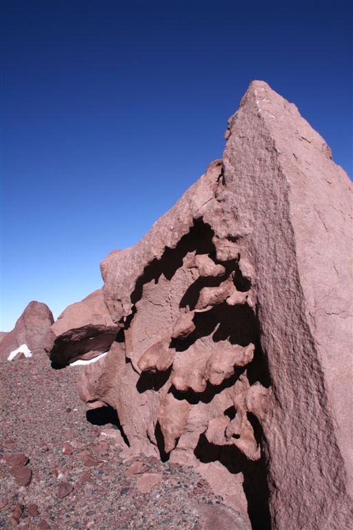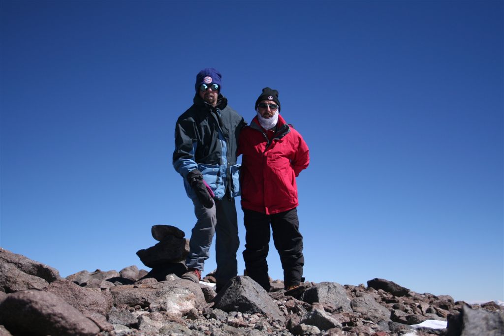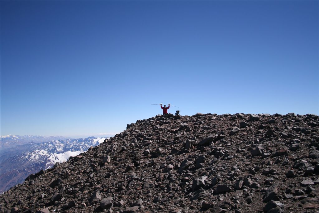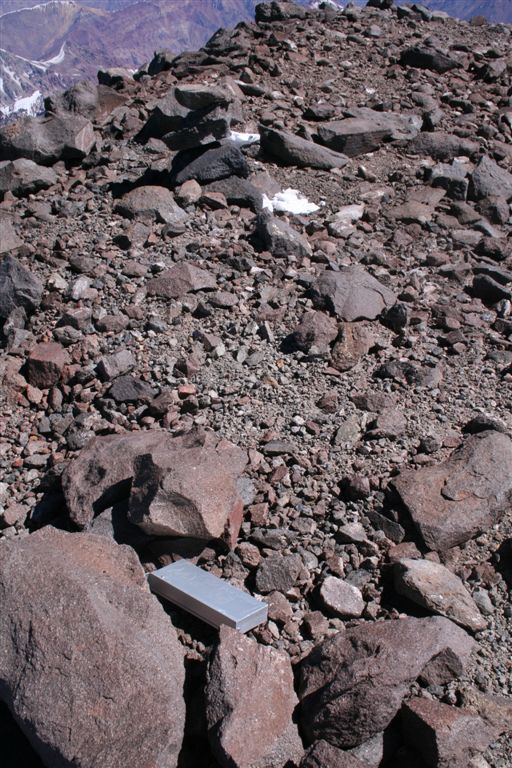 Samstag 5.Jan.Das Piepsen des Weckers weckt uns aus dem Halbschlaf, ja es war mehr Erholung als Schlaf, eigentlich war dies zu erwarten, das Thermometer zeigt im Zelt -4° Grad an, draußen ist es um einiges kälter. Ich nehme Kontakt mit Bodo auf, damit er für den Tag Teewasser aufkocht, er sitzt bereits in den Startlöchern, damit der Körper nicht zu stark auskühlt, wird das so genannte Frühstück, es gibt Tee mit Keksen, auf wenige Minuten beschränkt. Rein in die eisigen Stiefel, Jacke anziehen und schon sind wir vor dem Zelt. Als Gepäck dient ein Leinenbeutel, darin verbergen sich die Steigeisen, Müsliriegel sowie die Thermoskanne. Die Utensilien wie Gletscherbrille, Sonnenmilch, Höhenmesser, Handy, Geldbeutel, Brustbeutel befinden sich in der Jacke. Um 6.00 Uhr bewaffnet mit den Teleskopstöcken und gut gelaunt begeben wir uns Richtung Summit, 850 m beträgt die Höhendifferenz in 5 Std. sollten wir On Top sein, die (Argentinier)Spanier benötigten dafür 8 Std. Jens war der Pacemaker, sein Tempo war OK, es lief gut, die Atmung bzw. der Puls waren absolut angepasst, eine Unterhaltung ohne sich zu verschlucken funktionierte. Eine halbe Std. später dämmerte es schon, um 6.45 Uhr erleuchtete die Sonne den höchsten Berg Südamerikas. Noch waren wir gemeinsam unterwegs, langsam fiel die Kälte über die schwächsten Glieder, die Hände und Füße, herein, ja wir dürfen nicht langsamer werden sonst geht die Blutzirkulation zurück. Das Gelände wird steiler, wir bewegen uns schon seit einiger Zeit leicht rechts (Westlich) im griffigen Schnee. Immer wieder stoßen wir auf Spuren der Vorgänger, das erleichtert das Gehen und gibt Sicherheit auf dem richtigen Weg zu sein. Bodo kann oder will nicht denn Anschluss halten, wobei das Tempo nicht forciert wurde, klar die Luft wird dünner und kälter wird es auch noch, schon seit einiger Zeit habe ich die Führung übernommen, ich setze mich immer wieder kurz ab um die ideal Route zu finden, was mir auch sehr gut gelingt Jens schließt wieder auf und das Spiel wiederholt sich. Jetzt befinden wir uns in der heißen Phase, das Gelände ist nun ca.40° Steil, ich spure so gut wie möglich, eine erste Schlüsselstelle, ein Felsblock, wird rechts umgangen, um ihn wenige Meter später zu erklettern. Es bleibt aber weiterhin etwas ausgesetzt. Der relativ tiefe Schnee lässt einen guten Tritt zu, so dass wir von der Benützung der Steigeisen absehen. Wir sind sehr mit uns beschäftigt, aber Bodo haben wir nicht vergessen. Ja die Spur ist gelegt, wird er soweit kommen? Diese Frage beschäftigt uns zwar, aber so richtig helfen können wir nicht, aber eine gute Spur legen wir ihm. Sicher ist, dass wir die Route nach unten nicht einsehen können. Es kommen jedenfalls Zweifel auf ob er stark genug ist. Bei einer Unterhaltung sprachen wir darüber, dass genügend Reserve für den Abstieg einkalkuliert werden muss, also niemals die Schmerzgrenze angetastet werden darf. Wir wollten ihn zwar noch nicht aufgeben, dieser Gipfel war wahrscheinlich zu weit entfernt für ihn, hatte er doch bei einigen Etappen seine lieben Probleme. Nachdem wir uns bis an eine Felswand ohne größere Ängste vorgearbeitet hatten, galt es jetzt ungefähr 5 m zu queren, sehr vorsichtig drückte ich die Kanten der Schuhe in den harten Schnee mit wenigen Schritten erreichte ich wieder Fels unter den Füssen. Jens folgte als er plötzlich weck rutschte, glücklicherweise fing er sich rasch wieder, ein erneuter Versuch brachte ihn dann ohne Probleme auf die andere Seite. Die nächsten Meter in der sehr engen und schattigen Rinne„Canaletta“ verliefen dann ohne Schwierigkeiten, leider bewegten wir uns trotz der mittlerweile hoch stehenden Sonne im Schatten, zu allem Unglück wurde der Wind stärker. Der Abstand zwischen uns wurde immer größer, als ich die Rinne durchstiegen hatte, nützte ich den Abstand für eine Pinkelpause, dabei verlies ich die Aufstiegsroute nach Osten, leider waren meine Hände so kalt, dass ich nicht einmal meine Kamera für ein Bild nutzen wollte. Trotz alldem war mir jetzt schon klar, dass ich den Gipfel erreichen werde, was sollte mich noch aufhalten, keine Wolke trübte den stahlblauen Himmel und mit dem Wind werden wir wohl klar kommen. Ich verlies den einigermaßen windgeschützten Platz, an dem ich mich nieder kauernd schützte, in der Hoffnung das Jens auf meiner Höhe war. Tatsächlich hatte er diese Stelle bereits passiert, in Windeseile hatte ich ihn eingeholt, „Jens wie schaut es aus bist du gut drauf ist der Gipfel drin“? Die Antwort war ein klares ja, noch aber trennen uns ca.250 Höhenmeter von diesem Ziel. Ablenkung auf diesem Weg stellen die absolut verrückten, von Wind und Wetter geformten weichen Vulkansteine dar, die immer wieder ein Staunen hervorrufen. Unsere Konzentration ist aber klar auf den Berg gerichtet, wie es ausschaut trennt uns nur noch ein Rücken vor dem Gipfelaufschwung, das Gelände erweist als absolut trittfest, trotz des Vulkangesteins sitzt fast jeder Schritt ohne gleich wieder abzurutschen (die Teleskopstöcke sind hier unendberlich ), nur noch wenige Meter sind es bis zum Westgipfel, er ist zwar nicht der Höchste von denn dreien Tops, gilt aber als eigentlicher Gipfel, wie auch das Gipfelbuch, gestiftet von Banco de Chile, beweist! Zufrieden, aber ohne Euphorie, komme ich um 10.30 Uhr nach 4,5 Std. Aufstieg an, irgend etwas bremst mich aber um glücklich zu sein, liegt es daran das Bodo den Gipfel nicht erreichen wird. Ich kann mir diese Frage selbst nicht beantworten. ja die Selbsteinschätzung in die eigene Fähigkeit, sowie die Erfahrung am Gipfeltag der vorausgegangenen Großen Touren, lassen schon früh am Aufstieg erkennen, ob das Ziel erreichbar ist. Jens trennen noch wenige Meter bis zu einem weiteren großen Erfolg, sein 3. Gipfel bei 3 Versuchen eine Erfolgsquote von 100 %. Ein Bild hält diesen Moment fest. Interessant sind seine so genannten Überhandschuhe, als Windstopper dienen Plastiktüten