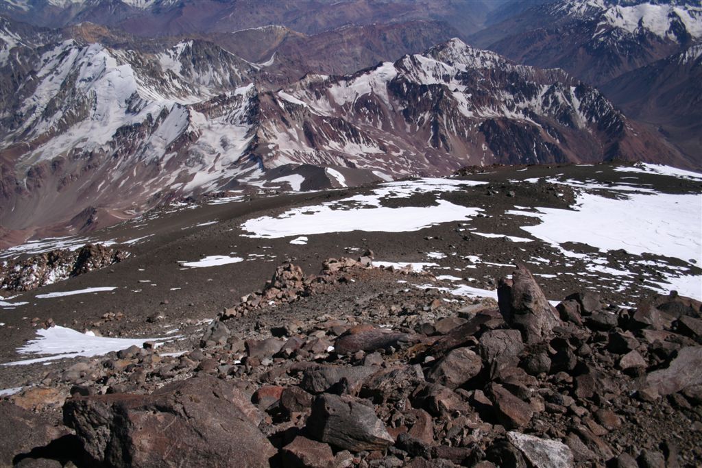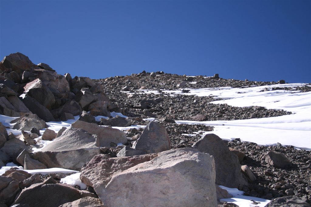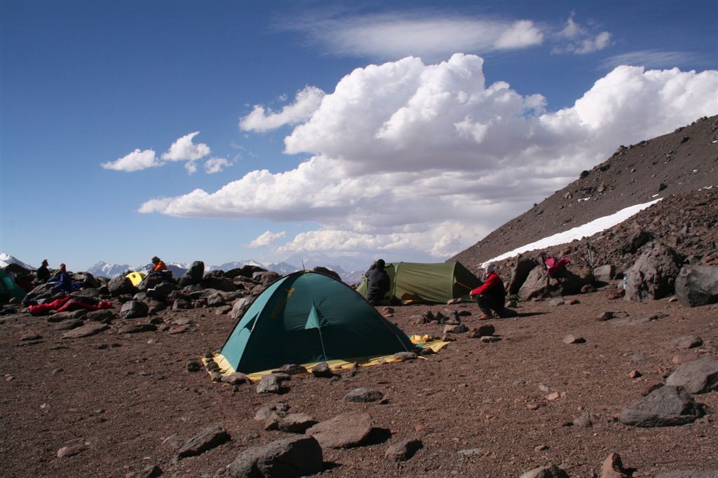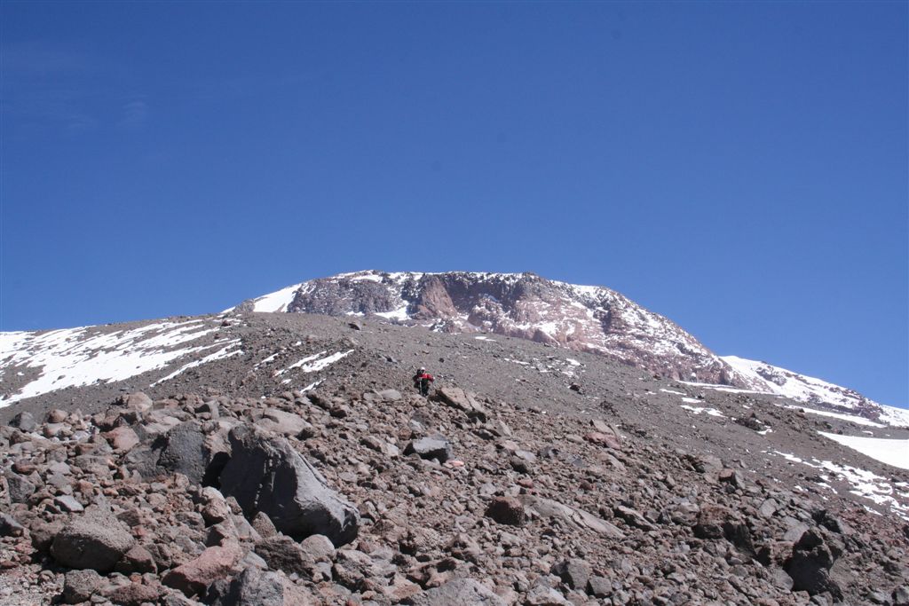 Die Spanier hatten dies bereits verlassen. Schnell waren die Töpfe mit Schnee gefüllt und im Windschatten positioniert. Die beiden Helden, jeder auf seine Art, erreichten nicht viel später das Höhencamp, sichtlich gezeichnet legten wir uns alle zum erholen in die Zelte, jetzt in der Ruhephase war leichter Kopfschmerz zu spüren. Eineinhalb Std. Ruhe gönnten wir uns, in dieser Zeit war der Schnee trotz der Kälte weitgehend geschmolzen, so dass wir, obwohl kein Durst vorhanden, doch Flüssigkeit zu uns nehmen konnten (mussten). Eines war klar, dieses Camp müssen wir räumen, ein Abstieg in das nächst tiefere Lager ist dringend anzuraten, eine Akklimatisierung war hier nicht mehr möglich, und Bodo sah gar nicht gut aus, er hatte etwas abbekommen. Wir bauten sein Zelt ab und verstauten so viel von seiner Ausrüstung wie es ging, in unsere Rucksäcke. Um 16.00 Uhr waren wir schon unterwegs, Bodo der das Lager zeitig verlies war weit voraus, wir sollten ihn erst nach Verlassen des Grenzgrates erreichen. Dann sorgte er noch für ein unschönes Highlight, nach Verlassen des Grates kam er ins Straucheln und landete ziemlich unsanft in der Asche dieses Vulkanes, eigentlich kommt man zur Hilfe, aber wir waren zu ausgelaugt und das Gelände erforderte doch Konzentration, so musste wir unweigerlich die Szene verfolgen, es dauerte eine ganze Zeit bis Bewegung in ihn kam, aber er berappelte sich und stand dann doch wieder auf den Beinen. Als ich ihn eingeholt hatte, war das Nachtlager zu sehen, von weitem konnten wir feststellen, dass die Amerikaner ihr Quartier nach oben verlegt hatten. Wir werden das Camp mit ihnen teilen, Platz war ja genug vorhanden. Es war ein erhabenes Gefühl als Gipfelsieger im Hochlager einzulaufen, spätestens jetzt wurde es klar, ja es ist wahr, trotz der Euphorie drückte der doch schwere und auch kaputte Rucksack, (ein Trageriemen war schon 2 Tage davor gerissen, mittels Schuhbändel konnte er wenigstens nutzbar gemacht werden) auf den malträtierten Körper, mit einer flotten Bewegung befreite ich mich von dieser Last, erstmal hinsetzen und durchatmen. Jetzt waren wir im sicheren Terrain, der Körper wird es uns danken. Jens und Bodo näherten sich ebenfalls dem Camp, auch ihren Gesichtern war die Anstrengung des Tages erkennbar, aber diese Belastung ist vergänglich. Professionell, wenn man dies so nennen konnte, richteten wir uns für den Aufenthalt ein, nur 20 Meter entfernt gab es sogar fließendes und relativ klares Wasser (die Temperatur musste gestiegen sein, zwei Tage zuvor, also beim Zustieg, war das noch nicht so). Jetzt galt es den Körper zu versorgen, das gute Sprim machte das Wasser schmackhaft, die in Bergsteigerkreisen beliebte Suppe aus der Packung wurde mit unseren gefundenen Suppennudeln verdickt. Während wir unser Mahl zubereiteten, erkundigten sich die Amis nicht ohne zu gratulieren nach dem Verlauf und den Bedingungen beim Aufstieg, einer von ihnen Sprach recht gut Deutsch, so war der Info austausch noch einfach und konkreter. Ich versprach, gegen später wenn es dunkler wird, die Bilder zu zeigen, die ich geknipst hatte(am Abend ist es erst möglich auf dem Display etwas zu erkennen, die Sonnen- oder auch UV-Strahlung ist hier extrem). Da am Tupungato keine Routenbeschreibung vorliegt, ist eine Wegfindung nicht einfach, auch wir hatten das Glück auf Spuren bzw. Infos der Spanier zurückgreifen zu können, wichtig aber ist es gewesen das kein Schnee fiel, ansonsten wären die Spuren darunter verborgen gewesen. Es darf behauptet werden, dass dieser Berg immer mehr Besteigungen aufweisen wird, gilt doch die Route als abwechslungsreicher und schöner als sein benachbarter und übervölkerter Pendant, von den Kosten der Besteigungsgebühr mal ganz abgesehen. Verschwenderisch genossen wir 1 ½ Packungen Traveller-Lunch, nun wussten wir, dass es nur noch zwei lange Tage bis zum erreichen der Zivilisation und all seinem Luxus sind, eine Dosierung war nun nicht mehr nötig, selbst wenn Unvorgesehenes eintreten sollte, ist ein Verzicht auf eine Mahlzeit kein Beinbruch mehr. Um ca. 20.30 Uhr "klopfte" ich am Zelt des Amis an, Sie hatten sich zwar schon aufs Ohr gelegt, aber sofort richteten sie sich auf und öffneten das Zelt, eine Unterhaltung mit ihm war zwar nur auf Englisch möglich, doch meine Sprachkenntnisse waren diesbezüglich ausreichend, so beschrieb ich ihm Anhand der Bilder nicht nur die Route, sondern konnte ihm auch wichtige Punkte und Höhenangaben, wie der Platz für das Camp, sowie strategische wichtige Punkte auf seiner Karte markieren. So konnten wir uns für das Esspaket revanchieren. Fast hätte ich es vergessen, diese amerikanische Expedition hatte sogar Sauerstofflaschen im Equipment, nicht umsonst begleiteten 10 Mulis das Team bis auf das Basecamp in 4400 m. Logistisch waren wir dagegen Weltmeister, uns gelang es, alles in einen Rucksack zu packen, umso stolzer können wir auf das erreichte sein.