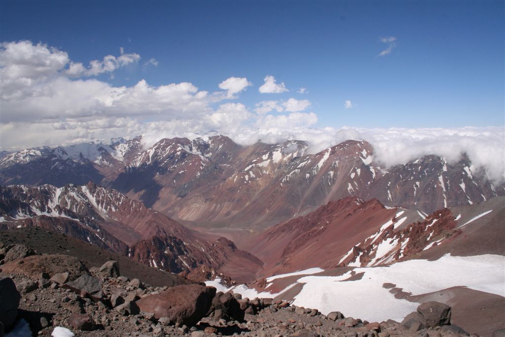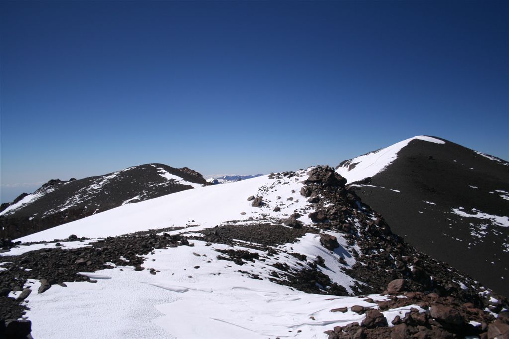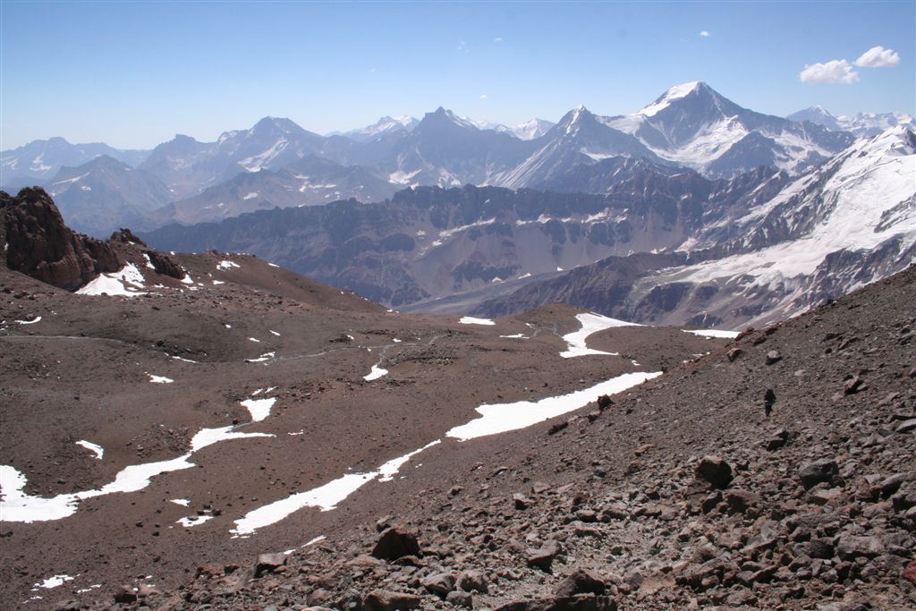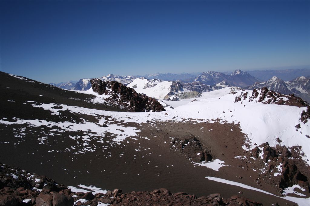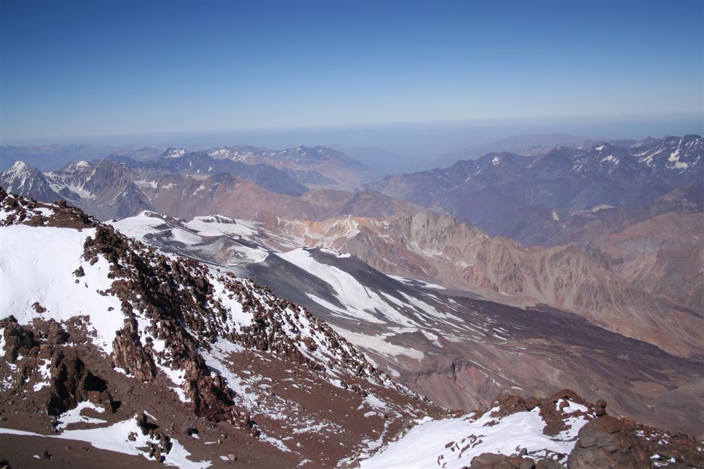 Die Spanier hatten dies bereits verlassen. Schnell waren die Töpfe mit Schnee gefüllt und im Windschatten positioniert. Die beiden Helden, jeder auf seine Art, erreichten nicht viel später das Höhencamp, sichtlich gezeichnet legten wir uns alle zum erholen in die Zelte, jetzt in der Ruhephase war leichter Kopfschmerz zu spüren. Eineinhalb Std. Ruhe gönnten wir uns, in dieser Zeit war der Schnee trotz der Kälte weitgehend geschmolzen, so dass wir, obwohl kein Durst vorhanden, doch Flüssigkeit zu uns nehmen konnten (mussten). Eines war klar, dieses Camp müssen wir räumen, ein Abstieg in das nächst tiefere Lager ist dringend anzuraten, eine Akklimatisierung war hier nicht mehr möglich, und Bodo sah gar nicht gut aus, er hatte etwas abbekommen. Wir bauten sein Zelt ab und verstauten so viel von seiner Ausrüstung wie es ging, in unsere Rucksäcke. Um 16.00 Uhr waren wir schon unterwegs, Bodo der das Lager zeitig verlies war weit voraus, wir sollten ihn erst nach Verlassen des Grenzgrates erreichen. Dann sorgte er noch für ein unschönes Highlight, nach Verlassen des Grates kam er ins Straucheln und landete ziemlich unsanft in der Asche dieses Vulkanes, eigentlich kommt man zur Hilfe, aber wir waren zu ausgelaugt und das Gelände erforderte doch Konzentration, so musste wir unweigerlich die Szene verfolgen, es dauerte eine ganze Zeit bis Bewegung in ihn kam, aber er berappelte sich und stand dann doch wieder auf den Beinen. Als ich ihn eingeholt hatte, war das Nachtlager zu sehen, von weitem konnten wir feststellen, dass die Amerikaner ihr Quartier nach oben verlegt hatten. Wir werden das Camp mit ihnen teilen, Platz war ja genug vorhanden. Es war ein erhabenes Gefühl als Gipfelsieger im Hochlager einzulaufen, spätestens jetzt wurde es klar, ja es ist wahr, trotz der Euphorie drückte der doch schwere und auch kaputte Rucksack, (ein Trageriemen war schon 2 Tage davor gerissen, mittels Schuhbändel konnte er wenigstens nutzbar gemacht werden) auf den malträtierten Körper, mit einer flotten Bewegung befreite ich mich von dieser Last, erstmal hinsetzen und durchatmen. Jetzt waren wir im sicheren Terrain, der Körper wird es uns danken. Jens und Bodo näherten sich ebenfalls dem Camp, auch ihren Gesichtern war die Anstrengung des Tages erkennbar, aber diese Belastung ist vergänglich. Professionell, wenn man dies so nennen konnte, richteten wir uns für den Aufenthalt ein, nur 20 Meter entfernt gab es sogar fließendes und relativ klares Wasser (die Temperatur musste gestiegen sein, zwei Tage zuvor, also beim Zustieg, war das noch nicht so). Jetzt galt es den Körper zu versorgen, das gute Sprim machte das Wasser schmackhaft, die in Bergsteigerkreisen beliebte Suppe aus der Packung wurde mit unseren gefundenen Suppennudeln verdickt. Während wir unser Mahl zubereiteten, erkundigten sich die Amis nicht ohne zu gratulieren nach dem Verlauf und den Bedingungen beim Aufstieg, einer von ihnen Sprach recht gut Deutsch, so war der Info austausch noch einfach und konkreter. Ich versprach, gegen später wenn es dunkler wird, die Bilder zu zeigen, die ich geknipst hatte(am Abend ist es erst möglich auf dem Display etwas zu erkennen, die Sonnen- oder auch UV-Strahlung ist hier extrem). Da am Tupungato keine Routenbeschreibung vorliegt, ist eine Wegfindung nicht einfach, auch wir hatten das Glück auf Spuren bzw. Infos der Spanier zurückgreifen zu können, wichtig aber ist es gewesen das kein Schnee fiel, ansonsten wären die Spuren darunter verborgen gewesen. Es darf behauptet werden, dass dieser Berg immer mehr Besteigungen aufweisen wird, gilt doch die Route als abwechslungsreicher und schöner als sein benachbarter und übervölkerter Pendant, von den Kosten der Besteigungsgebühr mal ganz abgesehen. Verschwenderisch genossen wir 1 ½ Packungen Traveller-Lunch, nun wussten wir, dass es nur noch zwei lange Tage bis zum erreichen der Zivilisation und all seinem Luxus sind, eine Dosierung war nun nicht mehr nötig, selbst wenn Unvorgesehenes eintreten sollte, ist ein Verzicht auf eine Mahlzeit kein Beinbruch mehr. Um ca. 20.30 Uhr "klopfte" ich am Zelt des Amis an, Sie hatten sich zwar schon aufs Ohr gelegt, aber sofort richteten sie sich auf und öffneten das Zelt, eine Unterhaltung mit ihm war zwar nur auf Englisch möglich, doch meine Sprachkenntnisse waren diesbezüglich ausreichend, so beschrieb ich ihm Anhand der Bilder nicht nur die Route, sondern konnte ihm auch wichtige Punkte und Höhenangaben, wie der Platz für das Camp, sowie strategische wichtige Punkte auf seiner Karte markieren. So konnten wir uns für das Esspaket revanchieren. Fast hätte ich es vergessen, diese amerikanische Expedition hatte sogar Sauerstofflaschen im Equipment, nicht umsonst begleiteten 10 Mulis das Team bis auf das Basecamp in 4400 m. Logistisch waren wir dagegen Weltmeister, uns gelang es, alles in einen Rucksack zu packen, umso stolzer können wir auf das erreichte sein.