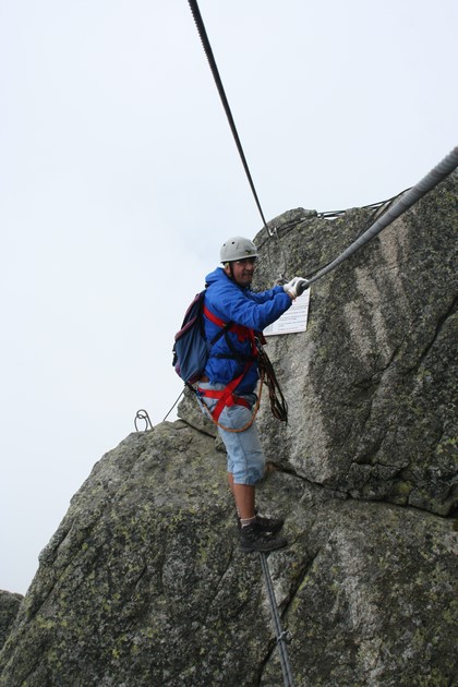 Sonntag 3.September: Wohl in den frühen Morgenstunden, beim Blick aus dem Toilettenfenster Wolkenlos, Sterne funkeln der Wind pfeift deutlich wahrnehmbar um das Haus. Ein schwieriges Unternehmen in das Zimmer zurückzufinden, beim ersten Versuch bin ich zu weit fast schon am Ausgang, der zweite Anlauf erfolgreich, kaum im Bett, begibt sich Humprey auf die Toilette. Ein Stock tiefer ist Bewegung, gegen 8.30 Uhr, wird der Schweinehund überwunden. Es ist sehr kühl, unangenehmer Wind, die Sonne wird die abgekühlte Luft in wenigen Stunden erwärmen, dies werden wir uns zu Nutze machen. Schon Obligatorisch das Frühstück, eine Nette Geste 4 noch Warme Eier gibt es dazu. Gut besetzte Gondeln fahren in kurzen Abständen. Claudia zeigt uns ein Bild vom Monte Camino ein Eiszapfen hängt an der Dachrinne der Rif. Capanna Renata 2366m, ja Sie hatte Recht mit der Aussage am Abend von 1 °C. Lassen uns noch ein wenig Zeit, nützt jeder auf seine Art. Rasieren etwas Proviant Mars und Apfel sowie Klettergurt und Helm einpacken. Die ferrata „Ciao Miki“ zum Monte Mars dem höchsten Gipfel mit 2600m eine Lohnende Unternehmung, Gehzeit allein für diese Tour 4-5 Std. Evtl. Abstieg zum Rifugio Coda, auf dem Normalweg dann zurück. 10.30 Uhr, Eitler Sonnenschein einige Wolken scheinen im Tal gefangen. Eine Stille und Ruhe liegt in der Luft, liegt es daran über das Wissen das heute Sonntag ist? an der Hütte plätschert ein Bach der wenige Meter Oberhalb sein Bett gegraben hat, zwei ältere Gebäude gehören zum Besitz. Eine Fahne am Gebäude aufziehen dazu ein Anstrich des Gebäudes, würde sicherlich Gäste anlocken. Mit etwas Aufwand wächst Saftig grünes Gras. Spätestens nach dem Aufstieg zur Bergstation, kommt auch der Körper auf Touren. Deutlich mehr Publikum flüchtet aus der Stadt in die nahen Berge, genießt die Ruhe von Einsamkeit sprechen wir heute nicht. Nobbe schert wie Gestern an selber Stelle aus, eine Toilette die Rettung. Gehen langsam Richtung See. Dort wo es gestern zum Klettersteig auf den Mucrone ging, liegt eine Weg Tafel am Boden, weist auf den Weg D23 Nördlich hin, Flori stellt die Mannshohe Tafel wieder auf, stützt dies mit Steine. Es steigt Kontinuierlich, kleiner Pfützen und Wasserläufe, Wassermangel herrscht hier nicht, an unzählig vielen Stellen tritt das Wasser an die Oberfläche. Das Gras ist dennoch sehr Stachelig, drückt sogar durch die Hose ein Griff stechend wie eine Nadel, die Atacama mit ihrer Trockenheit lässt grüßen. Das Rifugio Renata und der Monte Camino im Osten werden sichtbar. Ein Wunderschöner wie kleiner See, der Lago to del Monto Rosse 2191m, Glasklar spiegelt sich der Berg auf der Oberfläche. Eine Hobby Fotografiert übt sich hier am auf einer Hochfläche dem Übergang nach Norden. Die Fernsicht nach Westen von hier allein schon lohnend. Kurzer Abstieg über Blöcke und Steine. Gute Sicht zum Monte Mars, der Klettersteig ist noch nicht auszumachen. Die Weg spur verläuft über Platten und Erdiges Gelände. Hie und da am Fels ein Hinweis auf den „Ciao Miki“ Erste Personen begegnen. Die ferrata gibt noch Rätsel auf, alsbald klärt sich das, im Steig ist Bewegung. Kurzer Aufstieg zum Colle Cordan 2291m, ein Herz eines jeden Bergsteiger steigt plötzlich nach oben, der Monte Rosa Stock wird plötzlich Sichtbar Schneebedeckte Berge, dauert einige Sekunden bis ich alle Identifiziere, Signalkuppe, Liskamm, Breithörner ja dahinter ist das Matterhorn im Gipfelbereich zu sehen. Nur schade dass der Akku zu schwach ist, überhaupt fehlen dadurch von dieser Tour die so wichtigen Bilder. Auch im Vordergrund eine Interessante wie schöne Ecke für eine Wanderung etliche Touren möglich. Links unten leider verdeckt liegt das Valle de Gressoney, am Ende diesem sind Aufstiege zu Schutzhütten im Westlichen Monte Rosa Massiv. Gurte anlegen in diesem Windgeschützten Sattel, eine Ehepaar mit Tochter kommt vorbei, steigt Nördlich ab. Anlegen des Gurtzeugs, gehen in T-Shirt. Flori folgt Nobbe um 12.20 Uhr, der Einstieg auf der Südseite gut gewählt, relativ anspruchsvoll über steile Platten wenige Natürlicher Tritte oder Griffe. Jetzt in der Sonne sind das Stahlseil und der Fels in Händen, ein angenehmes Gefühl.