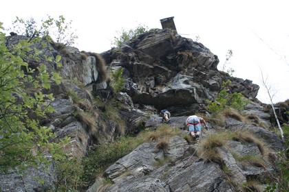 Etwas Klettertechnik absolut ausreichend, die Felsplatten im Gneis sind so gut wie ohne Natürliche Tritte und Griffe, dazwischen auch Abgesetzte Platten und Gehstellen, oder einfachere Abschnitte im noch wenig ausgesetzten Gelände. Scheint bis auf Flori allen recht viel Spaß zu bereiten, schnell kommt die Seilbahnstütze näher, die jetzt fast senkrecht über uns Thront. Schon nach 10 Minuten stehen wir am Fuß der Stütze der Ehemaligen Bergbahn. Schaut ja ganz schön Marode aus! Kein Wunder das wohl aus Sicherheitsgründen diese Anlage abgebaut wurde. Auch Interessant die Stütze kann noch immer von innen mittels einer stark angerosteten Eisenleiter bestiegen werden. Auf der Ostseite sind Trittbügel angebracht, die senkrecht nach Oben bis zu einer Seilbrücke führen. Zum Sichern ist parallel ein Seil angebracht. Technisch wohl kein Problem, auch der Einstieg in die 3 Seilbrücke bestens mit Griffen und Tritten versehen. Sicherlich ein Novum, eine Geniale Idee steckt da dahinter. Steige als letzter nach binnen 1 Minute bin ich an der Felswand. Jetzt auf der Höhe, Das andere Bild dieser Stütze. Wie einfach und mit welch Sicherheits- Denken doch damals das Seil durch die Rollen lief. Es quert wenige Meter nach rechts. Als ich um die Ecke gehe sehe ich die beiden in einer steilen Flanke, schaut Top aus. Es geht einige Meter eben Östlich. Ein etwas anderes Bild auf der Südseite, der Hang ist eher Terrassenförmig, Relativ Grün, Bäume und Pflanzen haben hier ein wenig Lebensraum gefunden. Der II Teil Toppt den ersten, der Gneis ist sehr abwechslungsreich wechselt ständig die Richtung. So richtig knackig wohl nicht, fordert allemal, der Spaß Faktor ist absolut hoch anzusetzen, die äußeren Bedingungen sind hervorragend. Selten richtig ausgesetzt. Am Notabstieg rechts, folgt ein längeres Geh Stück. Super Sicht auf Oropa, das perfekt im Talkessel auf einer abgesetzten Fläche liegt. Zufällig schwebt jetzt eine Gondel nach Oben, wenig später treffen sich die beiden etwas Unterhalb, es wechselt unter den Seilen der Bergbahn. Der letzte Teil steht an. Auf Höhe eines einzelnen Baumes, beginnen die Sicherungen die beiden Unterhalten sich während Humprey einsteigt, Rechts Oberhalb ein Überhang der Links in der Platte über Trittbügel umgangen wird. Es quert Rechts deutlich Oberhalb sind die Seile der zweiten Seilbrücke erkennbar. Nobbe und Flori sind schon an der Platte die zu einer freistehenden Felsnadel führt. Inmitten dieser leitet die 3 Seilbrücke an den Berg zurück, nur wenige Meter Tiefe der Blick Richtung Rinne. 4 Eisenbügel schon ist eine Rampe die nach links gequert wird erreicht. Jetzt folgt das Optisch wohl spannendste Stück. Ausgesetzt quert es in einer steilen Wand nach links oben, im Hintergrund die Seile der Bahn, wirken als wenn sie zum Steig gehören. Am Ende ein Überhang, der Optisch im nichts endet, hier hängt ein schlabbriges Seil nach unten, jetzt als Nobbe die Stelle bewältigt ist es klar, es geht senkrecht nach hinten um eine Ecke, wohl eine Komplizierte Stelle, es scheint die beiden hätten ein Problem damit, ja das umhängen des Karabiners, erschwert Grundsätzlich. Entscheidend war das Seil weit oben zugreifen, auf Zug gehen in dem man den Oberkörper nach hinten lässt bis eben das Seil Straff. Wenige Meter leichteres Gelände, der Ausstieg führt direkt an der neuen Seilbahnstütze vorbei. Der Sicherlich interessanteste der Biella Klettersteige endet auf einer Ebene weit unter dem Gipfel. Ein gegenseitiges abklatschen, die Kommentare mehr als zufriedenstellend. Der zustieg zu unserer Heimat, der letzten Tage ist gut am Hang zu sehen, die Hütte liegt genau an der Wolkengrenze. Ziemlich genau 1 Std. für die 200 Hm. im Klettersteig, angegeben ist er mit 1,5 Std. Ein bestens Markierter und einfacher Weg, führt in einem Bogen Anfangs Östlich danach zurück zum Ausgangs Punkt. Endet kurz vor dem Hütten Zustieg, Weg D13. Nicht ganz auf Anhieb ist der Rucksack unter dem Labyrinth von Steinen gefunden. 13.20 Uhr, kleinere Pause, ablegen des Klettergurts. Der vertraute Abstieg Oberhalb des Baches. Flori findet gefallen an einem „Findling“ sicherlich an die 5 Kg. Wie es scheint bleibt das komplette Bruchholz liegen, befinden wir uns wohl in einem Reservat. Auf Höhe des Hochseilgartens quere ich den Bach der etwas Wasser führt. Überraschend befinden sich mehrere Personen in der Anlage, schweben durch die Lüfte. Flori erscheint wenig später das Warten auf die beiden die einen Schlüssel für das Auto besitzen dauert etwas länger. Lecker der Ananas Saft aus dem Einkauf im Lidl. Leichter Wind bei 15 °C in 1250 m Seehöhe, passt doch. Überraschend sind die Getränke im Auto noch richtig Kühl geblieben. Humprey gönnt sich eine „Sterbehilfe“ so wird das Öttinger Bier bezeichnet. Wenig Betrieb an der Bahn, doch auf dem Gelände bewegt sich etwas.