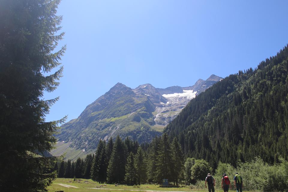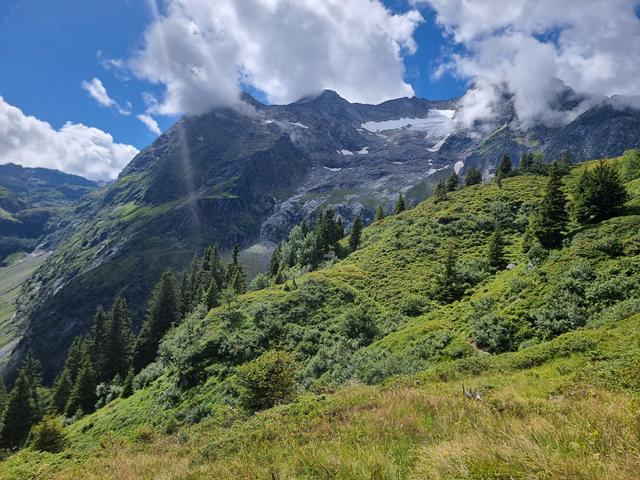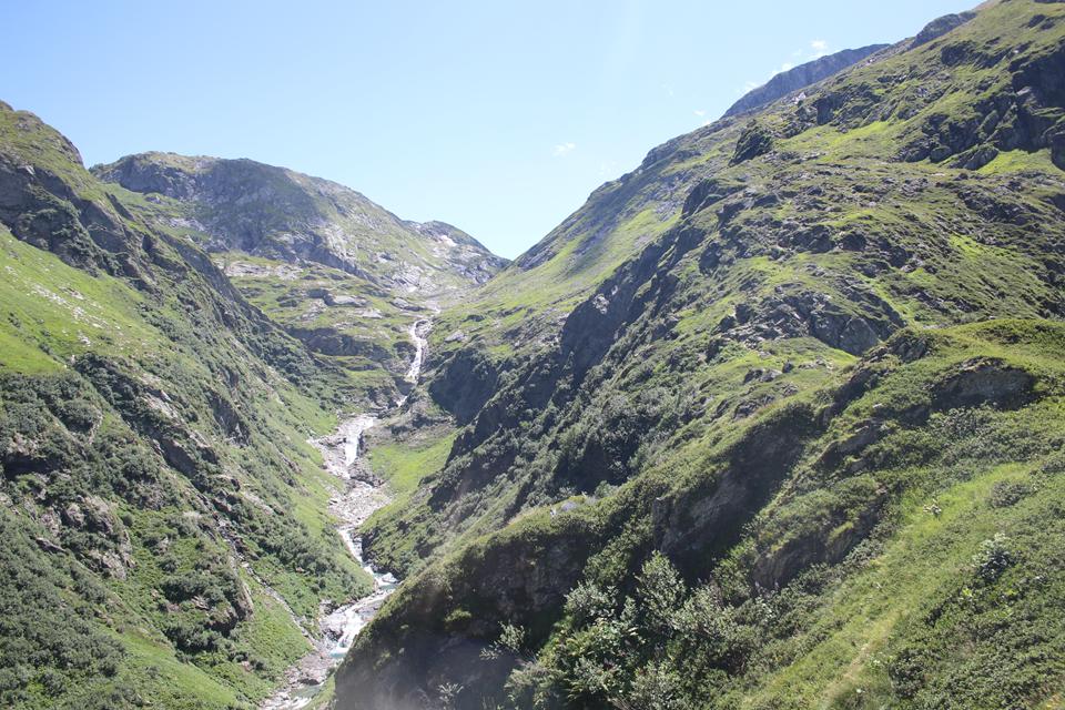 Einige Meter steht eine blaue Dixi Toilette, ein Gute Einrichtung. Nützen die Zeit während des Packens für ein Vesper und Bier, WPO öffnet mit seiner Schildmütze ein Bier, was es doch alles gibt, ein Flaschenöffner ist angebracht, wir testen das mit Freude. Ein Heli wird Wahrnehmbar, kurz später passiert er uns, am Hacken hängt ein Material Sack landet nahe der Brücke. Das Wetter ist absolut Top, Sonne satt bei 20 °C. ein kleiner Rucksack ist heuer ausreichend, auf Gletscher Ausrüstung kann dieses Jahr verzichtet werden. Der Piz Miezdi mit seine 2791 m überragt. Rechnen wir mal vorsorglich mit 4 Std. für den Aufstieg, sind wir gut on Time. Für Humprey liegt es lange zurück an einer Profitour teilgenommen zu haben. Hingegen ist WPO ein wesentliches Bestandteil dieser Veranstaltung. Gestärkt und Fidel wird das Gepäck gewogen, Auf den Schultern von Stuif lasten 11 Kg samt dem Wassersack, WPO steigert das um ein ½ Kg, Iris hatte ihm wohl 5 Kg Futter vorbereitet, Humprey und Olaf 7 Kg, mit der Kamera liege ich bei 8 Kg, Gleich am Start eine Weg Tafel ohne Zeitangabe. 12.33 Uhr, die Richtung ziemlich genau Südlich, noch ist das Val Sumvitg nur bedingt einsehbar. Eine Schotterstraße steigt nur langsam an, die Bäume reichen Anfangs bis an die Straße. Moderat der Schritt Humprey nützt die Stöcke die die drei am Rucksack tragen. Ein Lüftchen könnte nicht schaden. Links auf einen Lichtung Weiden hinter einem Weidezaun sehr viele Schafe, die von mindestens 4 Hunden, die dieselbe Farbe nur etwas kleiner als die Schafe sind. Einer davon beobachtet uns auf schritt und Tritt. Der Weiße VW Bus der Hüttenpächter parkt in einer Bucht unter Bäume, daneben ein schwarzer Kleinbus. Rechts in das Seitental geht es zur Capanna Medels. Ab hier steigt es auf dem Wanderweg noch im Schatten stetig an. Wegteilung, überqueren den Rein über eine Brücke mit Gatter Richtung Muotta la Tieua. Eine Weg Tafel zur Terri Hütte, das ganze kehrt wir sind falsch. Nähern uns dem Wilden Tosenden Rein da Sumvitg. Parallel verläuft auch ein Weg. Die Rot Weißen Markierungen sind neu, es wird anstrengender das schwitzen beginnt, nach gut einer Stunde im nun offenen Tal, wird der Rein über eine neue Holzbrücke überschritten 1408 m, über viele kleine Stufen unter Getöse fließt das sprudelnde Wasser zu Tal. Ein Ehepaar hält sich am Wasser auf. Rechts abwärts zweigt der Weg zur Medelser Hütte und in das Tal ab. Wahrscheinlich war der Alte Weg warum auch immer nicht mehr sicher. Rechts der Piz Vial (3168 m) und Piz Valdraus (3096 m) mit ihren Gletschern.