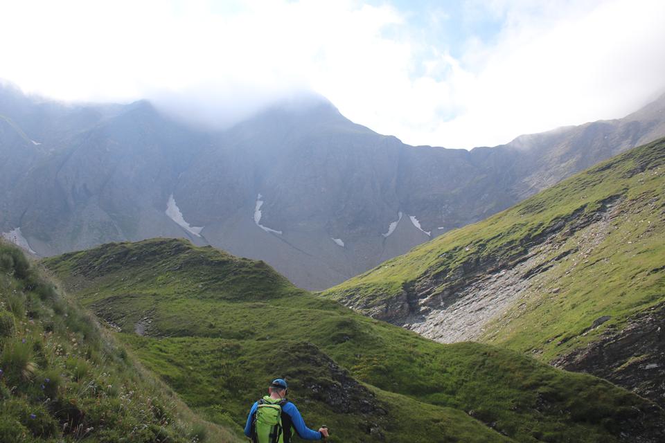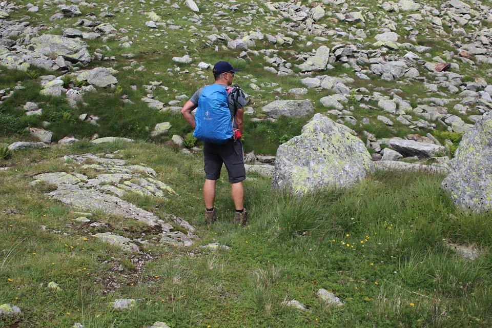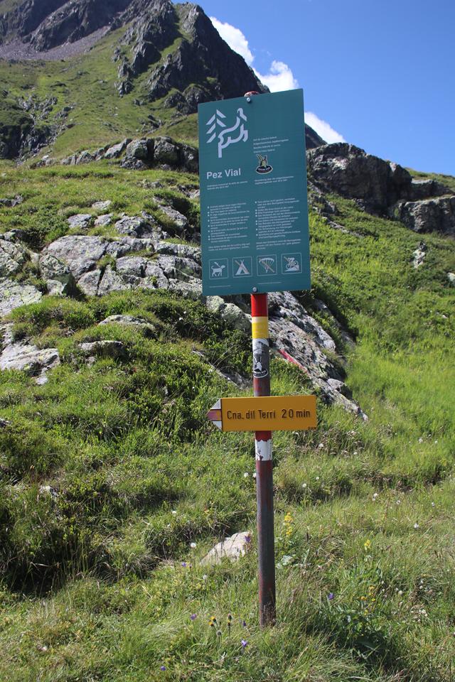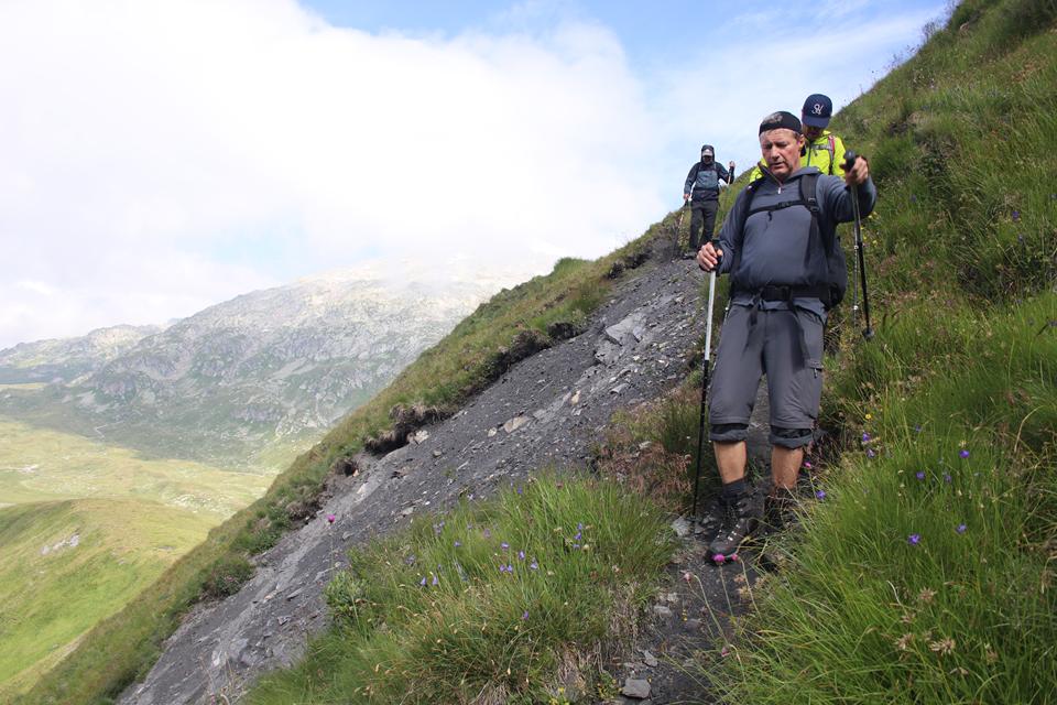 Heute provozieren wir das Wetter, gehe in Kurz. Versammeln uns am Tisch vor der Hütte. Tief unten im Tal fließt der Rein da Vigliuts das Wasser glänzt, Wolken ziehen auch auf der Ostseite Hoch, die Vermutung das der Weg im Tal verläuft der täuscht sich. Runcahez ist nicht angeschrieben aber Tenigerbad. 8.40 Uhr, der Abstieg steht bevor. Gesichert unter dem Hausberg quert es nach Nord Ost, Sehr viel Grün auf dieser Höhe, leichtes Gelände Rot Weiß Markiert, guter Weg dennoch ist immer wieder mal Orientierung gefragt das Ganze im Abstieg.