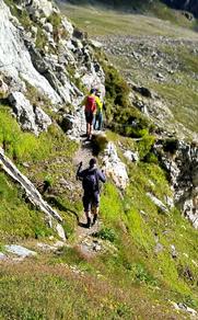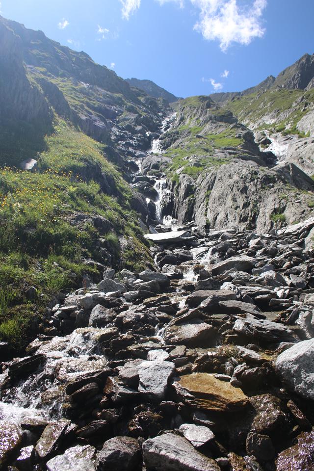 Der Aufstieg ähnelt dem des Adamello. Relativ viel Grün zwischen den Steinen prägt den Aufstieg. Der Wanderer der etwas später am Parkplatz eingetroffen ist, läuft vor uns. Der Kessel endet dementsprechend steiler das Gelände. Der Bach wechselt die Richtung kommt von Links Ost. Nach dem eine Rinne gequert wird, wechselt die Richtung im Hang in der "Frontscha zum Sumvitg". Ärgerlich es gibt kein Kontakt mit dem Wasser zum Trinken. Schöner Weg im Hang durch Farne und hohes Gras teils ist der Untergrund nicht zu sehen. Der Körper ist richtig gefordert. Olaf versucht einen Blick zu den Wasserfällen der deutlich hörbar aber nicht sichtbar ist, zu erhaschen, doch das Gelände ist zu Wild. Geschickt verläuft die Route teils gilt es die Füße hoch zu heben. Die Nachfolgenden gehen jetzt mit den Stöcken. Zum Glück ist es relativ schattig. Eine kurze Pause zum beruhigen des Puls. Die Richtung wechselt Süd-Westlich, tief unten das Wasser das aus der Greina kommt. Nicht mehr ganz so steil der weitere Abwechslungsreiche Aufstieg an einem später auf einem Grünen Rücken. Teils auch Kettenversichert, erreiche den Wanderer, folge ihm in kurzem Abstand. Wie gerufen kommt ein kleiner Wasserlauf links des Weges, Sauge regelrecht das Nass auf. Absatz für Absatz gewinn an Höhe und das in der prallen Sonne. Am Horizont begrenzt der Muot la Greina auch dieser ist stark vom Grün der Pflanzen geprägt. Die Sicht. Die Hütte ist noch nicht sichtbar. An einer Weg Tafel setze ich mich mit einem Hallo zum Vorrausgehenden. Er kommt aus Sigmaringen, seine Freundin arbeitet auf der Terri Hütte. Er ist ein Weltenbummler Arbeitet als Land Maschinen Mechaniker. Er weilte schon in Bariloche (Argentinien). arbeitete in Kanada als Pisten Bulli Fahrer. Sie lernt Hotel Kauffrau ist das zweite Jahr in den Bergen auf einer Hütte. Sie werden nach Briegels ziehen ( gleich um die Ecke). Der Schwarze Wagen neben dem Fahrzeug der Pächter ist ihres. Unterhalten uns bis Olaf dazu kommt. Das ist für das Zeichen zum letzten Teil, es sind noch 20 Minuten. Auch wir setzen die Tour fort. Die Hütte liegt auf einer Anhöhe, ein Gerüst bestätigt die Umbau Maßnahmen, es folgt ein Abstieg bis zum Bach, füllen der Wasserflasche nach dem die Brücke überschritten war. Steige einige Meter auf, Steinplatten laden für eine Pause ein.