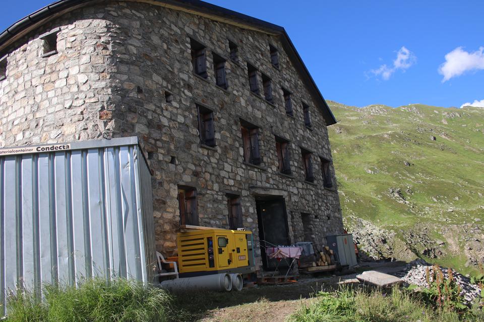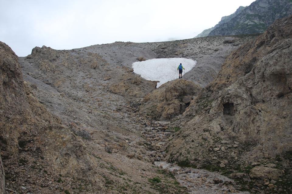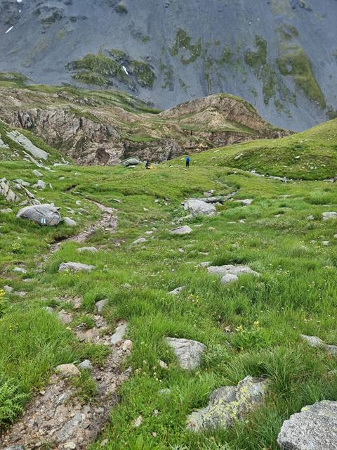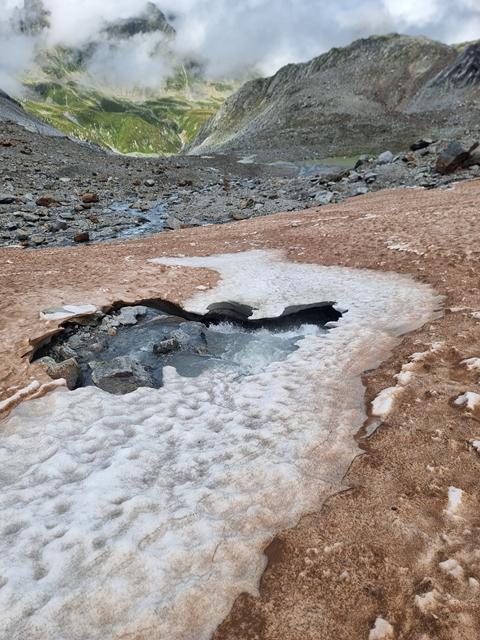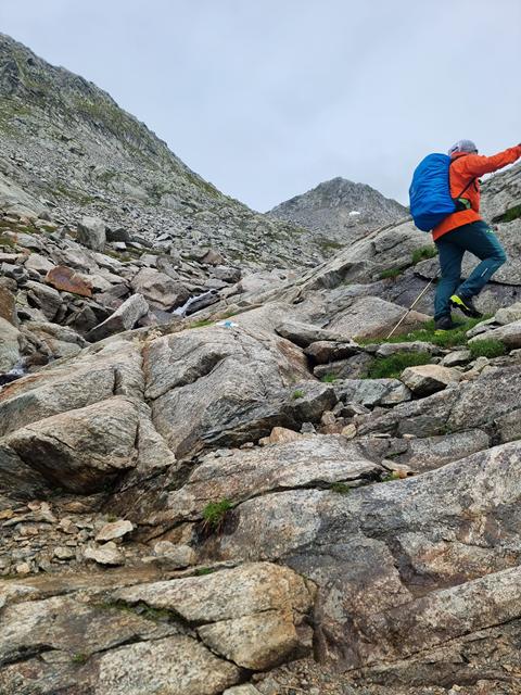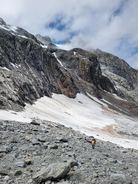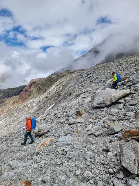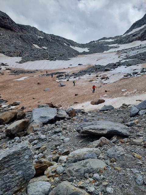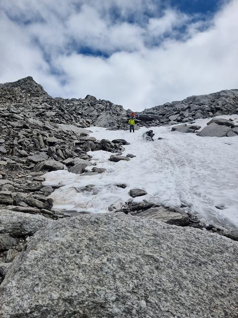 Relativ Nördlich die Route im Abstieg insgesamt sind es doch 700 Hm. Altschneefelder die auf dem wohl einstiegen Gletscher La lavaz liegen beginnen an der steilen Wand eines Grates der vor der Medelser auslaufen. Im Norden ziehen Grüne Hänge vom Tal auf eine ähnliche Höhe, Fotogen wie die Wolken nach Oben abziehen. Dort sollte es links Westlich zu unserem Tagesziel gehen. Holprig der Untergrund, von einem Weg kann da nicht gesprochen werden. Die Wegfindung erschwert sich zusehends, der Berg ist in Bewegung. Links die steilen Fels Wände teils liegt noch Schnee und Eis. Doch soweit wollen wir uns nicht nähern. Mal ein Pfosten oder Stange, keine klare Linie in diesem Kessel. Zwei Schneefelder laden Förmlich zu einer Coolen Abfahrt ein, für den der das zu nutzen weiß und kann, Humprey fällt genau in diesem Moment löse ich den Auslöser 😊Etliche Gänsegeier kreisen über der Scharte Mindesten 14 nach der Zählung. Halten uns Westlich in der Flanke das GPS sehr Hilfreich. Ein Rücken versperrt wähle links, nach der darauf folgenden Abfahrt treffen wir auf den Weg. Irgendwo im Norden wird Morgen der Abstieg verlaufen. Ein größerer Stein wird mir zum Verhängnis, er kippelt bringt mich aus dem Gleichgewicht, trotz einer guten Reaktion war ein Sturz zwischen den Steinen unvermeidbar, zum Glück nur wenn auch schmerzhafte Verletzung am Handballen. WPO zaubert ein erste Hilfe Set aus dem Rucksack. Ein Pflaster verschließt die Baustelle. Hilfreich durch das Zeitraubende Gelände sind die Markierungen an den Steinen. Wasserläufe mehren sich, Zeit zur Aufnahme für das Kostbare Nass. Eine Tablette veredelt. Während des Gehens bei Wärmerer Temperatur erwärmt sich das Kalte Wasser. Die Blöcke werden größer, Nähern uns dem Bach der in der Senke des Tal verläuft, was gestern noch ein Bächlein war ist heute ein Wildes Wasser. Es ist sehr Hilfreich wenn eine Person voraus geht. Verläuft der Hüttenaufstieg im Grünen Hang? Der Abstieg absolut anstrengend, als der tiefste Punkt erreicht wird, deutet sich der Aufstieg in einer Rinne aus Steinen mit Wasserlauf an. Gut gewählt ein passender Stein der von den Strahlen der Sonne erwärmt wird. Relativ Zeitnah sind wir vereint. Ärgerlich mein Handy schaltet wegen der Leere des Akkus ab, somit gibt es keine weitere Bilder. Stuif lässt Wissen es sind noch 1,2 Km bei 300 Hm. Fester guter Untergrund, gut begangen, mit kleinen Kehren, über mehrere Absätze. Es wird Grün, Nahrhafter Boden für das Pflanzen Wachstum, an geeigneter Stelle, überquert der Weg den Bach. Olaf wird es Warm er zieht die Jacke aus. Der Tag ging doch etwas an die Substanz das beweist Humprey der sich schmerzhaft das Knie anschlägt, außer Olaf beging ein jeder einen Fehler. Stetig am Hang auch in einer Rinne mit und ohne Wasser in Westlicher Richtung. Die Giebel Seite der Medelser Hütte am Grat erscheint im Blickfeld, ein freudiger Moment. Dennoch sind noch 2 Stopps zum Durchatmen angesagt. Ärgerlich wenn der Griff zum Auslöser der Kamera verwehrt ist. Eine Scharte wird erreicht, hier verläuft, ein Weidezaun der hier verläuft liegt am Boden. Rechts davor verläuft der Aufstieg. Kurz vor erreichen werden Personen aus Nord-West aufsteigend Sichtbar. Es ist 16.42 Uhr, ein doch Abwechslungsreicher Schwarz Markiert Übergang T4 der wohl weniger wegen den Schwierigkeiten, sondern die Weglosigkeit und Orientierung. Auch hier wurde mit einem vier eckigen wenn auch kleinen Anbau Erweitert.