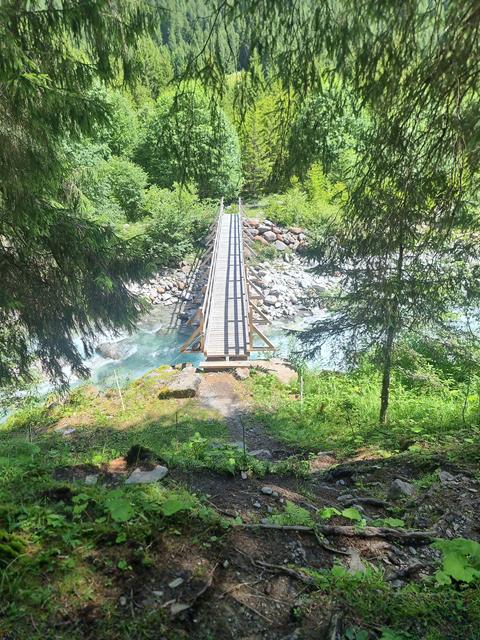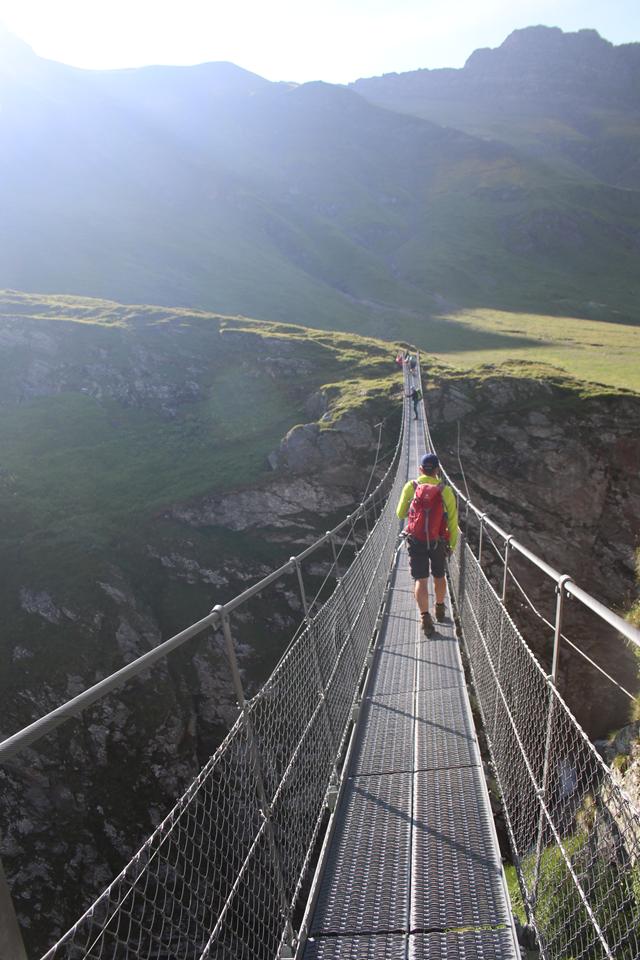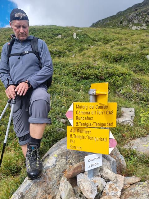 8.40 Uhr. Einem Abstieg folgt der Aufstieg Richtung Pass Diesrut, guter Weg in der Grünen Flanke des Muot la Greina. Es wird steiler, teils sichern Geländer vor der Tiefe. Gut zum Einlaufen, nach einer Rechts Kurve wird die 2018 gebaute Punta la Greina Sichtbar, eine 64 m lange Hänge Brücke 40 m über der Schlucht die der Rein da Sumvitg gegraben hat. Ein Touristisches Highlight. Folgen in Verlängerung der Brücke einigen Minuten einer Gruppe, bis sich Stuif meldet, die Richtung stimmt so nicht, das ganze kehrt. Zurück bis zur Weggabelung in der La Comona, jetzt wird es klar, die Greina Ebene läuft unter dem Pass Diesrut aus, diesem Zustieg sind wir gefolgt. Eine Weg Tafel u.a. auch das Rif Motterascio. Eine Wolkenfront aus Westen zieht auf. Eine Steppenlandschaft die wir ein Stück begehen. Leichter Aufstieg entfernen uns stetig vom Wasser schmal der Weg Stuif legt das gemache Tempo vor.