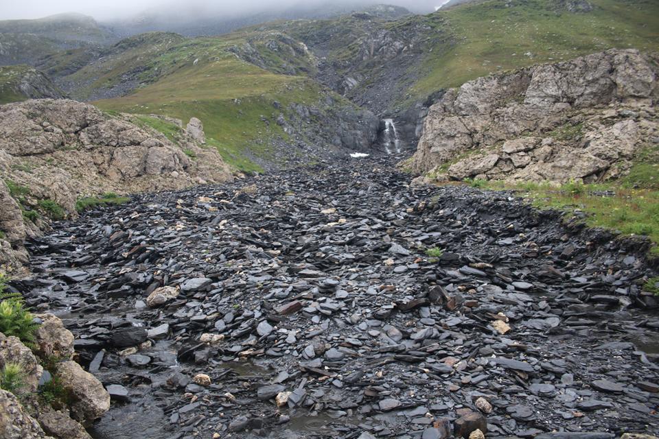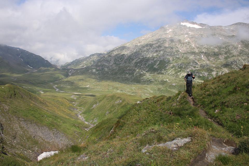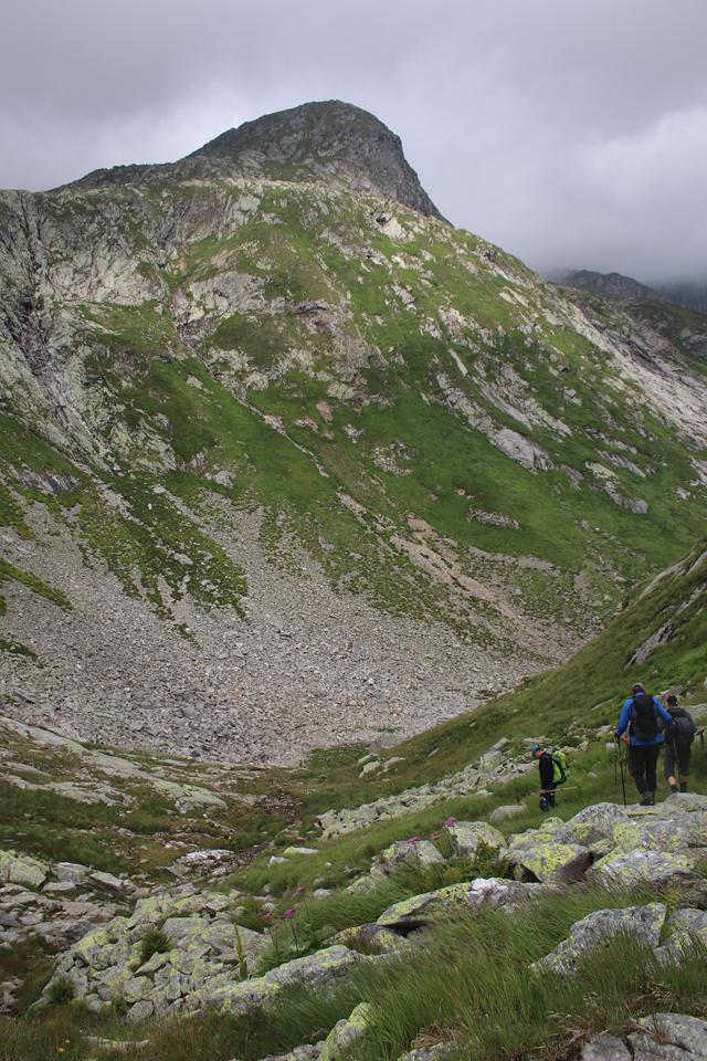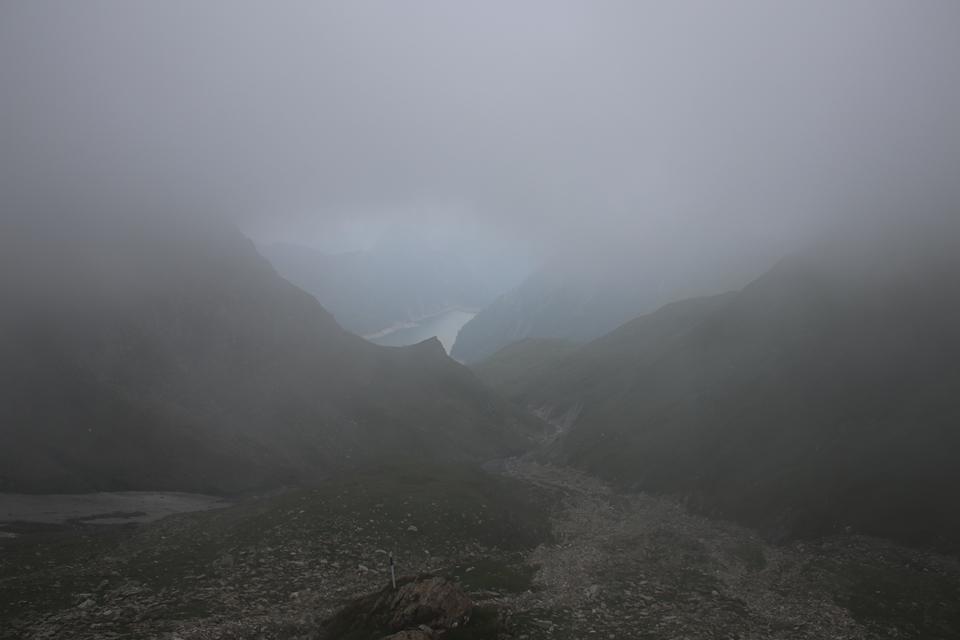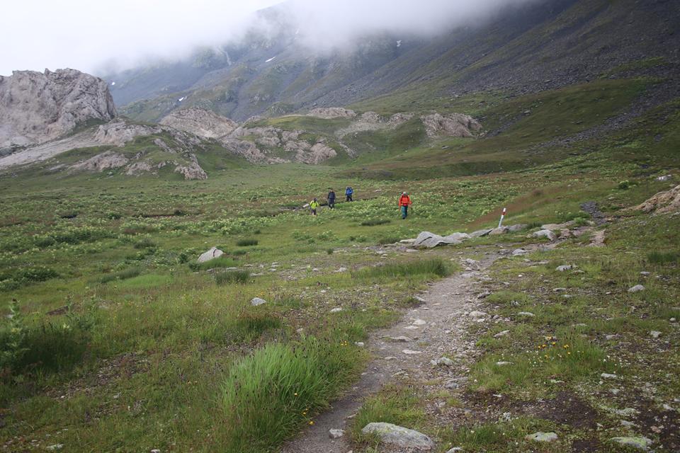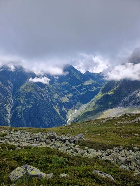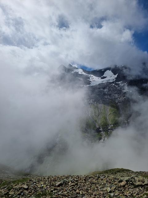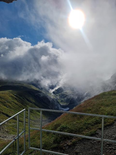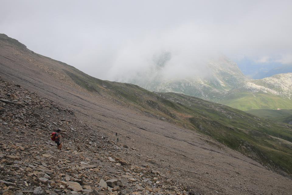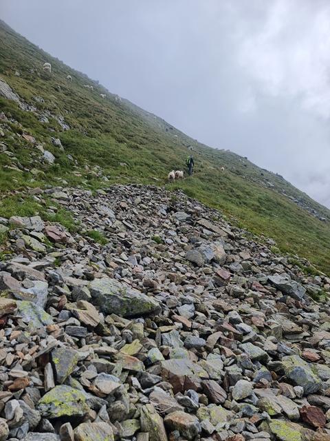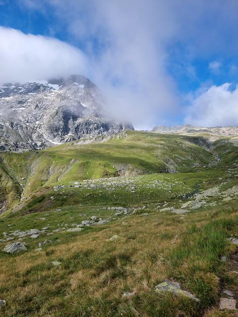 Ein Bild mit der Kamera gelingt noch, dann gebe ich auf. Nach 30 Minuten wird der Abstieg von gestern komplett eingesehen, die Wolken ein einziges Schauspiel, wo auch immer der Weg verläuft lässt sich nur erahnen. Wohl wenig begangen, da der Weg nicht immer ausgeprägt ist. Trotz der Niederschläge ist der Untergrund fest. Der weitere Steingesäumte Wegverlauf ist Anstrengend und kosten ihre Zeit. Ein Weidezaun wird erreicht Stuif öffnet und hält den Torgriff bis der letzte passiert. Wir nähern uns einem Naturstein Gebäude auf ca. 2300 m. Personen halten sich dort auf, ein Bach sichert die Wasserversorgung, das ist Voraussetzung für aller Leben. Plastik Stühle und ein Tisch, 2 Hunde begrüßen uns wohl freudig gestimmt in friedlicher Mission. Mittels einer Zeltplane ist direkt unter dem Dach eine große Zeltplane von 4x6 m gespannt, die von mehreren Stützen gehalten wird. Sicherlich 30 Große Kunststoff Transport Boxen sind darunter verteilt. Wohl die wichtigsten Gegenstände sind darin gelagert. Ein Blonder Langhaariger wie einst zu Hippi Zeiten grüßt Freundlich, überhaupt nicht Wortkarg schildert er seins Anwesenheit in der Alpinen Abgeschiedenheit. Er ist Senner und für 620 Schafe zuständig, die beiden Kinder 1+3 Jahre spielen im Wasser das nach dem Regen über die Wiese läuft. Wir sollen doch warten er geleitet uns ein Stück, schauen uns ein wenig um. Wohl sehr einfach auch das Gebäude ist schon in die Jahre gekommen, eine schlanke Schwarzhaarige Frau tritt aus dem Gebäude. 3 Monate betreuen sie die Tiere bei einem Monatlichen Saläre von 6500 Sfr. Sie ist Lehrerin derzeit im Mutterschutz, beide Leben in Karlsruhe , er ist Selbstständig und Baumpfleger.