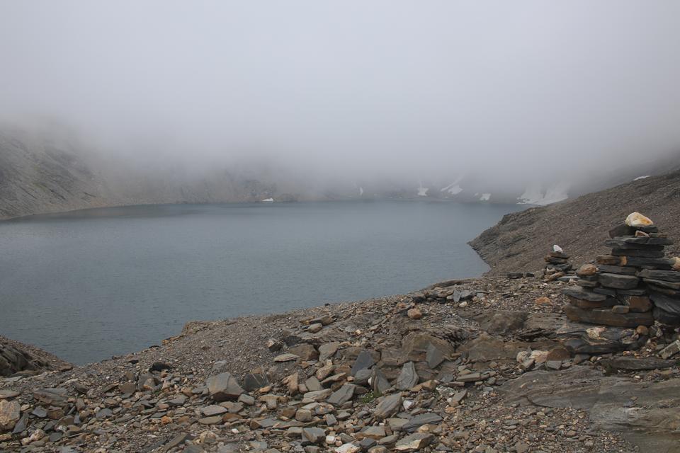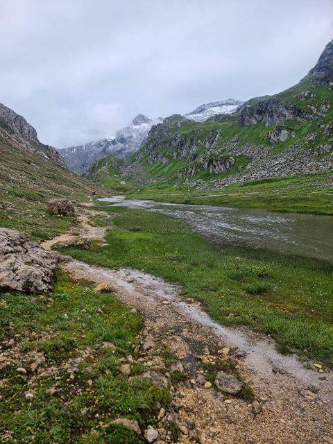 Humprey fällt trotzdem zurück. Aufstieg durch das Val Canal in Richtung der Wand des Piz Canal 2846 m. Es verengt sich, folgen dem Weg am Rinnsal der sich schlängelt. Später überschreiten wir einen Gletscherbach. Die Richtung wechselt leicht, spät lässt sich ein Kessel erkennen, Südlich wohl die Schwachstelle erstmal relativ geradlinig der Aufstieg der richtig fordert. Ein Paar begegnet, sie kommen vom See, aufgrund der Wetterlage verzichteten sie auf den Piz Terri. Ihr seid alsbald am See. Demnächst geht es links durch den Schotterhang schaut aus der Perspektive spannend aus. Endlich kommt der Körper auf Touren. Kurzer Halt am Beginn der Querung unter dem Piz Ner 2766 m, die Perspektive war wie immer eine Täuschung. Unterhalte mich mit Olaf, Stuif und WPO sind etwas zurück, Humprey benötigt eine Pause. Der Wind nimmt zu, sind an der Wolken Untergrenze, das Wetter zieht von Süden auf. Ein kurzer Anstieg um 11.08 Uhr, der Laghet la Greina 2582 m. liegt ein paar Meter tiefer. Der Wind wiegt das Wasser auf Die Wolken schweben über dem See. Öffne die DAV App, der Weg verläuft rechts des See relativ geradlinig Richtung Piz Terri. Es ist Unangenehm hier, der Wind pfeift ungebremst und Kühl. Als Stuif kommt gehen wir langsam weiter. Bei Gutem Wetter ein Platz zum Verweilen. Kleinere Schneefelder reichen vom Hang bis zum Wasser. Am Ende des See steht ein großer Steinmann, die Hände kalt die Nase tröpfelt, Zeit zum Wechseln der Hose.
