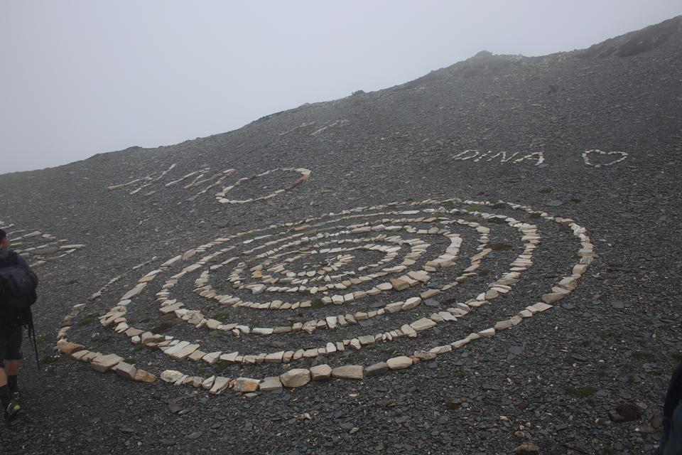 Die Überlegung ob wir bis zum Terri aufsteigen ist absolut berechtigt, die Sicht geht etwas höher gegen Null. Längeres Warten bis wir komplett sind. Bock auf eine längere Pause liegt nicht vor. Kurz einen Snack Riegel oder ähnliches. Der Aufstieg erfolgt nicht durch die Rinne, sondern über den Hang in den Steinen, steil aber gut zu gehen. An einem Hang Symbole und Schriften mit Steinen erstellt worden. Querung bis in etwa der Wegteilung, Aufstieg oder nicht? Es wären noch 400 Hm, die Entscheidung ist schnell gefallen. Abstieg. Es ist 12 Uhr, 1 Std. für den Abstieg. Stuif navigiert mit der Uhr, der Weg zur Motterascio verläuft Rechts. Es Bedarf einer Querung bis der gut Markierte Weg erreicht wird, Wohl viel begangen dieser Aussichtsberg, ja wenn die Sicht passt. Stein gesäumt etwas steil aber gut zu gehen Westlich. Auch Stangen als Markierung. Leider fehlt die Sicht in die Tiefe. Deutlich wird Höhe abgegeben, der Wind lässt nach die Temperatur steigt. Lose der Untergrund, ein Steinbruch par exzellent . Die Wolken Grenze wird erreicht, die Sicht öffnet sich, tief unten Südlich ist der Lago di Luzzone erkennbar, wenig später ist der Spuk vorbei. Knochen Reste eines Tieres, die Wirbel lassen auf eine Gämse deuten. Stuif schlägt vor eine Vesperpause über einem Bach einzulegen.