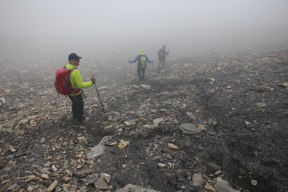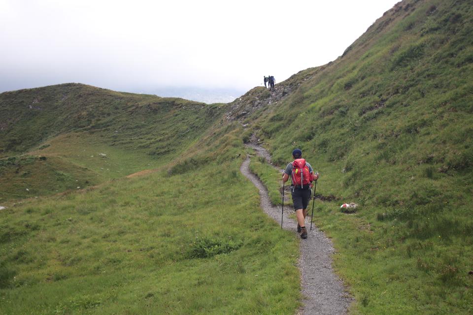 Sonntag 20.Juli: Trotz des geöffneten Fenster war es recht warm im oberen Bett, klar die Kaltluft fällt nach unten, so mancher war in der Nacht auf der Toilette. Sehr Früh verlassen die ersten den Raum. Frage nach der Uhr Zeit es ist 6.20 Uhr, Olaf und WPO stehen auf. Worte werde gewechselt, die Blase drückt ein wenig, es ging auch schon wie die Nacht davor ohne aufzustehen. Mit Humprey und Stuif beginnt der Trübe Tag um 7.15 Uhr, das Bett als erstes richten. Der Rucksack und die Plastik Box bleiben nicht zurück. Das wird wohl nichts mit einem Gipfel. Es ist die normale Zeit bei solchen Touren aufzustehen. 15 Personen halten sich verteilt im Beleuchteten Nebenzimmer, beim Frühstück auf. Frisch und Feucht bei leichtem Wind, nach unten ist die Sicht ganz leicht eingeschränkt. Kärglich das Buffet. Brot Marmelade und Honig im Glas kleiner Butter, weder Wurst noch Käse, Dezente Unterhaltung die sich als sehr laut empfinden. Kaffee Tee Wasser. Die Frage von Humprey, wie schaut es heute aus. Gute Frage, ohne Gipfel sind es 2 ½ Std. Gehzeit. Gemeinsam schauen wir am Tablet der Hütte die Meteo Daten, um 12 Uhr, zieht eine Störung auf. Frage ob die Route zum Piz Greina Markiert ist, hier steht wohl eine Weg Tafel. Mein Vorschlag Tour zur Terri Hütte, dort Mittags Pause und danach weiter zur Scaletta Hütte. 8.35 Uhr, versammeln wir uns im Schuhraum, kurzes Textil ist heute für mich zumindest passe, WPO und Olaf sehen das ein bisschen anders. Wenig später sind wir zum Abmarsch bei leichtem Wind bereit.