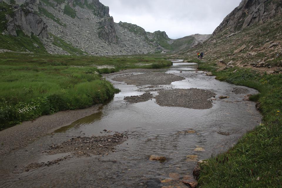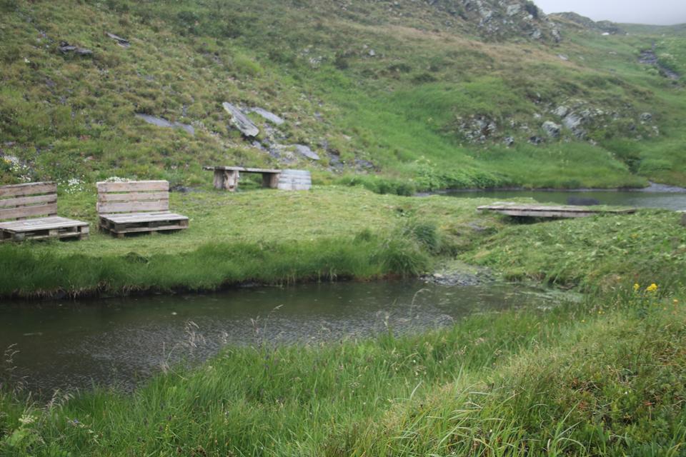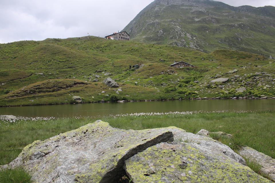 Interessant wie sich wohl diese Landschaft so bilden konnte. Der Weg verläuft Nördlich am Fuße der Bergkette etwas über der Ebene. Personen begegnen. Wenig Höhenversatz. Von Oben zeigt sich die Wildheit, ein Wasserlauf schlängelt sich durch die Landschaft, zu beiden Seiten ist das Gras deutlich Dunkler. Eine Jungtiere sind gar nicht scheu, versperren uns den Weg, Olaf streichelt ein Tier am Haupt. Eine mit Kette versicherte Passage, locker weiter bis auf 2265 m, hier geht es in die Carpet la Greina. Die Terri Hütte ist noch nicht sichtbar. Der Bach verläuft rechts des Weges. Als Stuif die Hütte sieht, legt er einen Stopp ein, hier könnten wir doch Vespern. Es ist kurz vor 11 Uhr, eine kurze Vesperpause im Grünen. Der Untergrund gar nicht so kalt. Währen WPO aus dem vollen schöpft, Essen wir Spartaner. Der Abstieg zieht sich noch einige Minuten hin. Ein Bild hinter dem in der Senke liegenden See, im Hintergrund steht oben auf dem Absatz die Hütte.