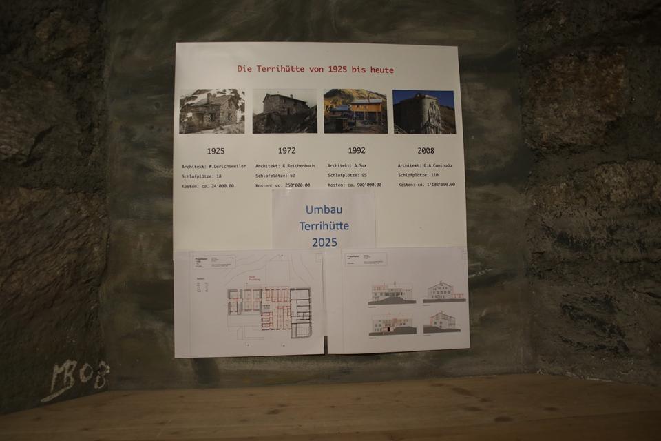 Ablegen des Rucksacks, die Freundin kommt ihm in Sause Schritt entgegen. Es ist 15.35 Uhr. Ziemlich genau 3 Std. Aufstieg. Gleich daneben fließt ein kleiner Bach aus Richtung der Hütte kommend. Mit einer Magnesium Tablette wird das Wasser angereicht. Abkühlen der Füße wenn auch nur kurz möglich, sowie ein Apfel. Das Funktion Shirt und T-Shirt ablegen zum Trocknen. Ausgerechnet jetzt versteckt sich die Sonne. Bisschen Dösen, lästig dabei die Fliegen und der Geräuschpegel des Baches, Zwei Personen die von hier aufgestiegen sind, erreichen die Kuppe wo Stuif zu sehen war, hier legten wir die Rast ein. 1 Paar begegnet mit Kletterschuhe, denke da sofort an Bodo. Wohl auch Olaf ist kurz weggenickt. Als Humprey und WPO erscheinen ist mein Wasservorrat aufgetankt. Die Höhe zeigt sich daran, sobald eine Wolke die Sonne verdeckt fühlt es sich kühl an. Stuif startet als erstes, verweilen noch. Ein Heli fliegt zur Terri wenig später zurück. Beim zweiten Flug hängt ein Lastensack am Seil. Später erhalte ich auf die Frage, das drei Arbeiter zu Tal geflogen worden sind. Wegteilung kurz unter der Hütte, in Verlängerung geht’s zur Motterascio. Ein kleiner See etwas tiefer wird sichtbar. Letzte Schneereste liegen noch auf der Nordseite unter dem Muot la Greina. Einige Gäste verweilen vor oder nahe der Hütte an den Garnituren. Es ist 17.12 Uhr. Die Terri Hütte liegt auf 2170 m. Auf dem Dach wurde mit Kupfer Saniert das in der Sonne reflektiert. Links an der Fassade und auf dem Dach steht ein Stahl Gerüst. Gelassene Stimmung Rund um den Holz Brunnen, Stuif sitzt vor einem Kuchen und Radler. Lawinen sicher steht das Naturstein Gebäude auf einem Rücken. Auffällig die Rot Weiße Eingangstüre, durch die wir wenig später schreiten, Setzen uns an den Tisch, Stuif weist den Weg, stellen im Vorraum wo auch die Schuhe geparkt werden, den Rucksack ab. Das Lager ist im OG. Unterhalte mich mit dem Paar, sie verdient 3900 Sfr. im Monat. Im Prinzip benötigt Sie kein Geld. Wie sich aus der Homepage erfahren lässt stehen Hüttenschuhe bereit. Kühl im inneren Geräumig fast verschwenderisch das Platz Angebot. Modern die Gaststube Hell die Wände und Decke, gr. Küche, das sich derzeit im Umbau befindende Obere Stock ist etwas verwinkelt, schmal der Gang, klein die Lager, 2 Doppelstock Betten eine Leiter führt nach Oben. Hier hatte sich Stuif einquartiert, in einem kleinen Abstellraum auf dem Gang, stellen wir die Rucksäcke ab. Körbe stehen bereit, Persönliches wird in diesen gelegt. Schreibe im Freien über den Verlauf nach der Ankunft am Parkplatz. Wechseln an den Windgeschützten Tisch direkt neben dem Eingang.