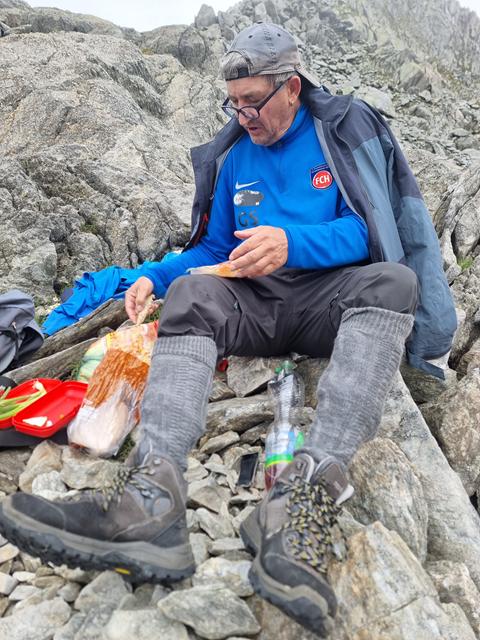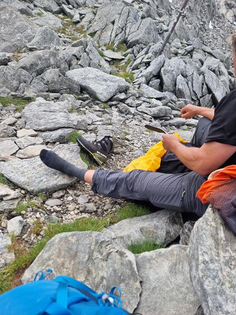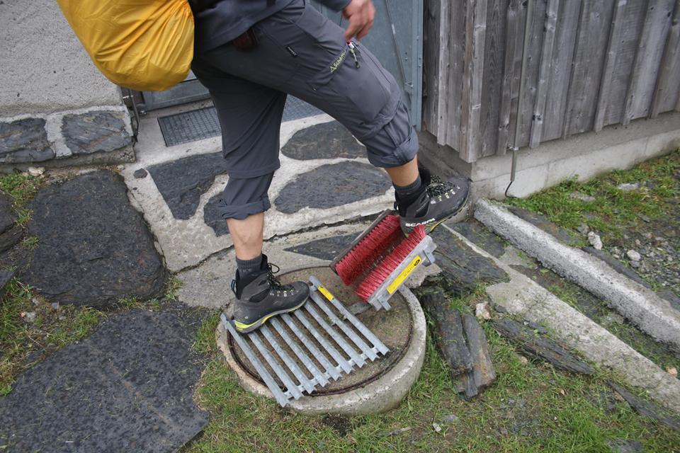 Dienstag 22.Juli: Unvermeidbar in der Nacht aufstehen zu müssen, die Bewegungsmelder reagieren sofort. 6 Uhr, es ist schon Hell, doch zum aufstehen noch zu Früh. 7 Uhr, Stuif bricht das Schweigen, Warte bis es Platz gibt. WPO reicht mir die Hülle für den Hüttenschlafsack. Ein Blick aus dem Fenster enttäuscht nicht, Dunst zieht vom Tal nach Oben. Das Exit Schild über der Türe stammt wohl noch vor dem Umbau. 2/3 der Gäste sitzen schon beim Frühstück, es ist sehr ruhig. Kaffee Milch Tee Beutel Selbstgebackenes Brot Butter Honig. Der Hund eines Gast weilte in der Nacht im Eingang, freut sich als ich an ihm auf dem Weg ins Frei vorbei gehe. Leichter Wind etwas kühl. Der heutige Tag wird wohl trocken bleiben. Milch mit Kaba dazu ein Honig Brot. Olaf und Müsli das passt. Kurz nach 8 Uhr, sind wir allein beim Frühstücken. Olaf spricht mit dem Personal, Vegan oder Vegetarier alles wird berücksichtig, gestern hatten 11 Personen Vegetarisch Vorbestellt, deshalb dieses Abendessen der einfach halber ein Mahl für alle. Nachdem wir den Tisch abräumten, wischt Stuif diesen.